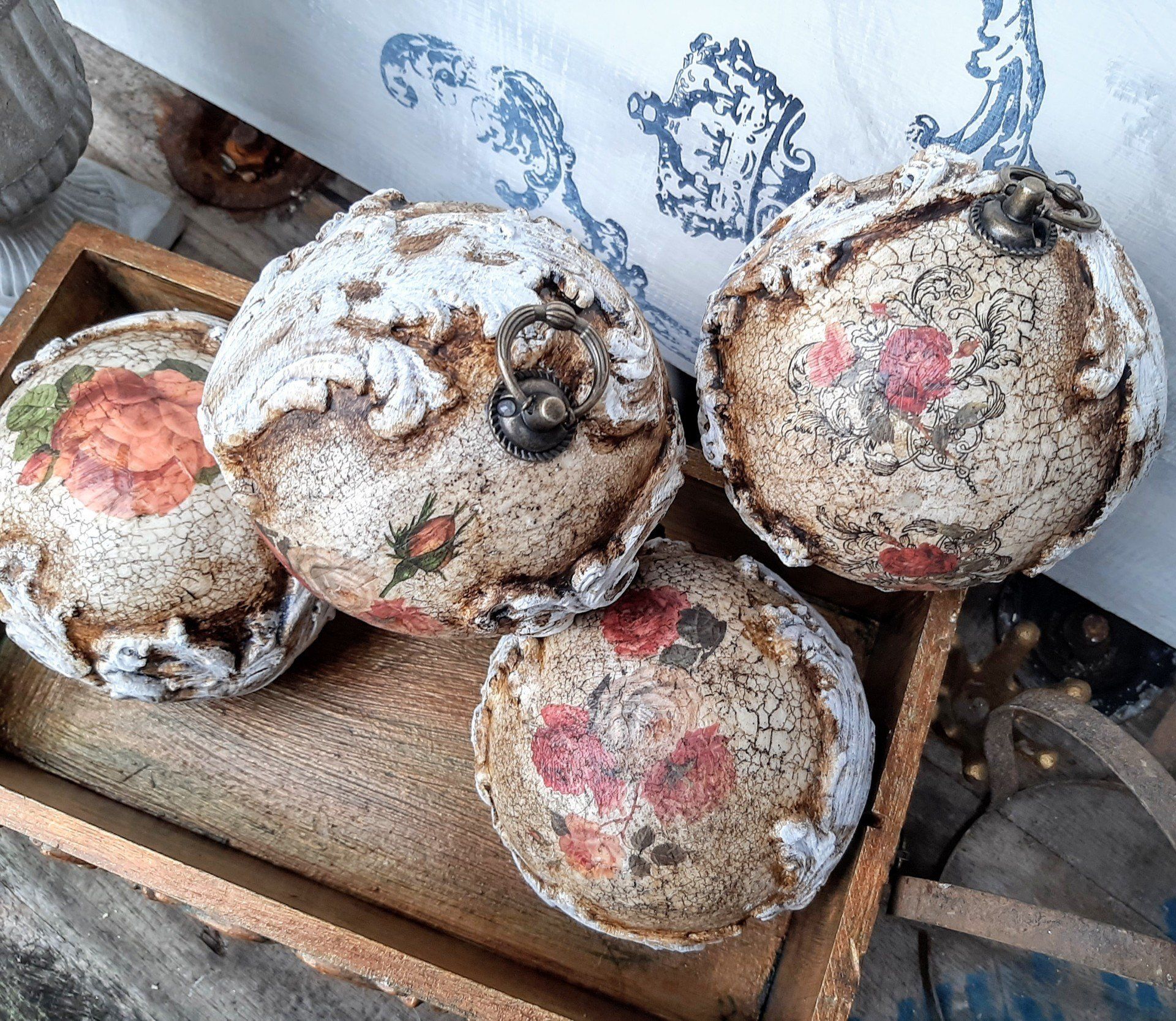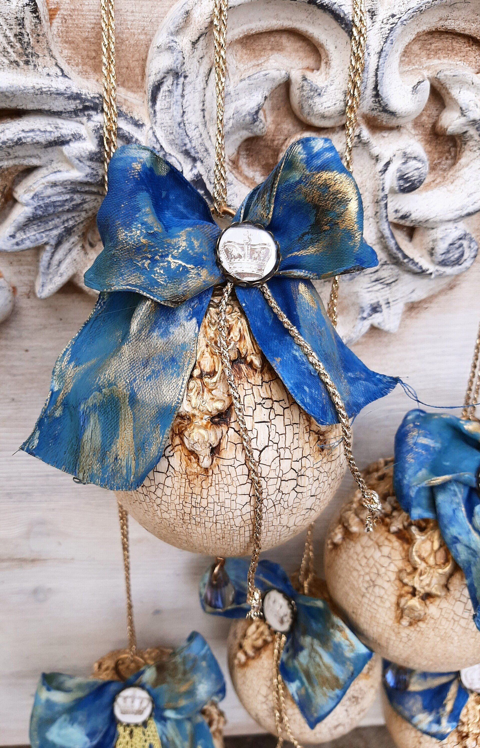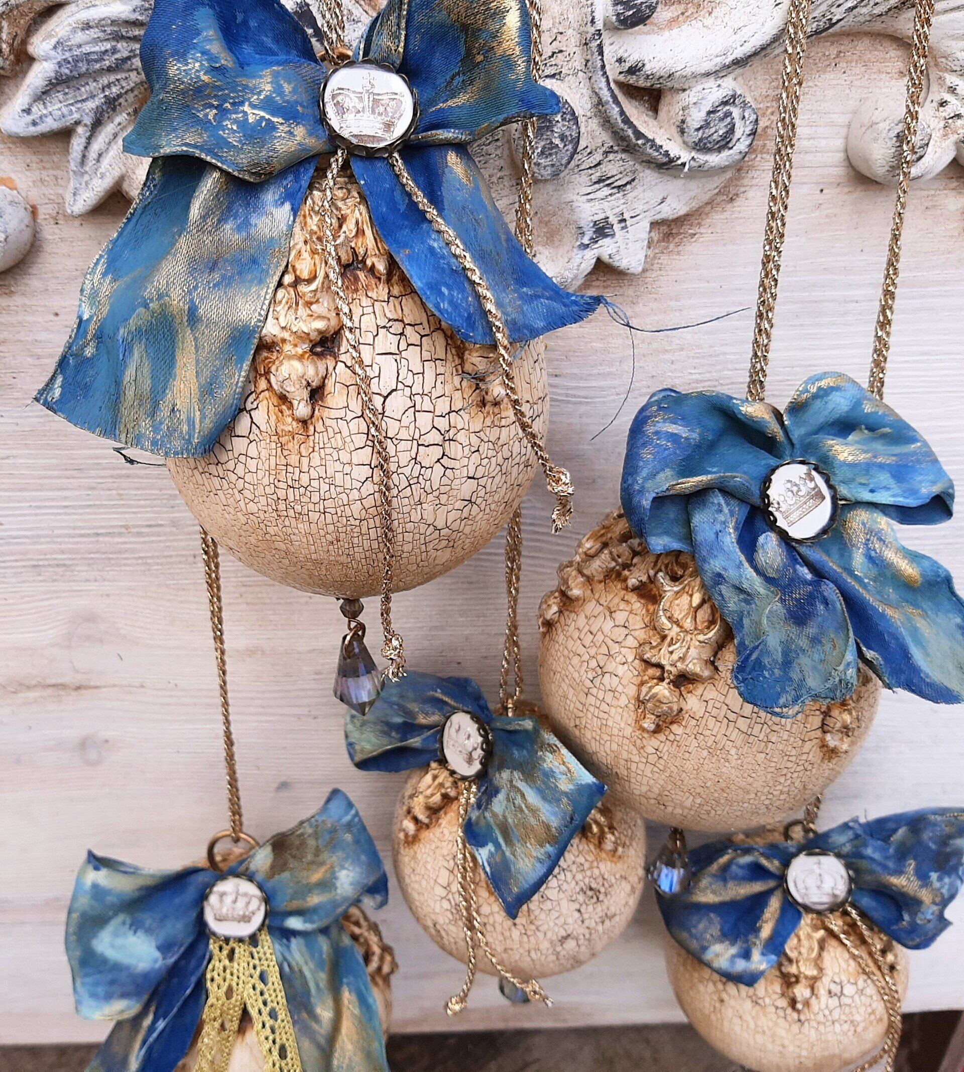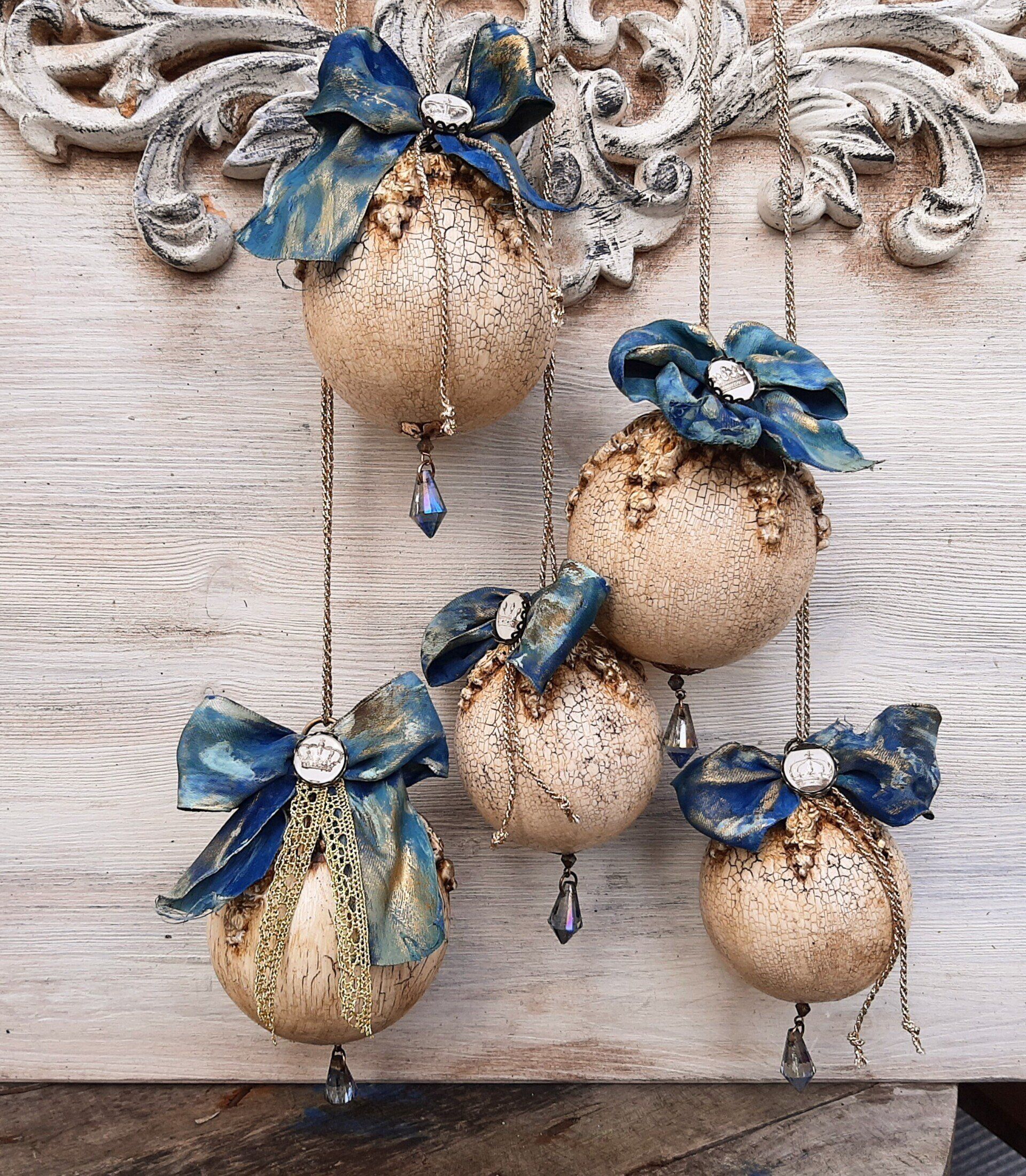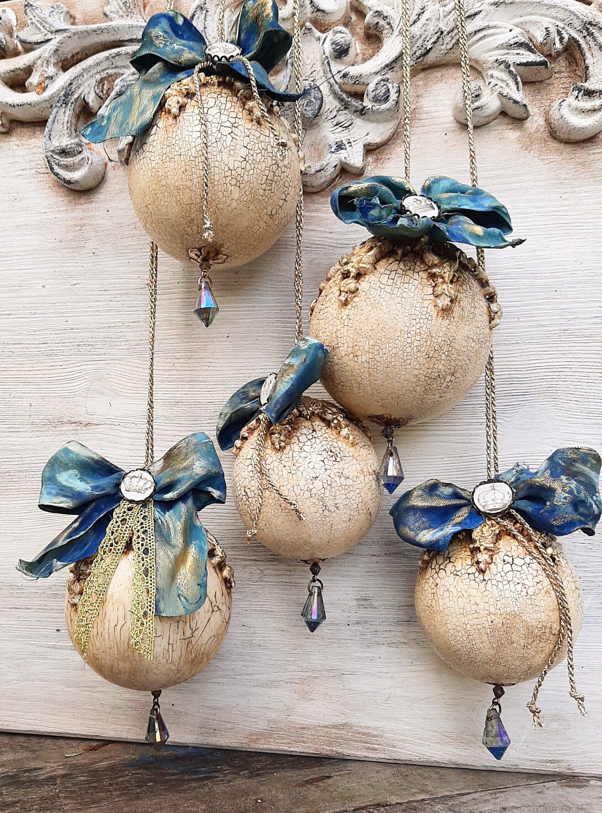 Vintage Kugeln und Glocken, aufwändig gestaltet. Kugeln ca. 10cm ....je 9,50€, ca.8cm je8,50€, Glocken ca. 12cm je 15,-€ auf Anfrage - - - Ein Anleitungsvideo gibt es in der Rubrik "Bastelanleitungen/ Videos"