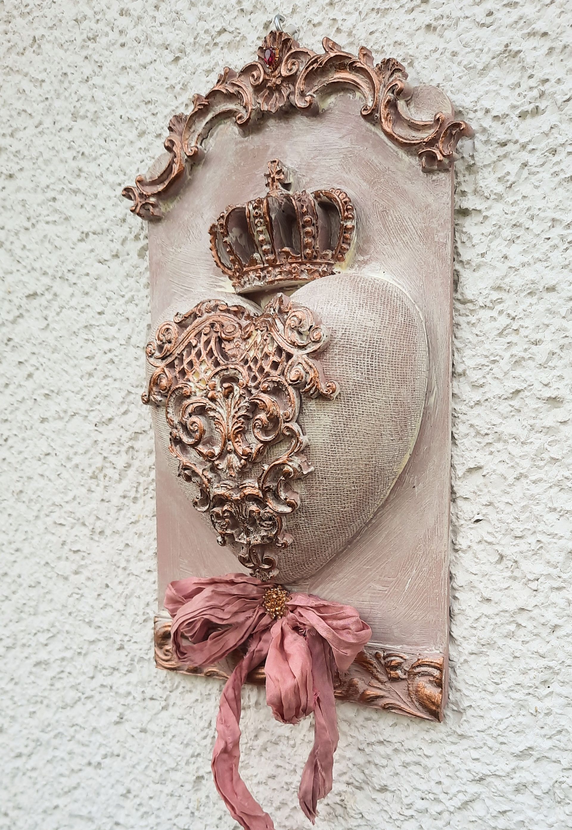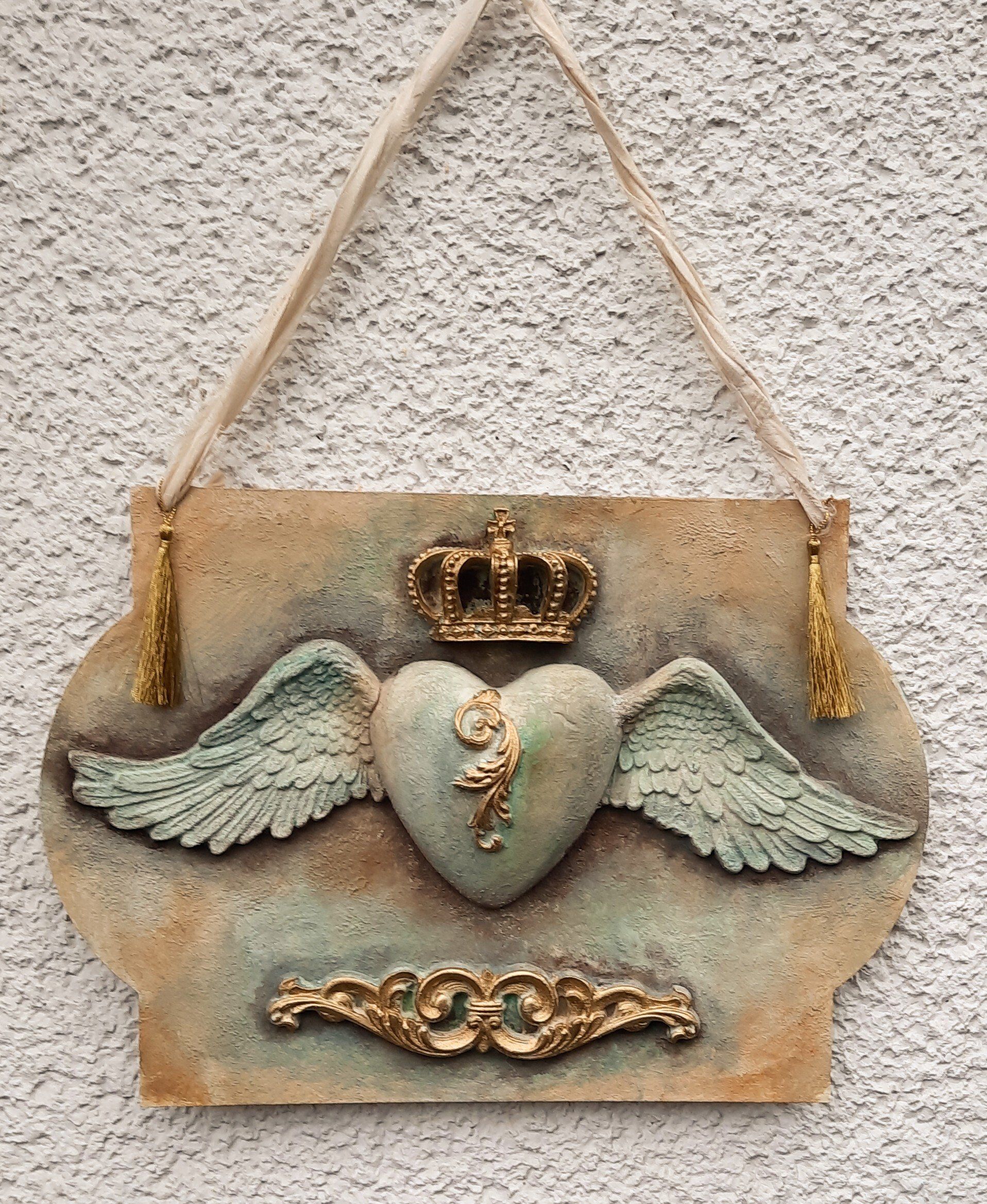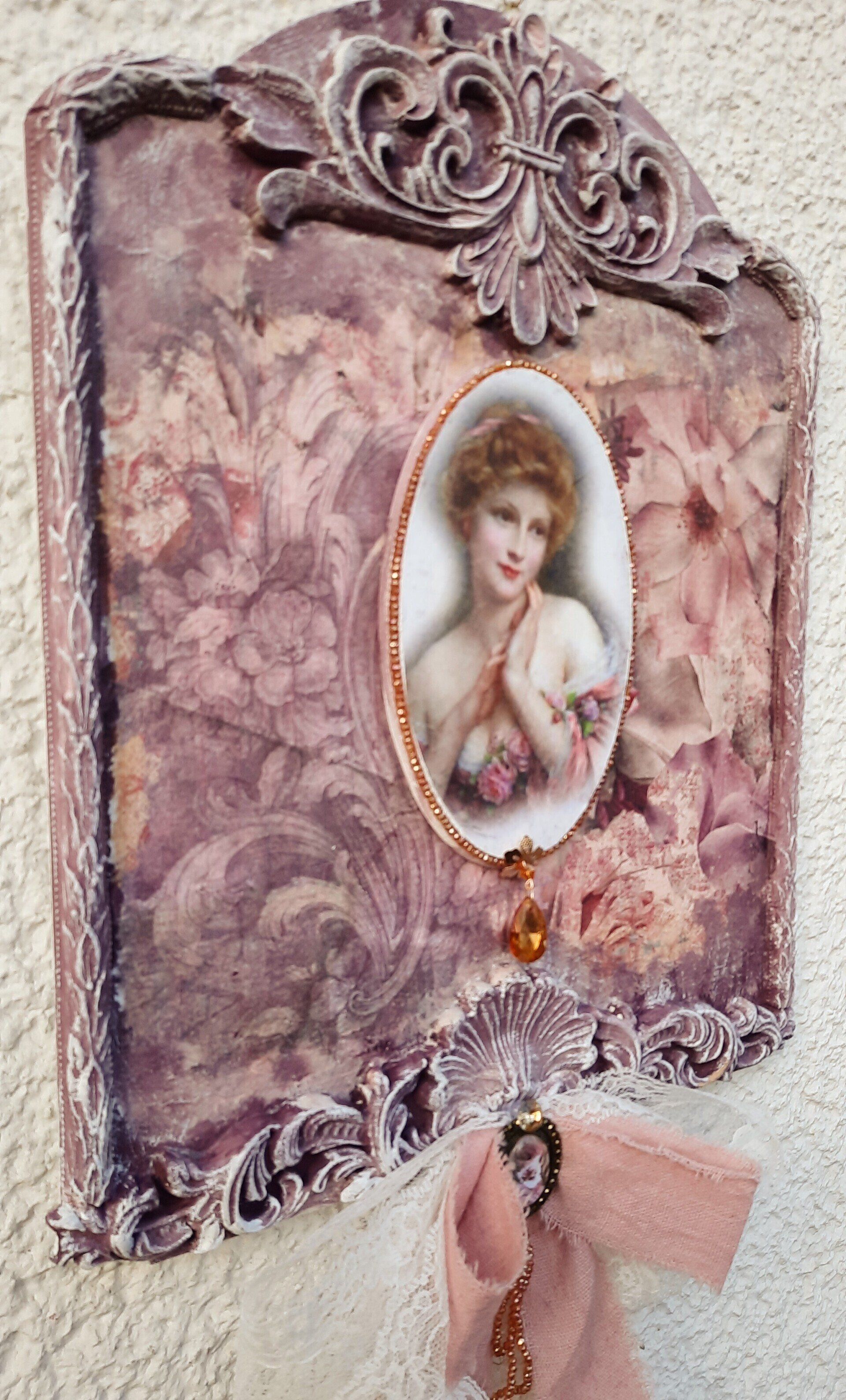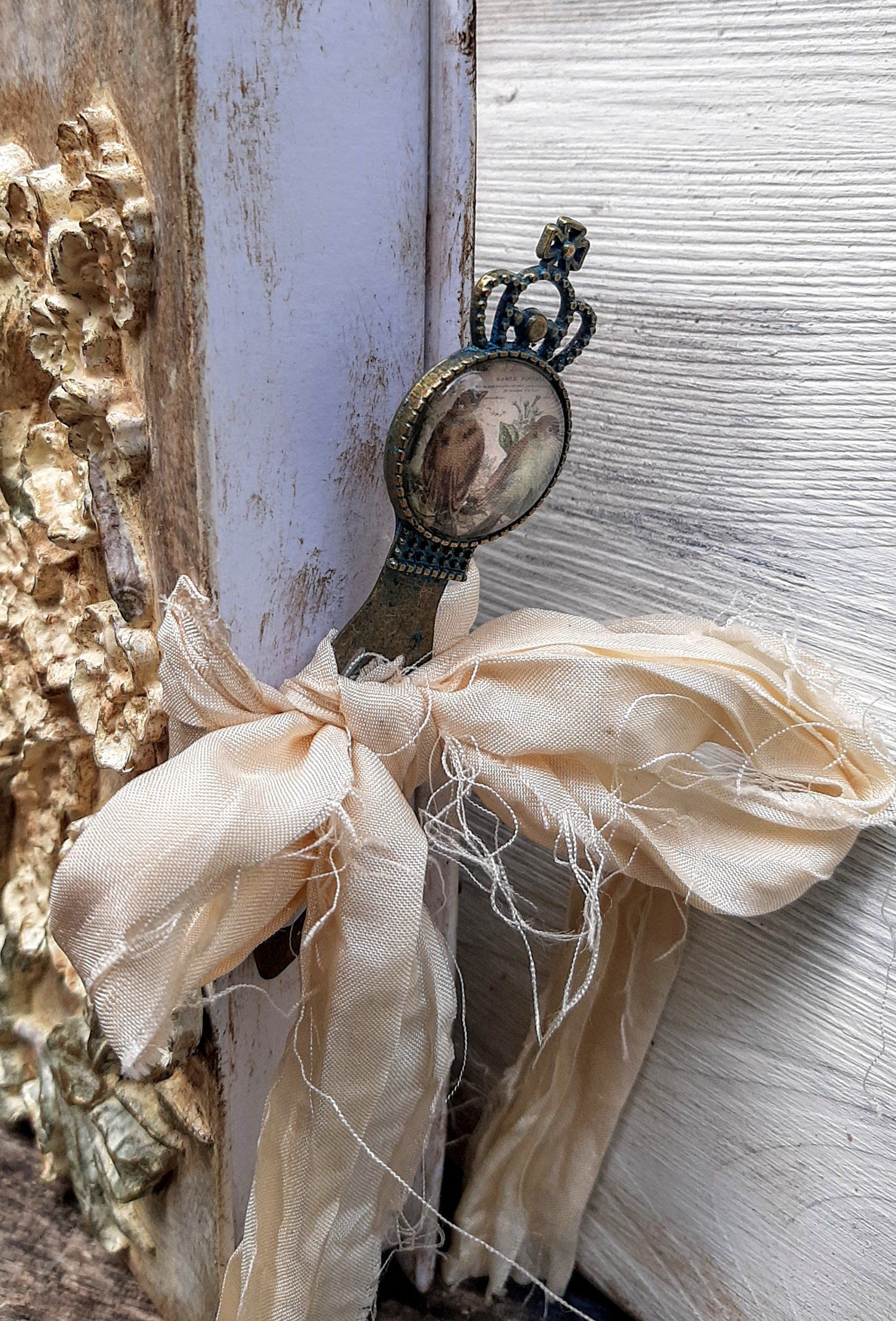 Wunderschöner Wandhänger, aufwändig gestaltet im MixedMedia - Vintage Look. Komplett ca. 52cm lang - - - 25,-€ auf Anftage -Ein Anleitungsvideo gibt es in der Rubrik "Bastelanleitungen/Videos"