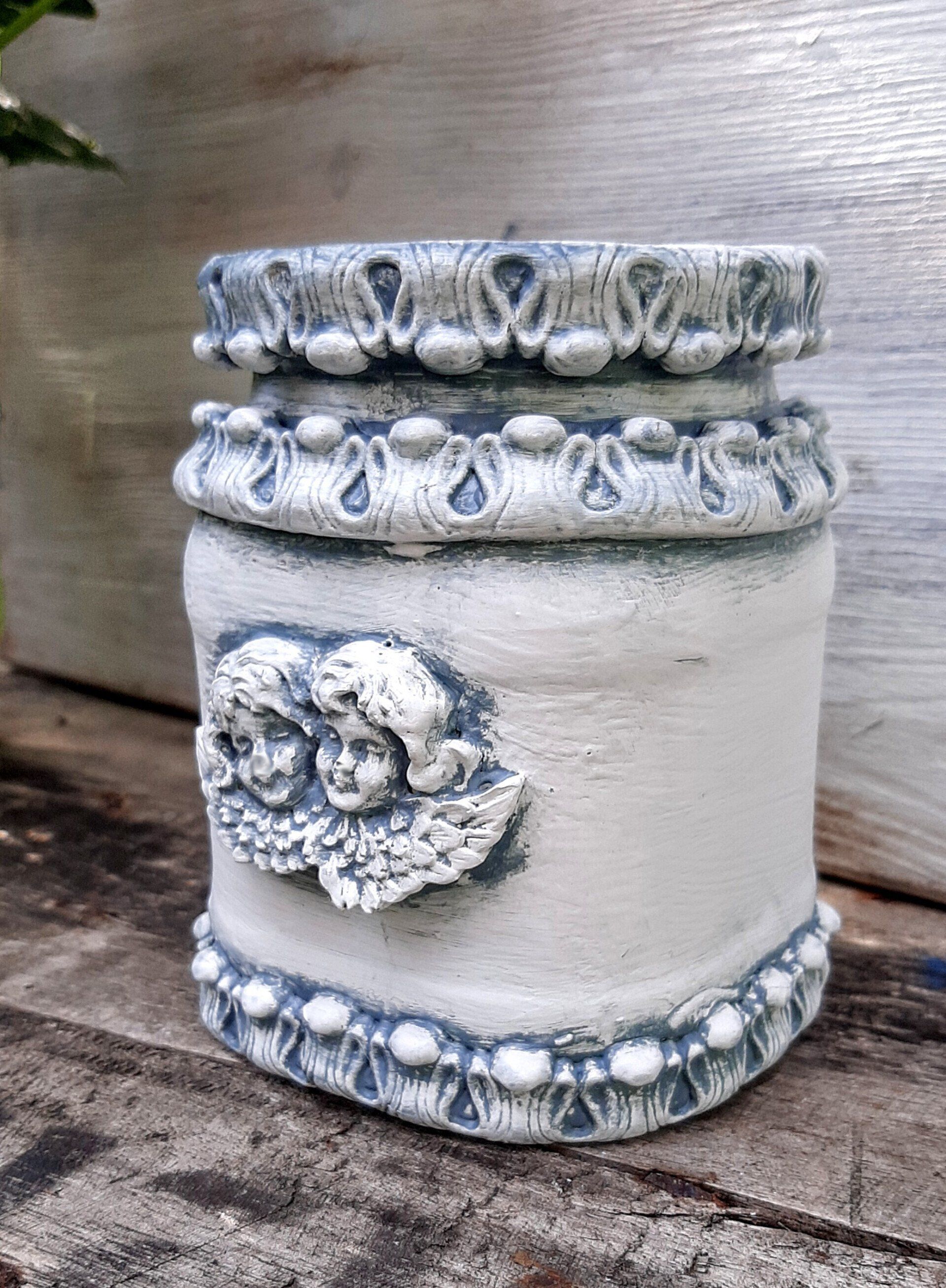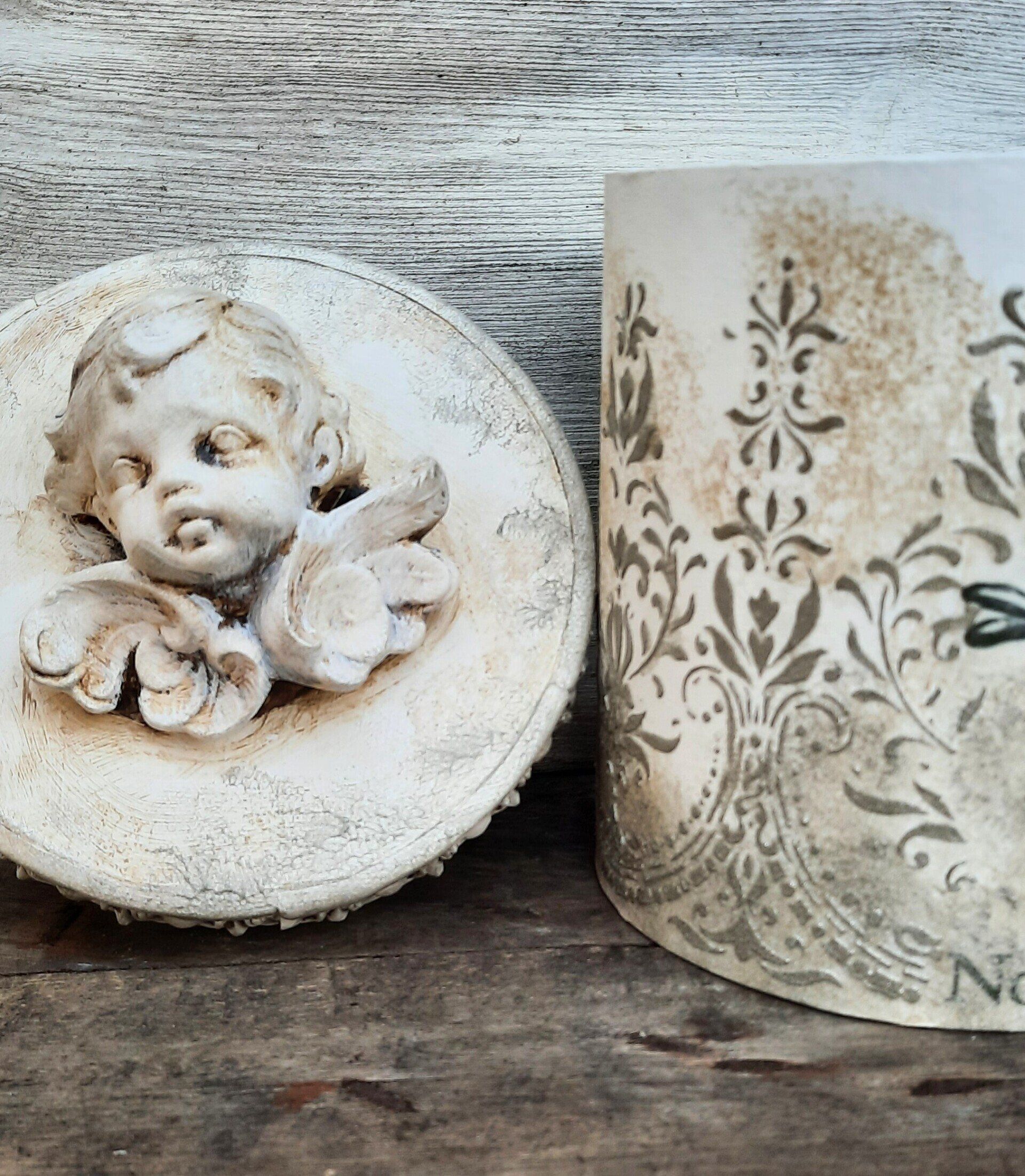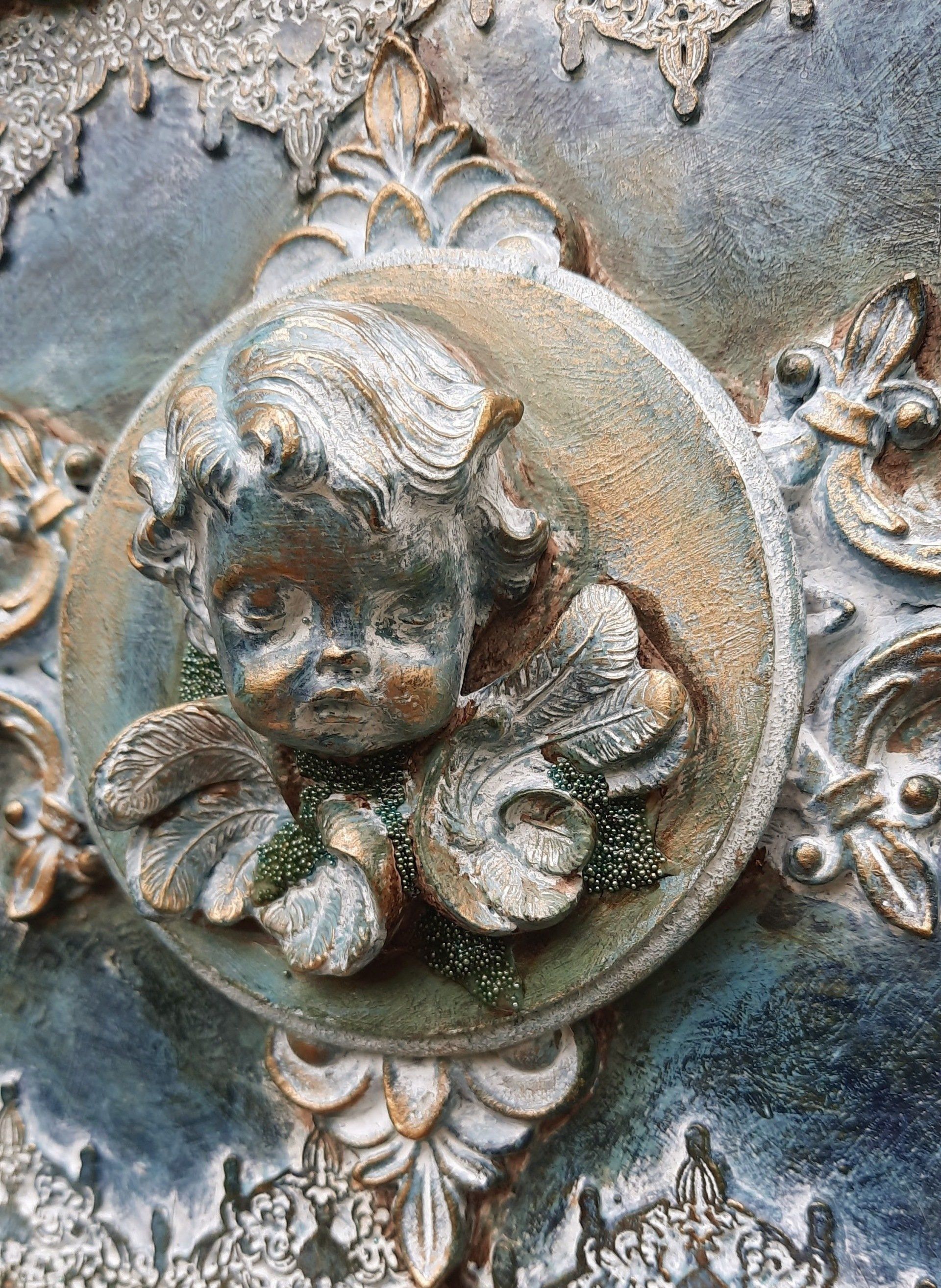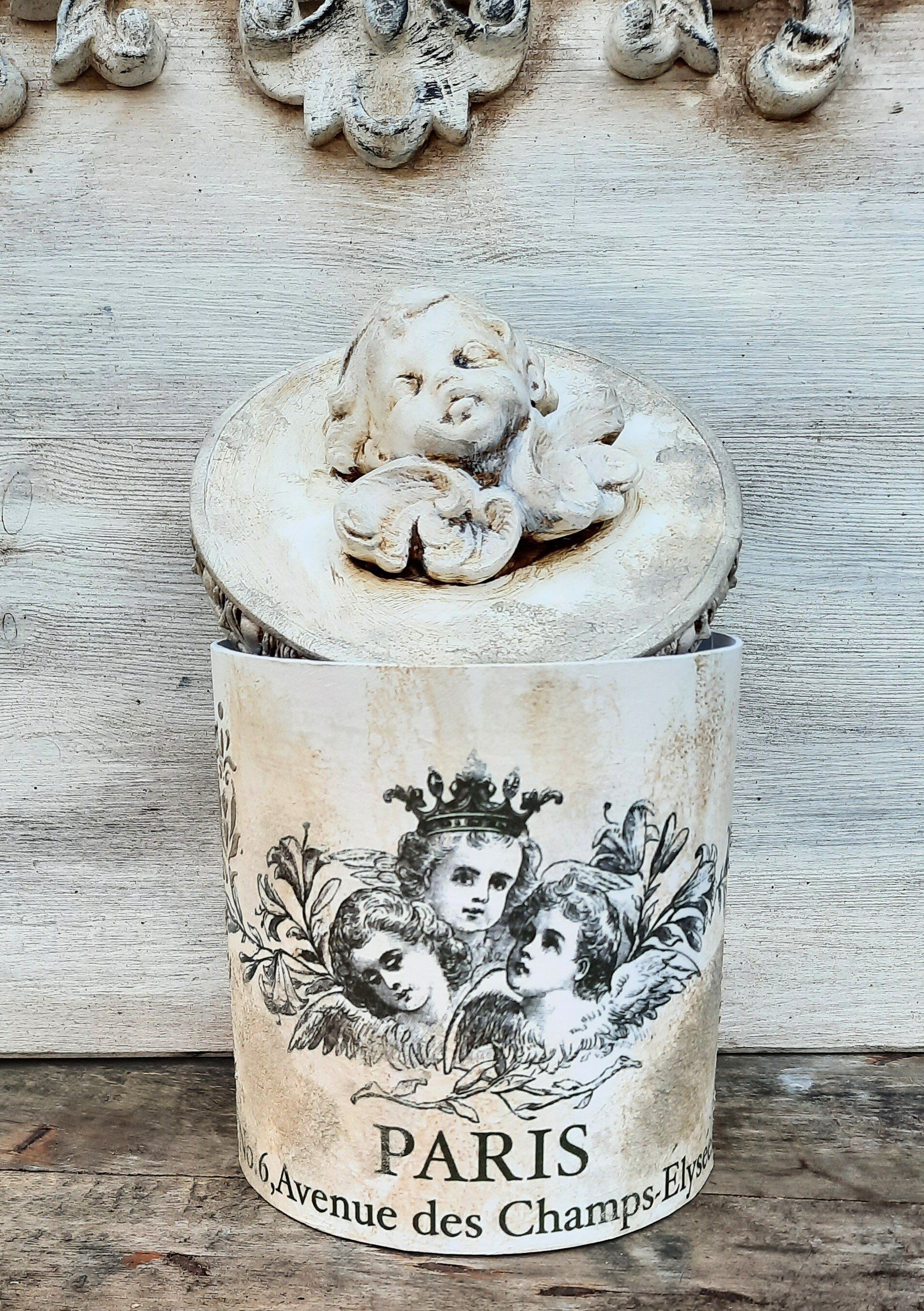 Barocke Engeldosen im sshabby-vintage Look. Mit erlesenen papieren, Farben und Pasten gestaltet, der Puttenkopf ist aus gebranntem Ton..... je ca. 21cm hoch, 16cm DM - je 21,50€ auf Anfrage