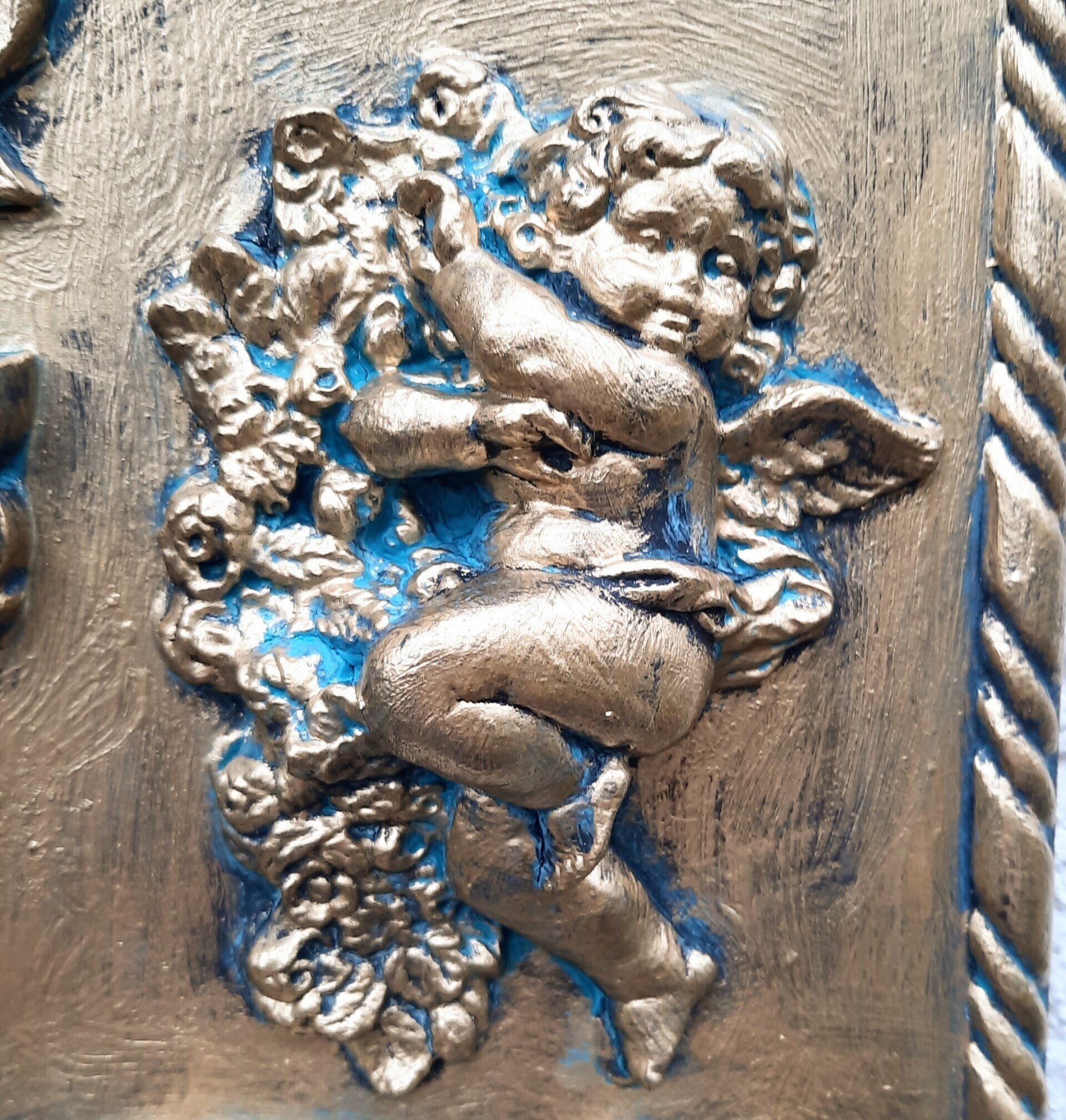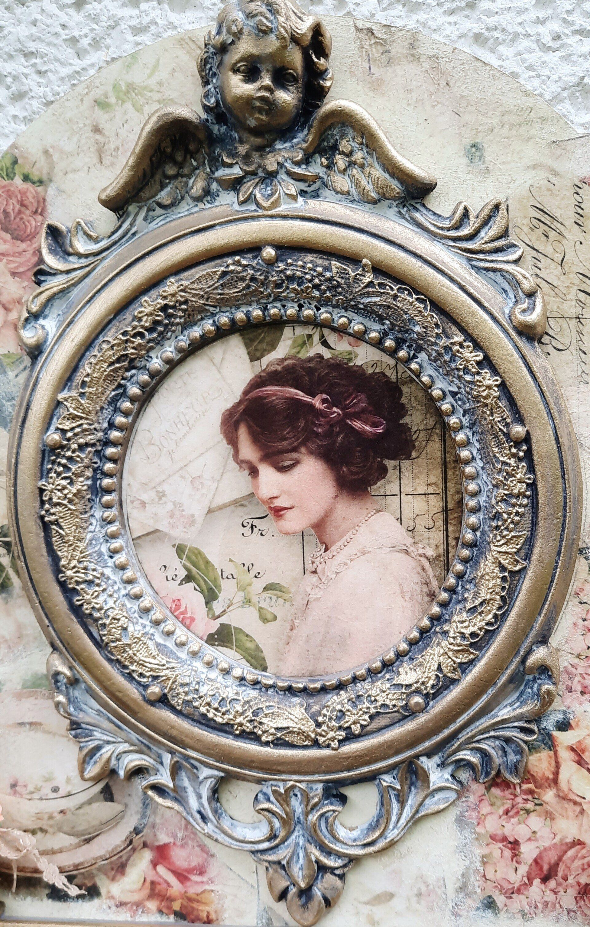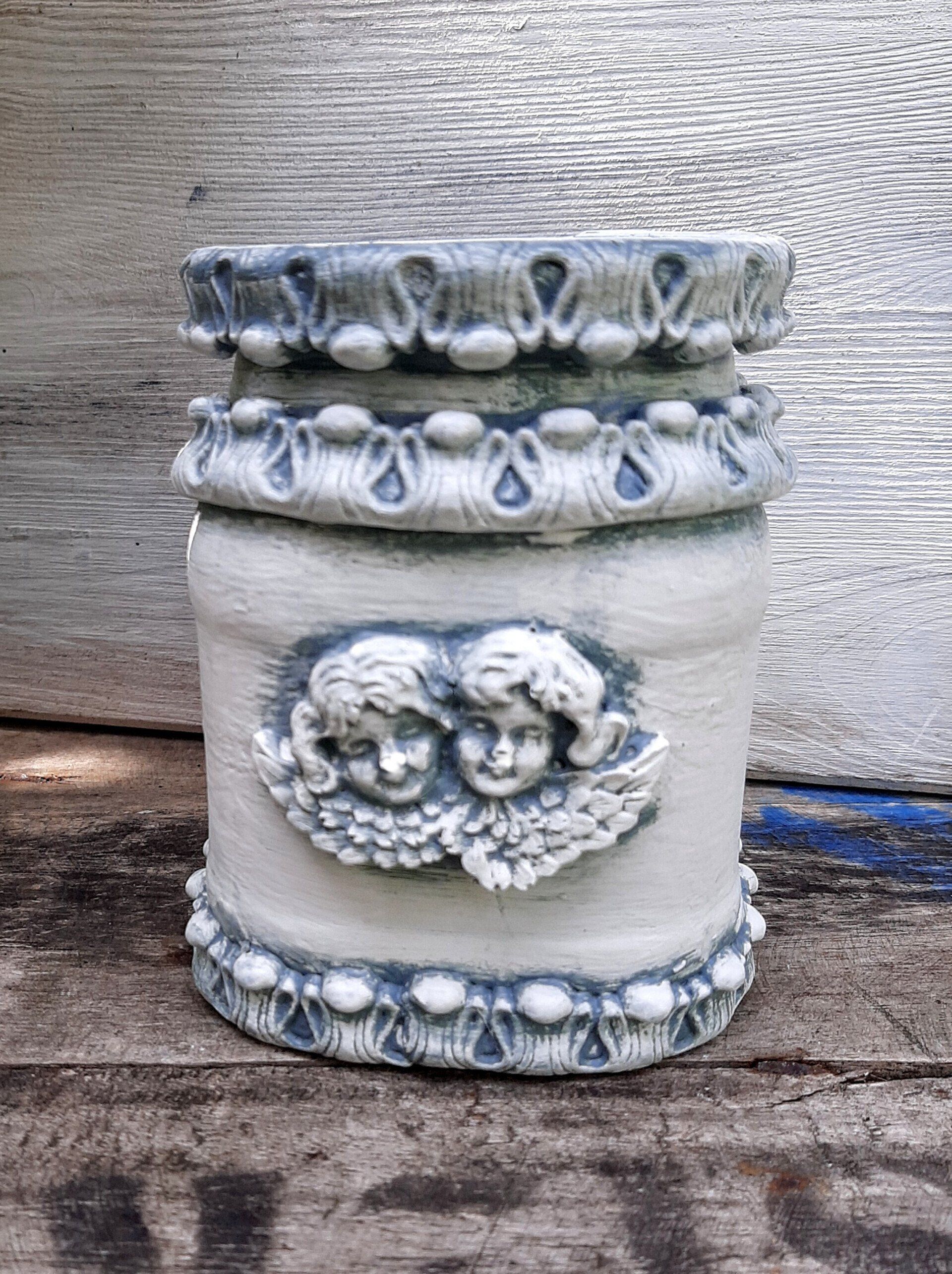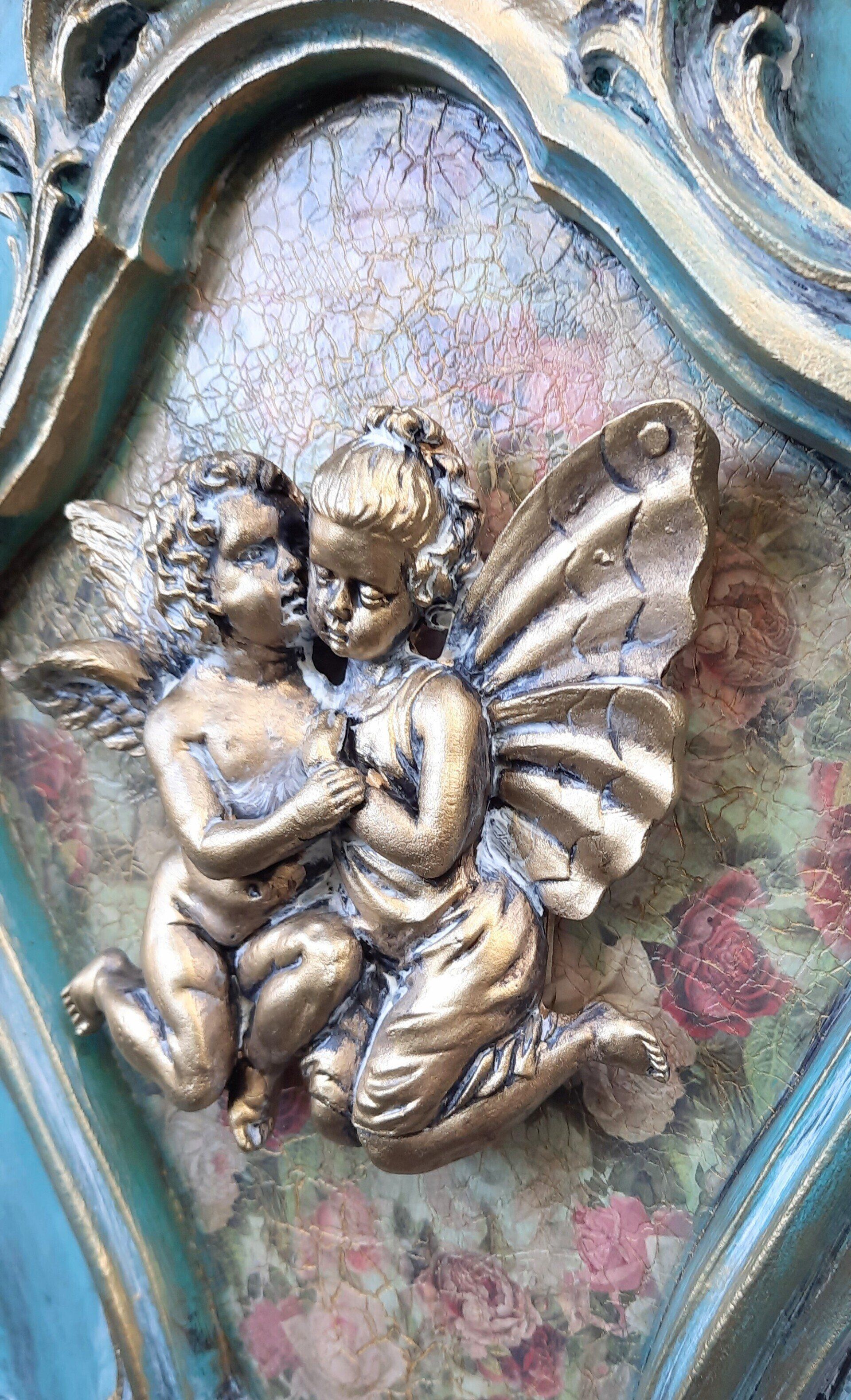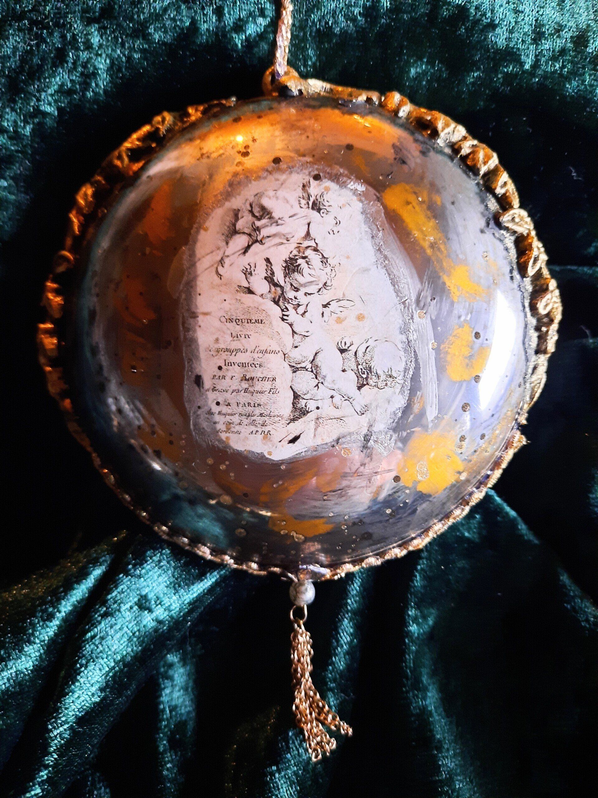 Barocke Engeldosen im sshabby-vintage Look. Mit erlesenen papieren, Farben und Pasten gestaltet, der Puttenkopf ist aus gebranntem Ton..... je ca. 21cm hoch, 16cm DM - je 21,50€ auf Anfrage
