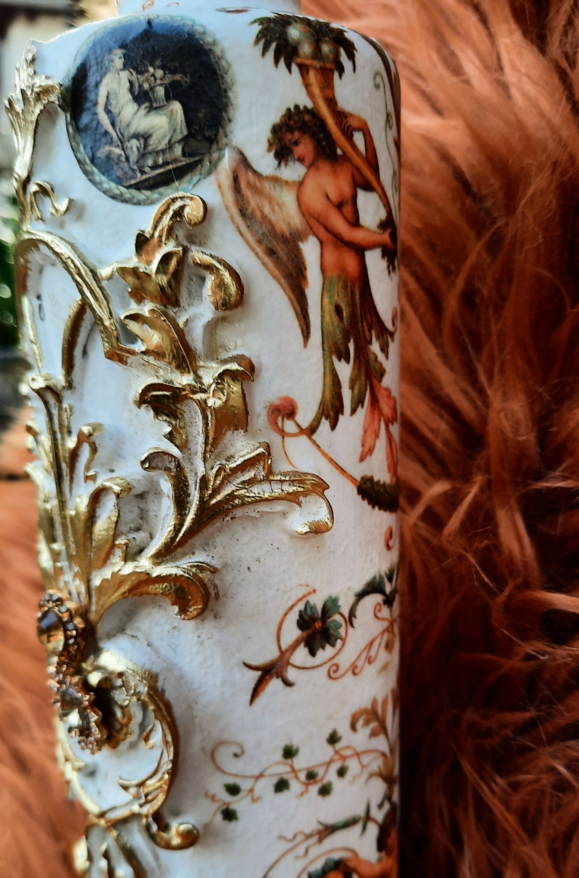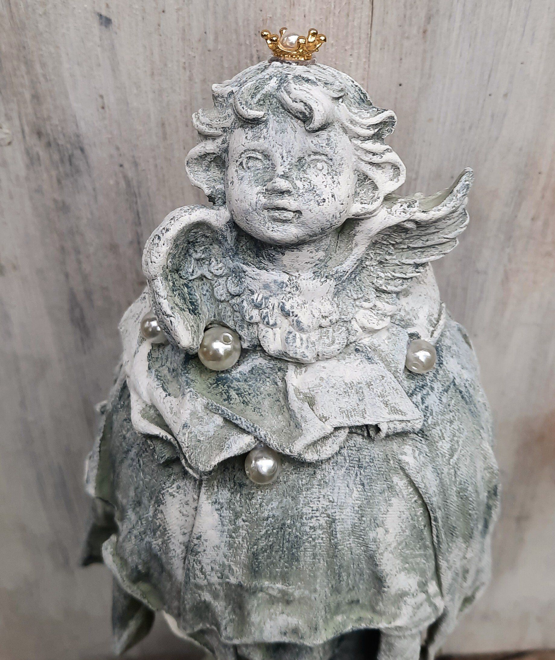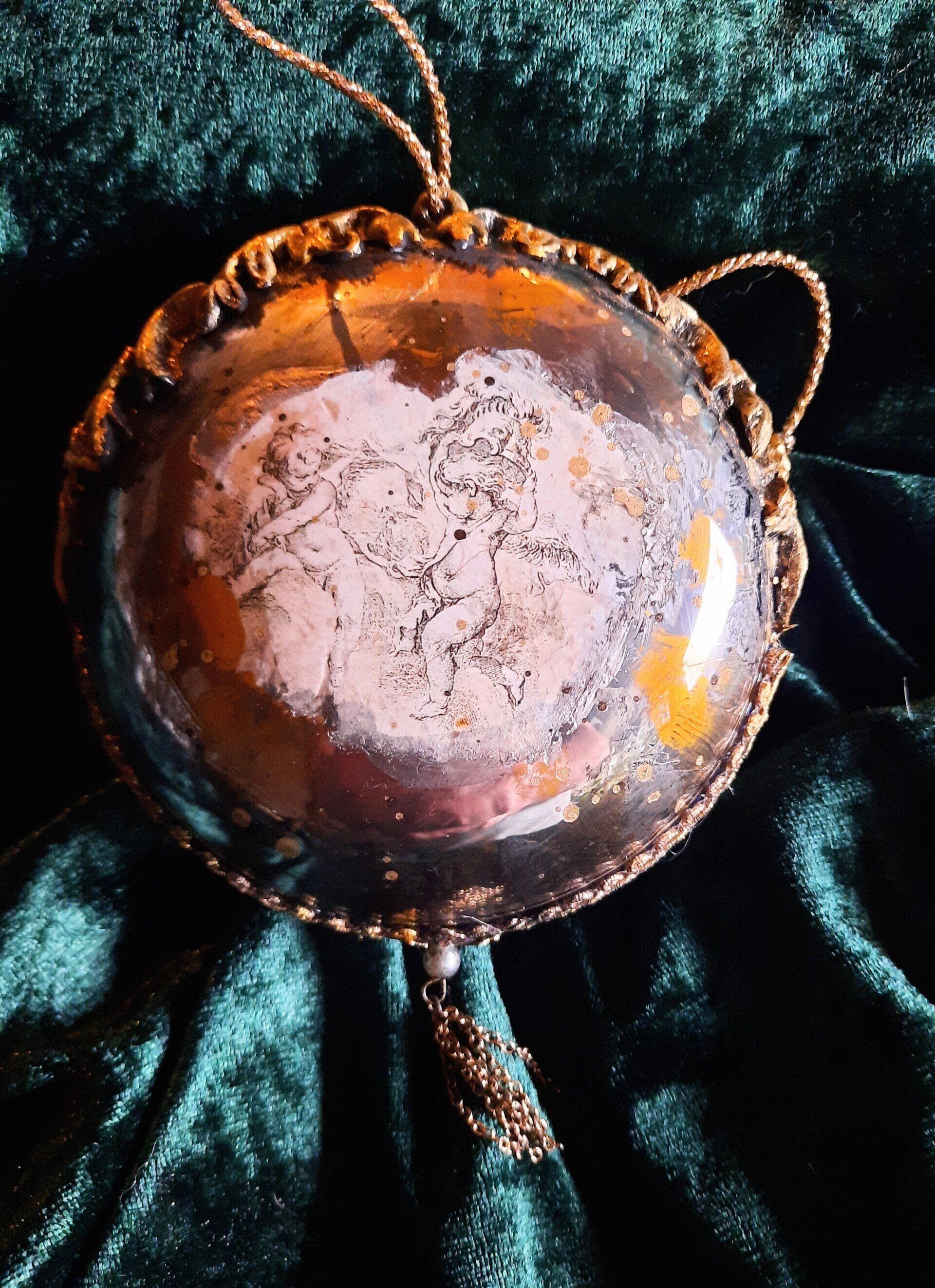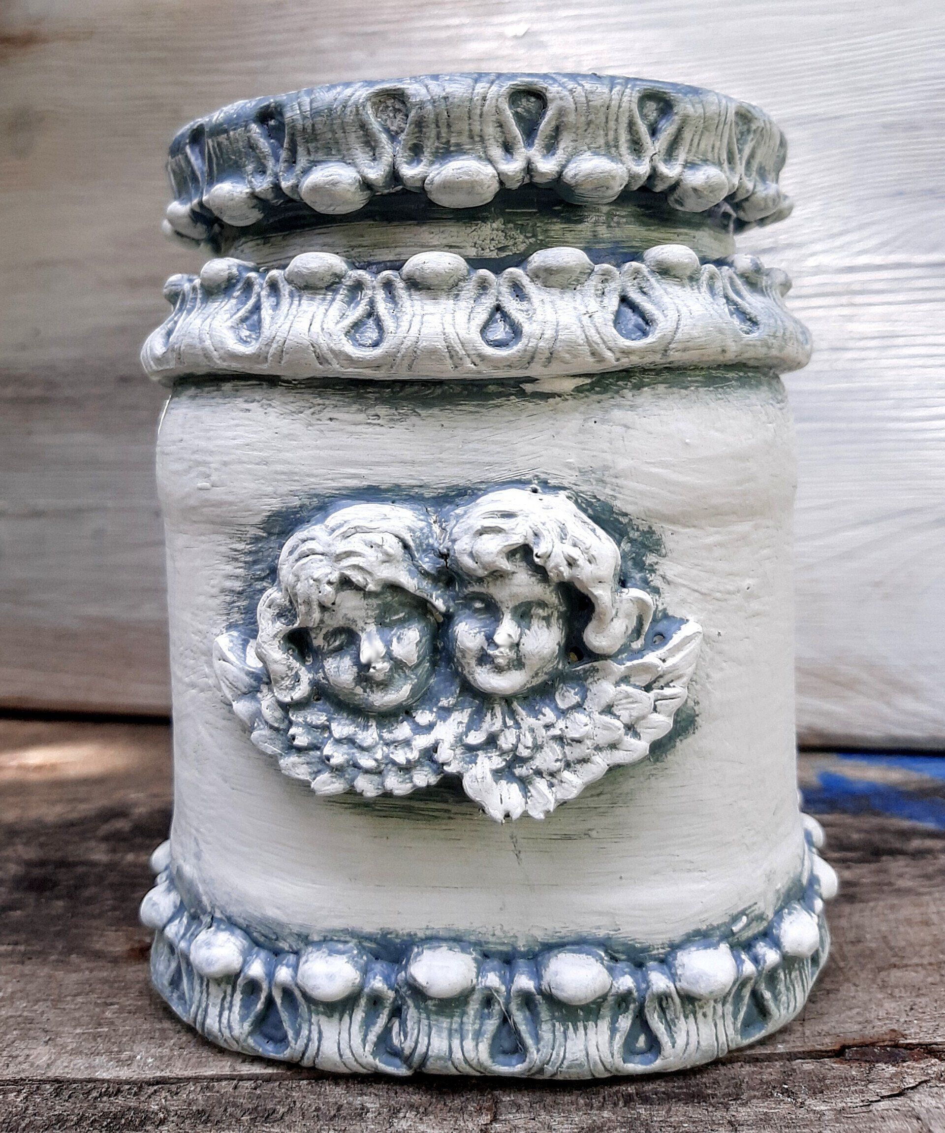 Barocke Engeldosen im sshabby-vintage Look. Mit erlesenen papieren, Farben und Pasten gestaltet, der Puttenkopf ist aus gebranntem Ton..... je ca. 21cm hoch, 16cm DM - je 21,50€ auf Anfrage