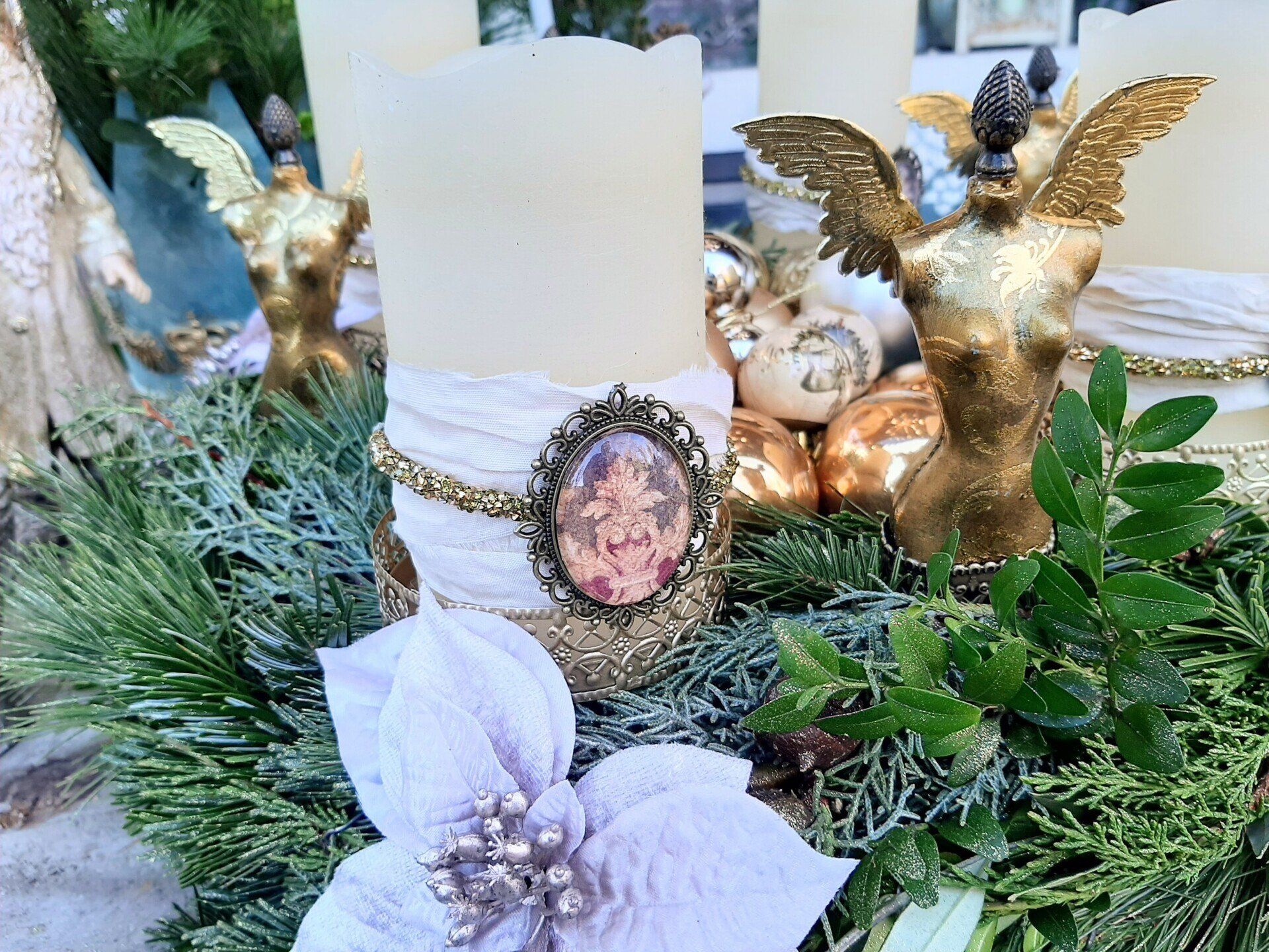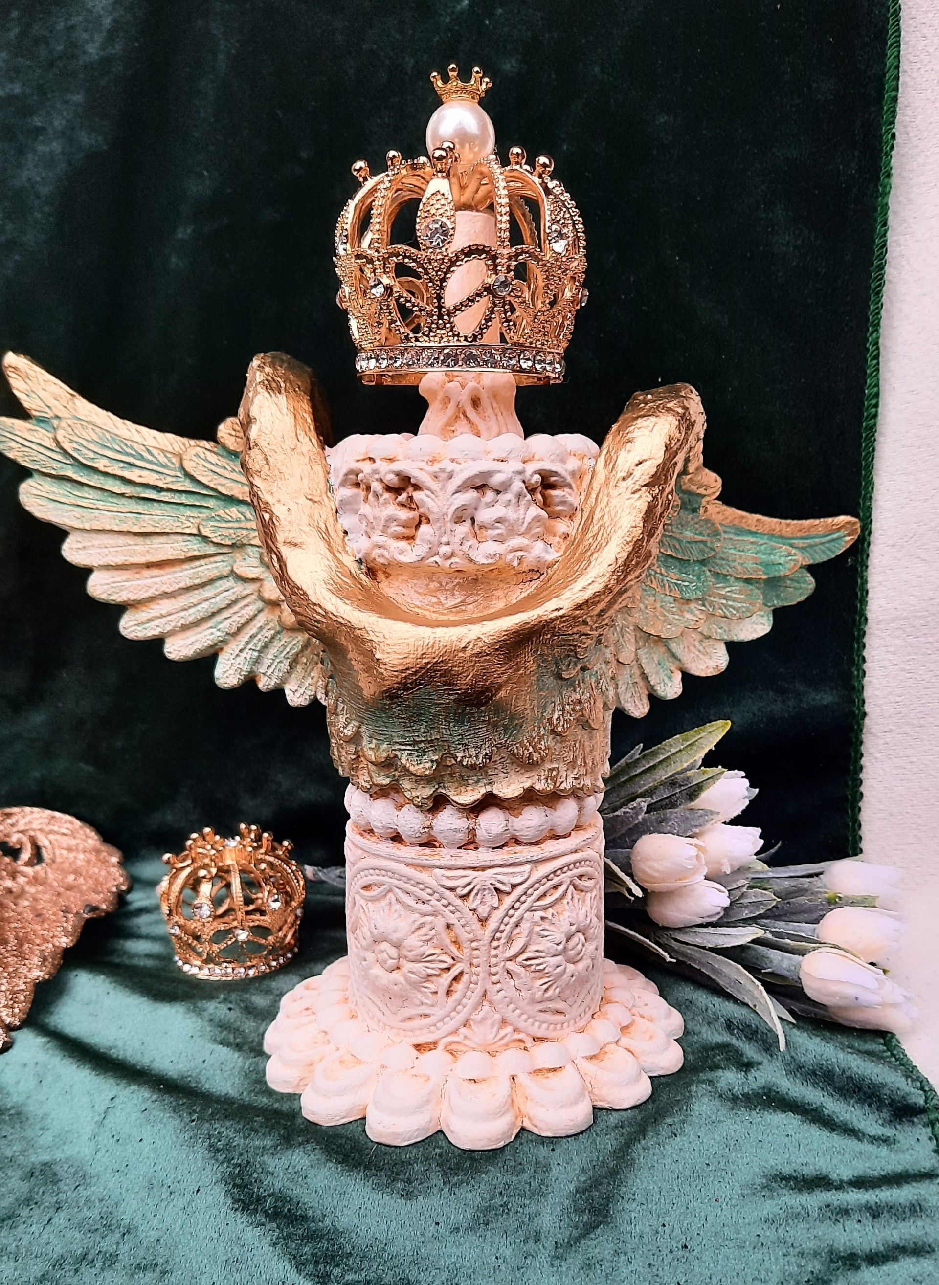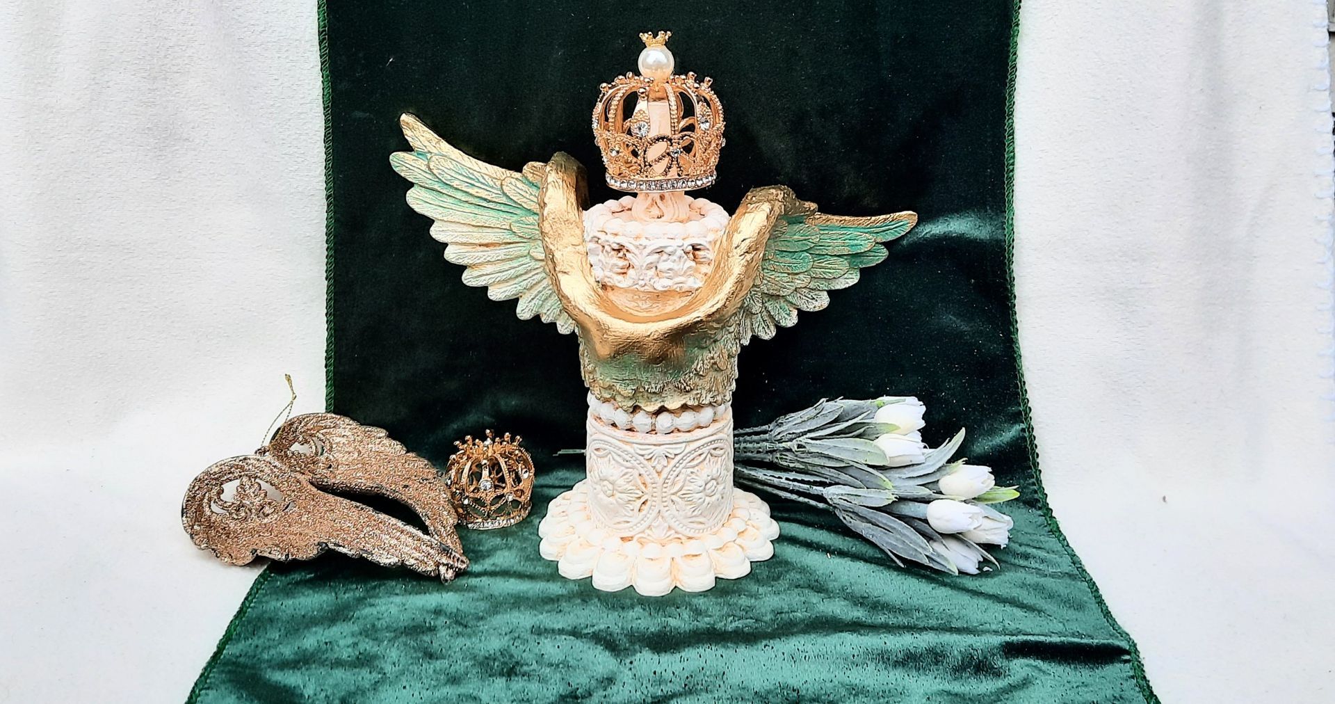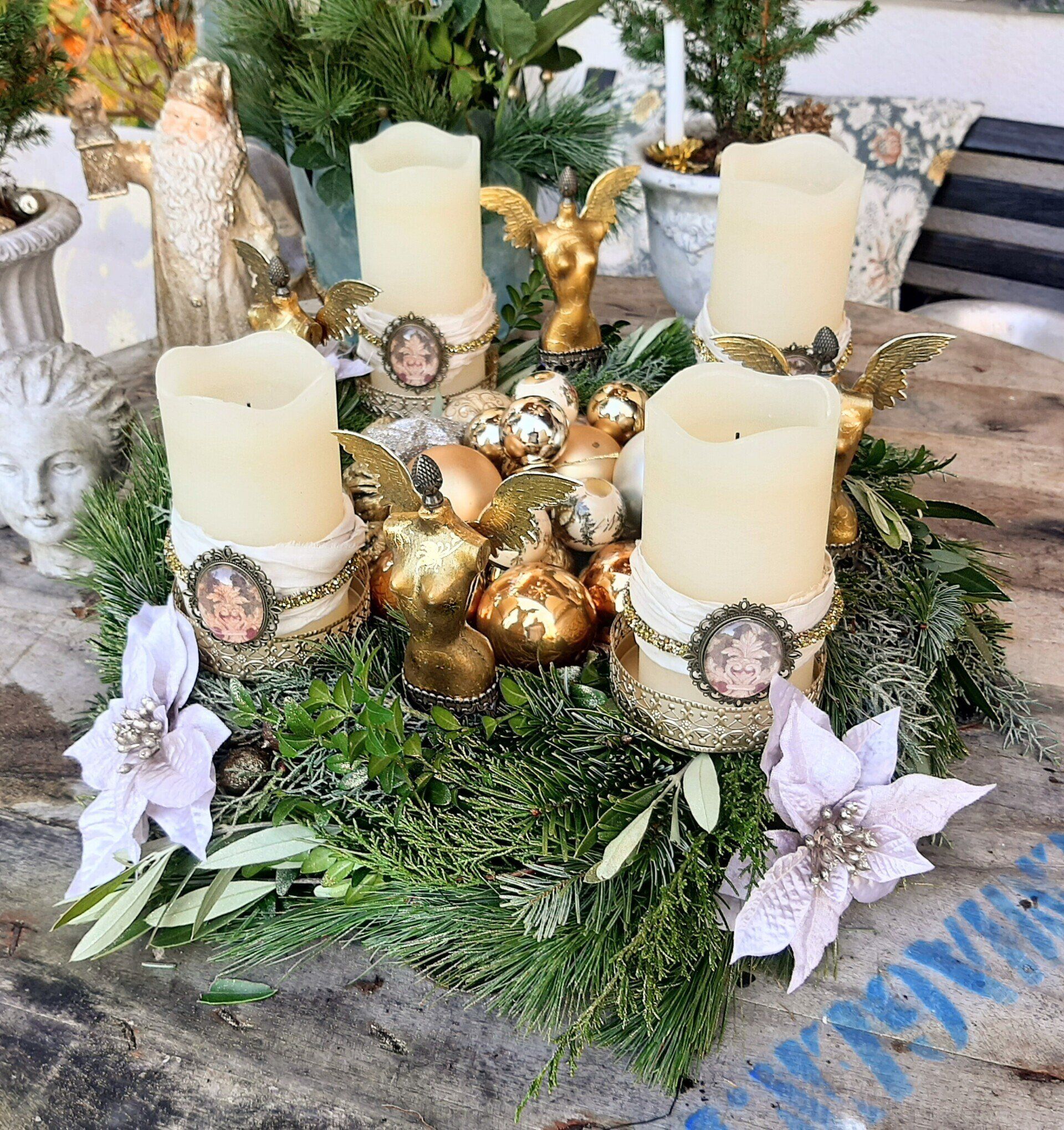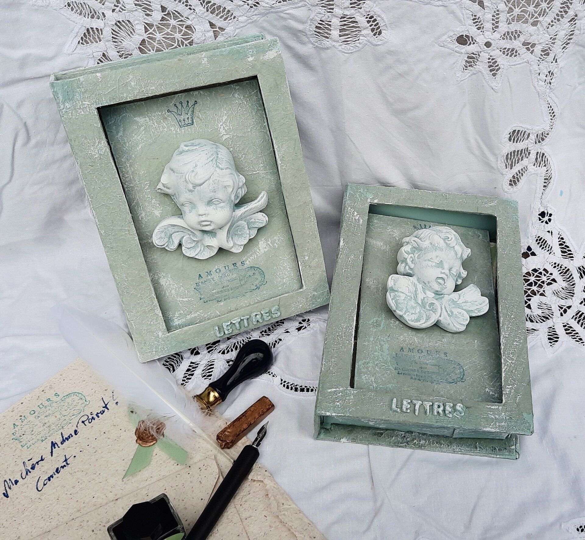 Barocke Engeldosen im sshabby-vintage Look. Mit erlesenen papieren, Farben und Pasten gestaltet, der Puttenkopf ist aus gebranntem Ton..... je ca. 21cm hoch, 16cm DM - je 21,50€ auf Anfrage