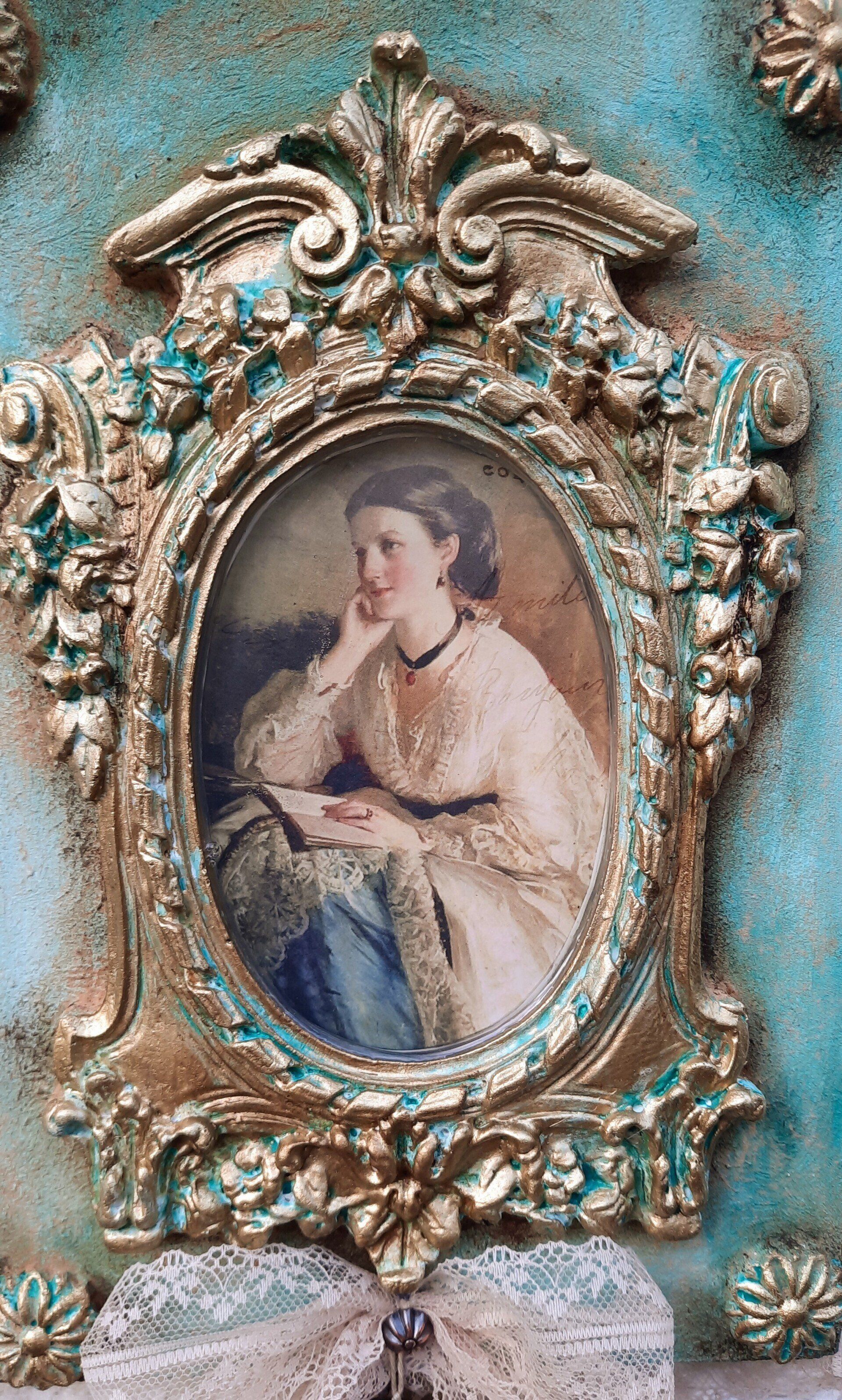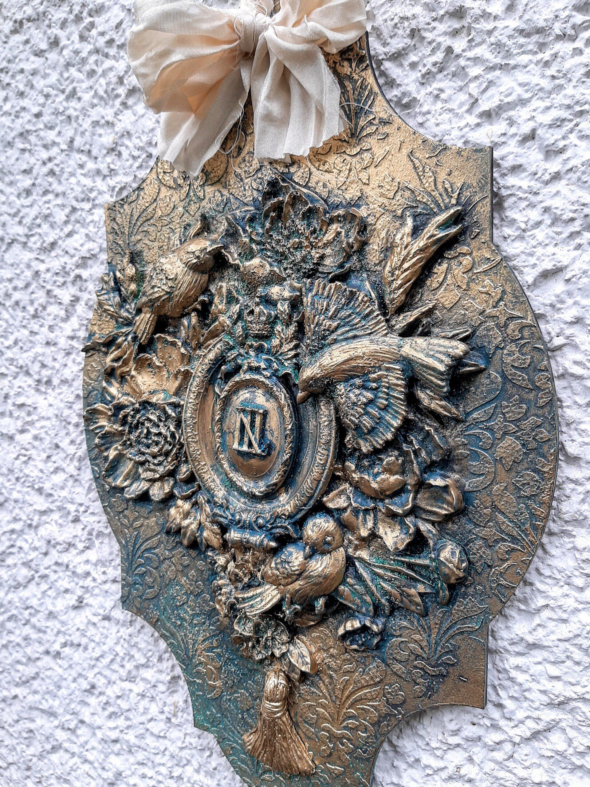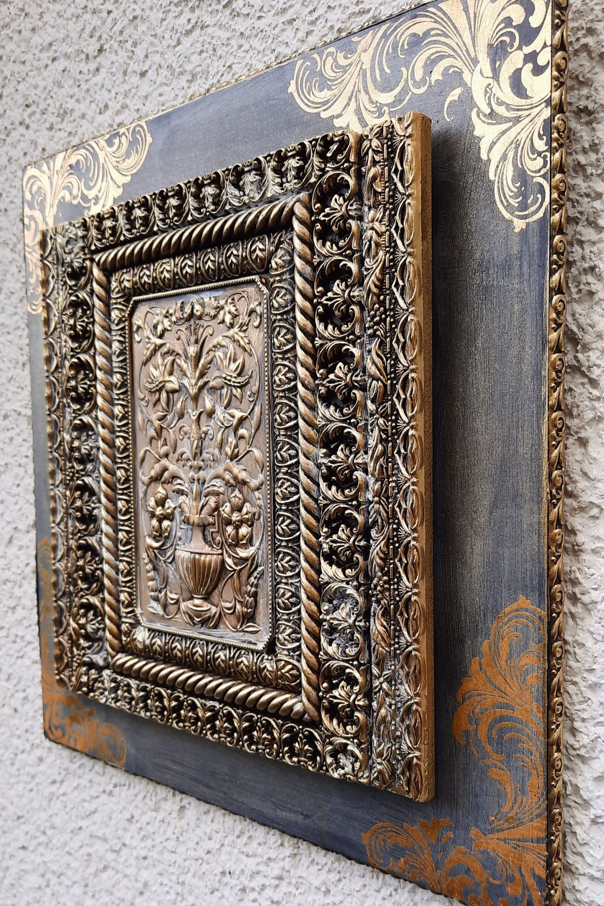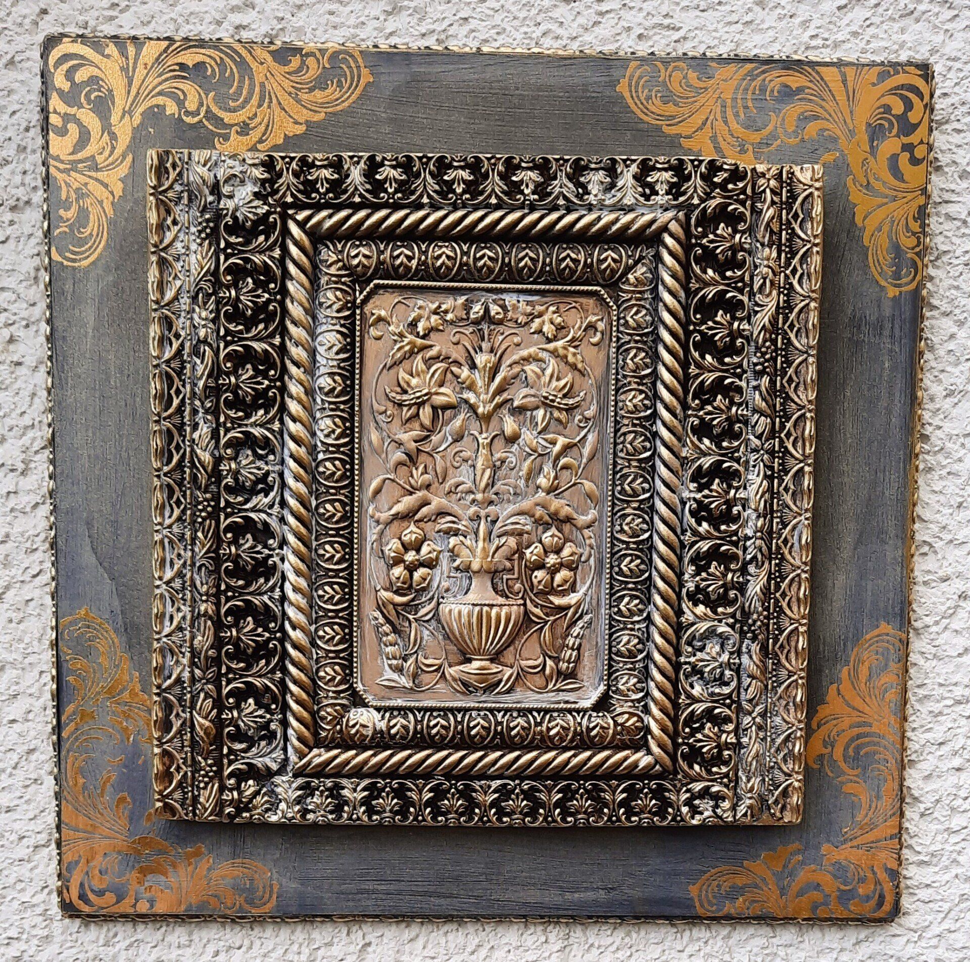 MixedMedia Projekt in Jugendstil-Optik, eine opulent gestaltete MDF Platte 30x30cm auf einer gestalteten 40x40cm Platte -