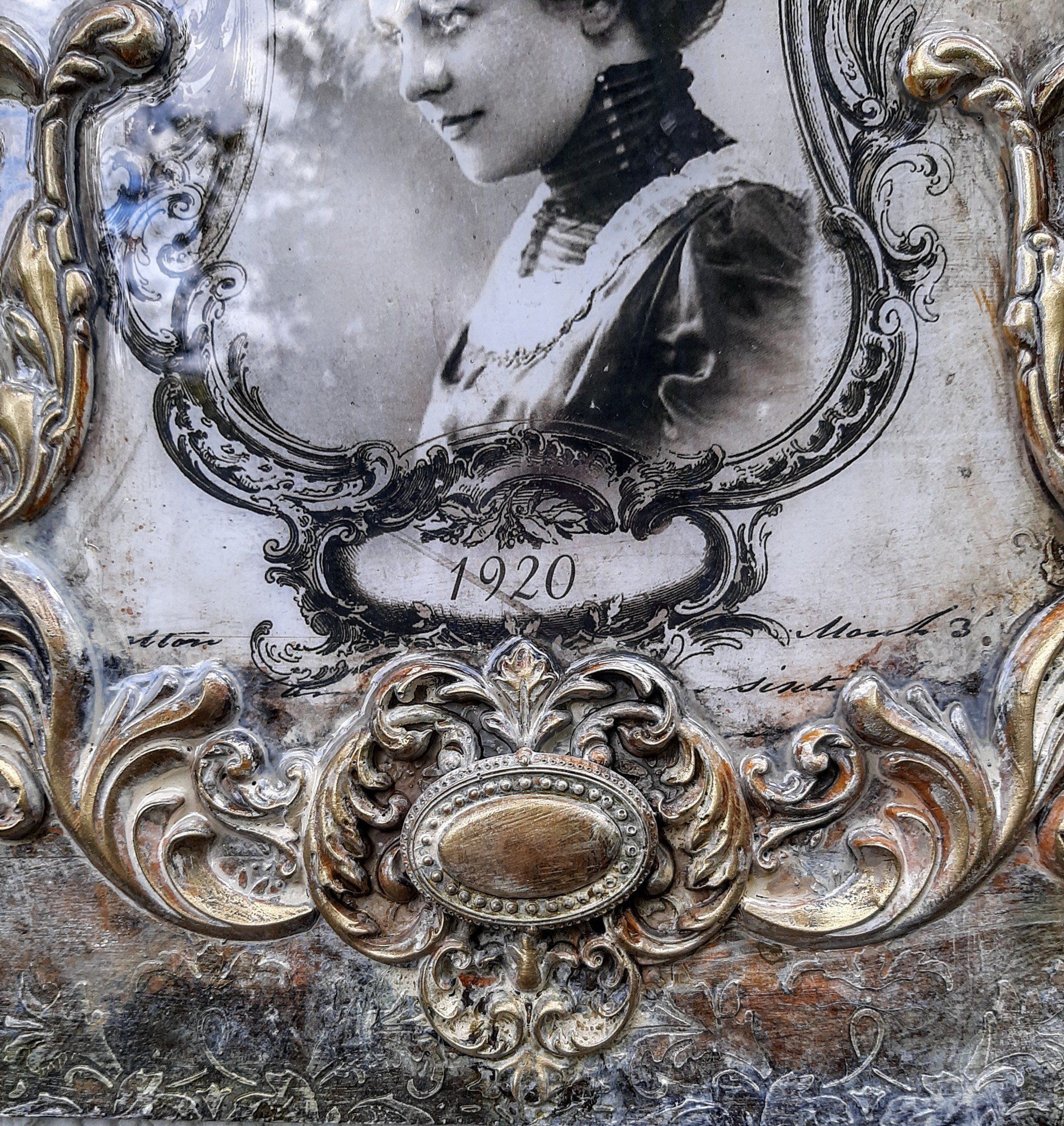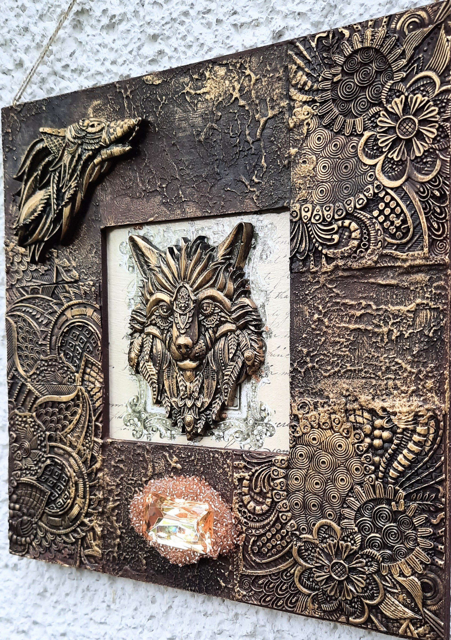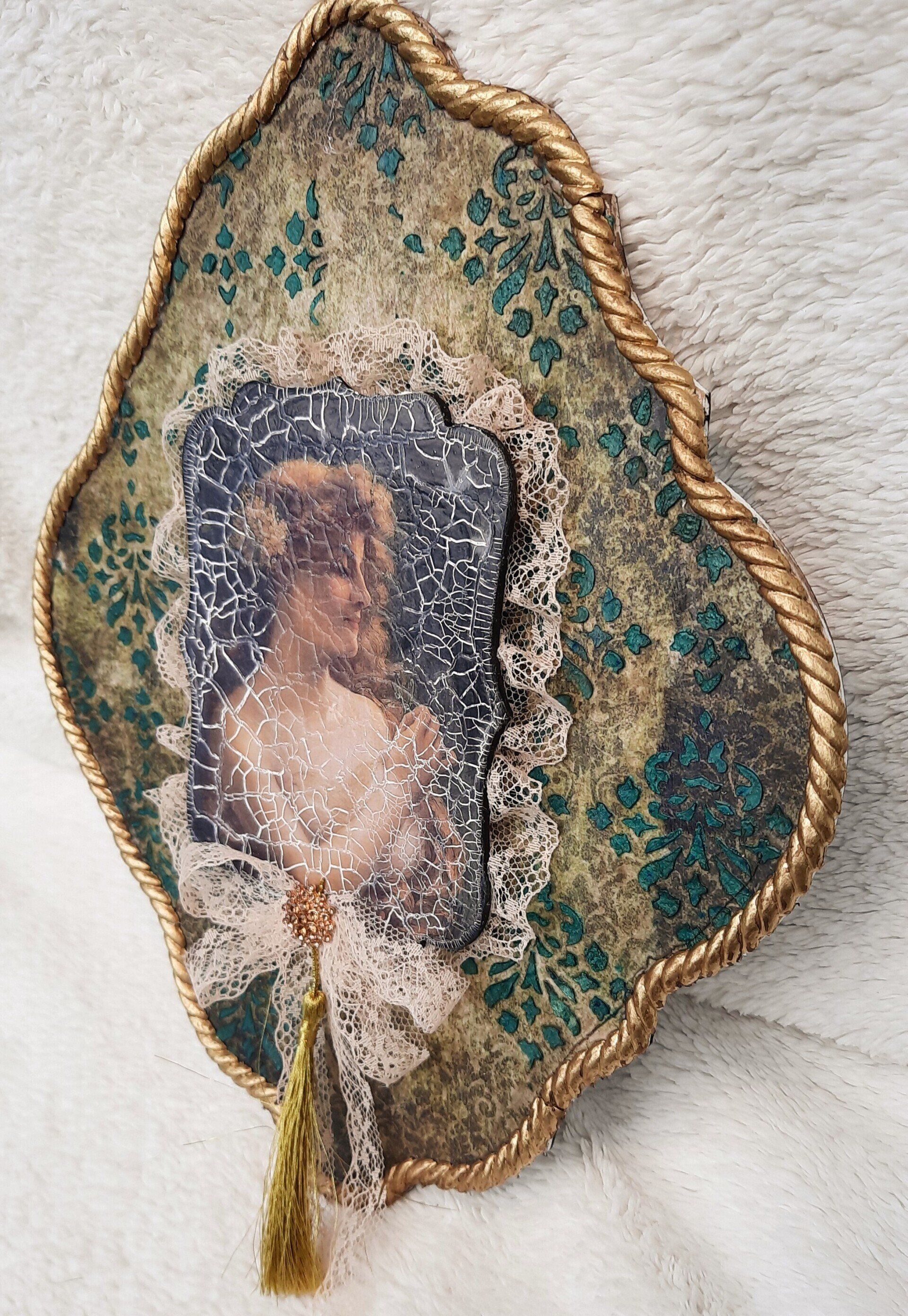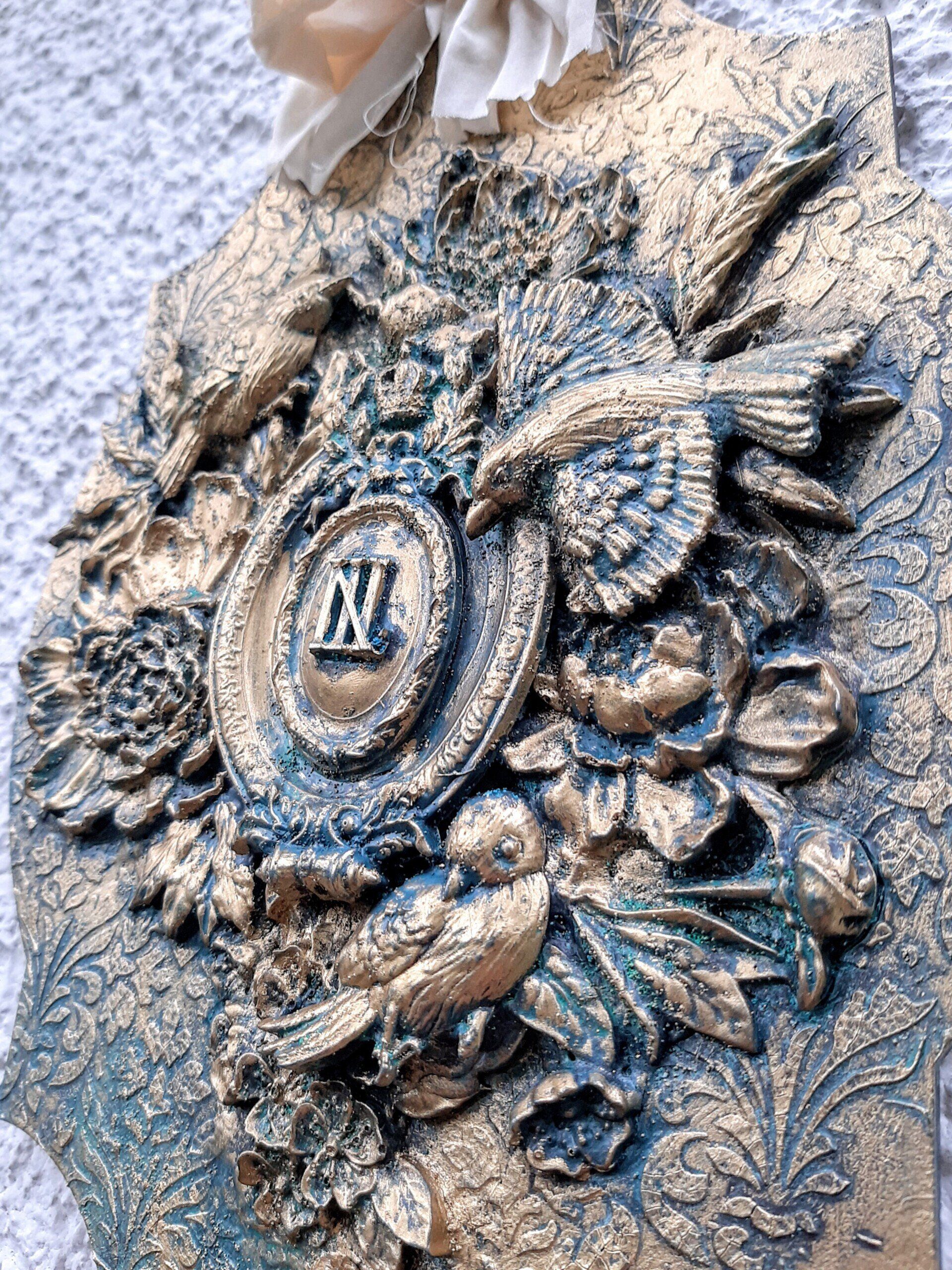 MixedMedia Projekt in Jugendstil-Optik, eine opulent gestaltete MDF Platte 30x30cm auf einer gestalteten 40x40cm Platte -