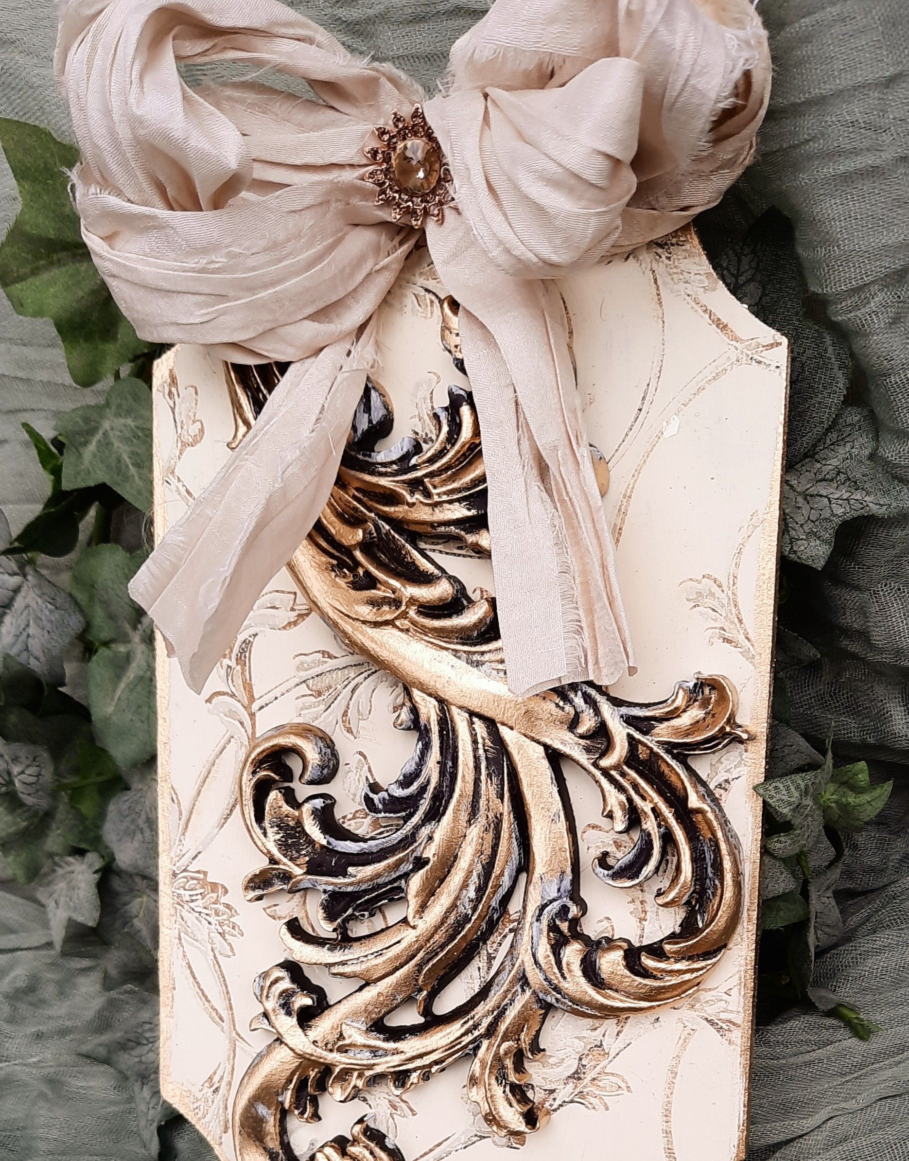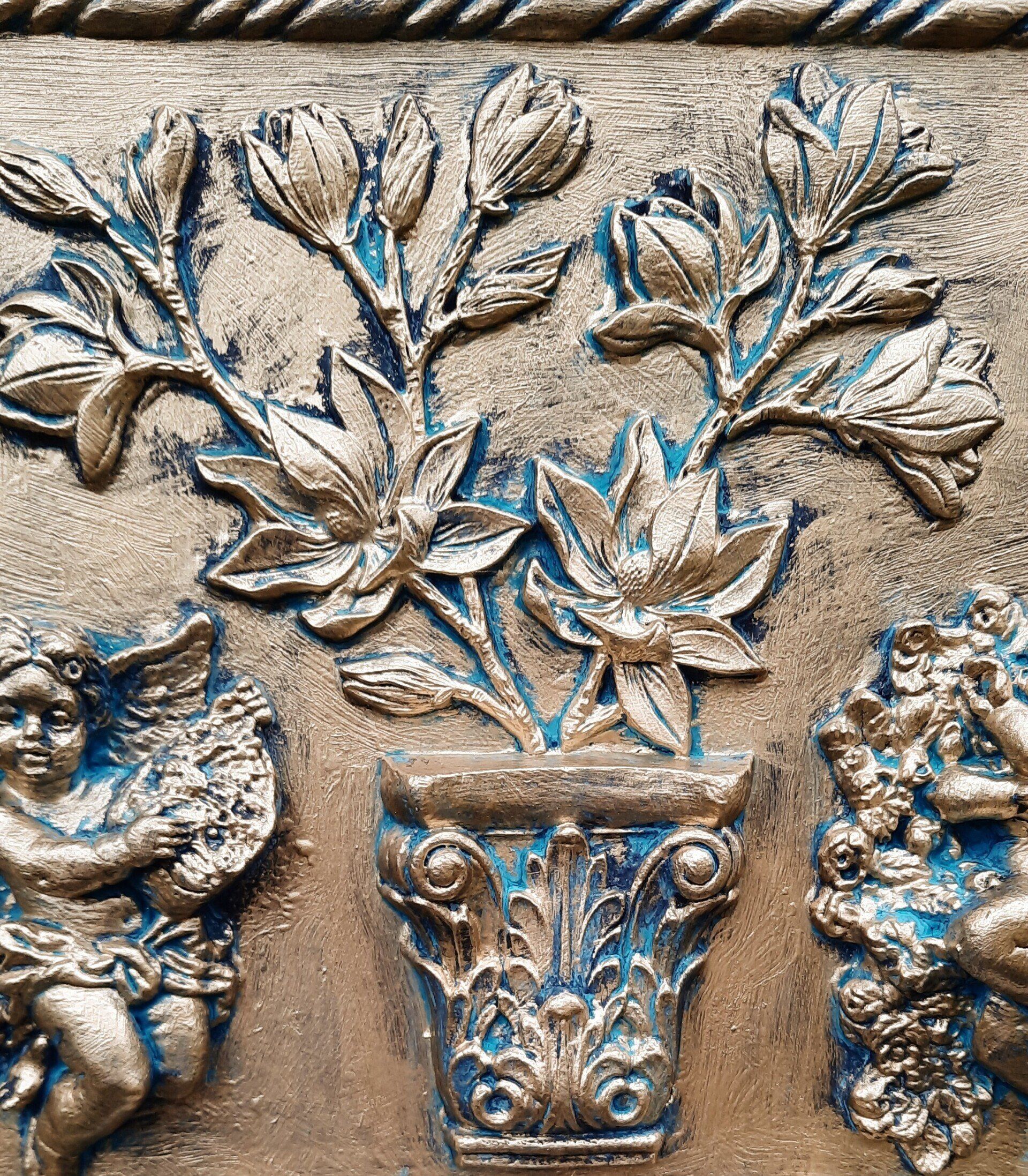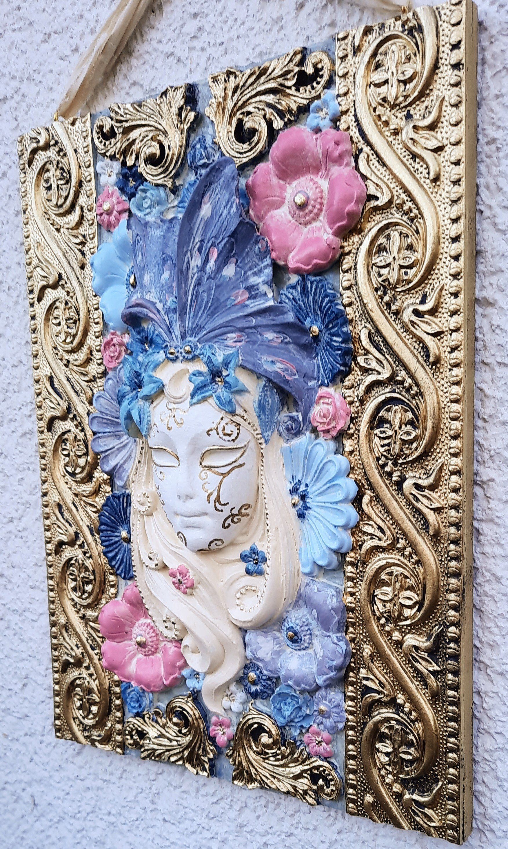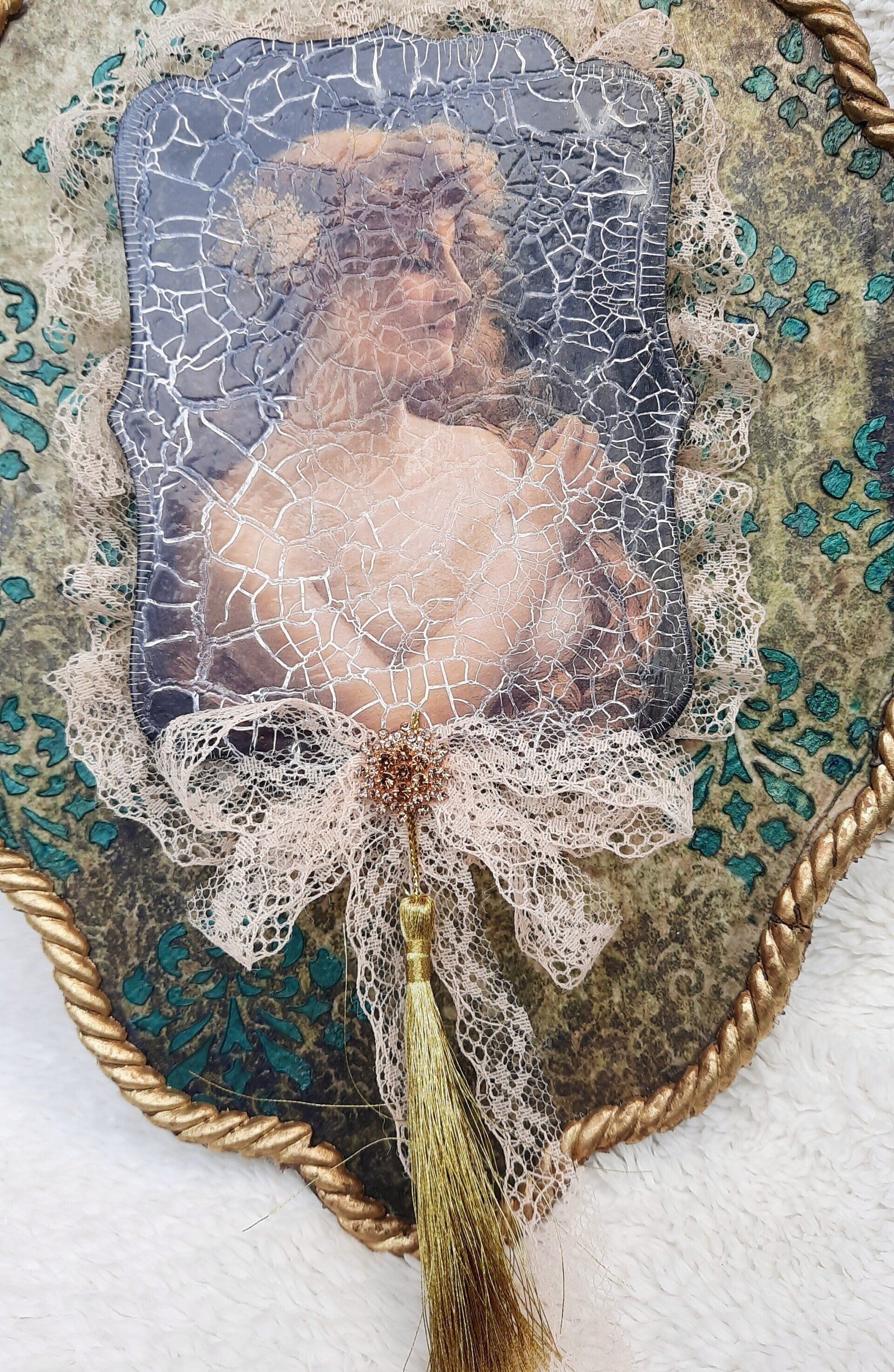 MixedMedia Projekt in Jugendstil-Optik, eine opulent gestaltete MDF Platte 30x30cm auf einer gestalteten 40x40cm Platte -