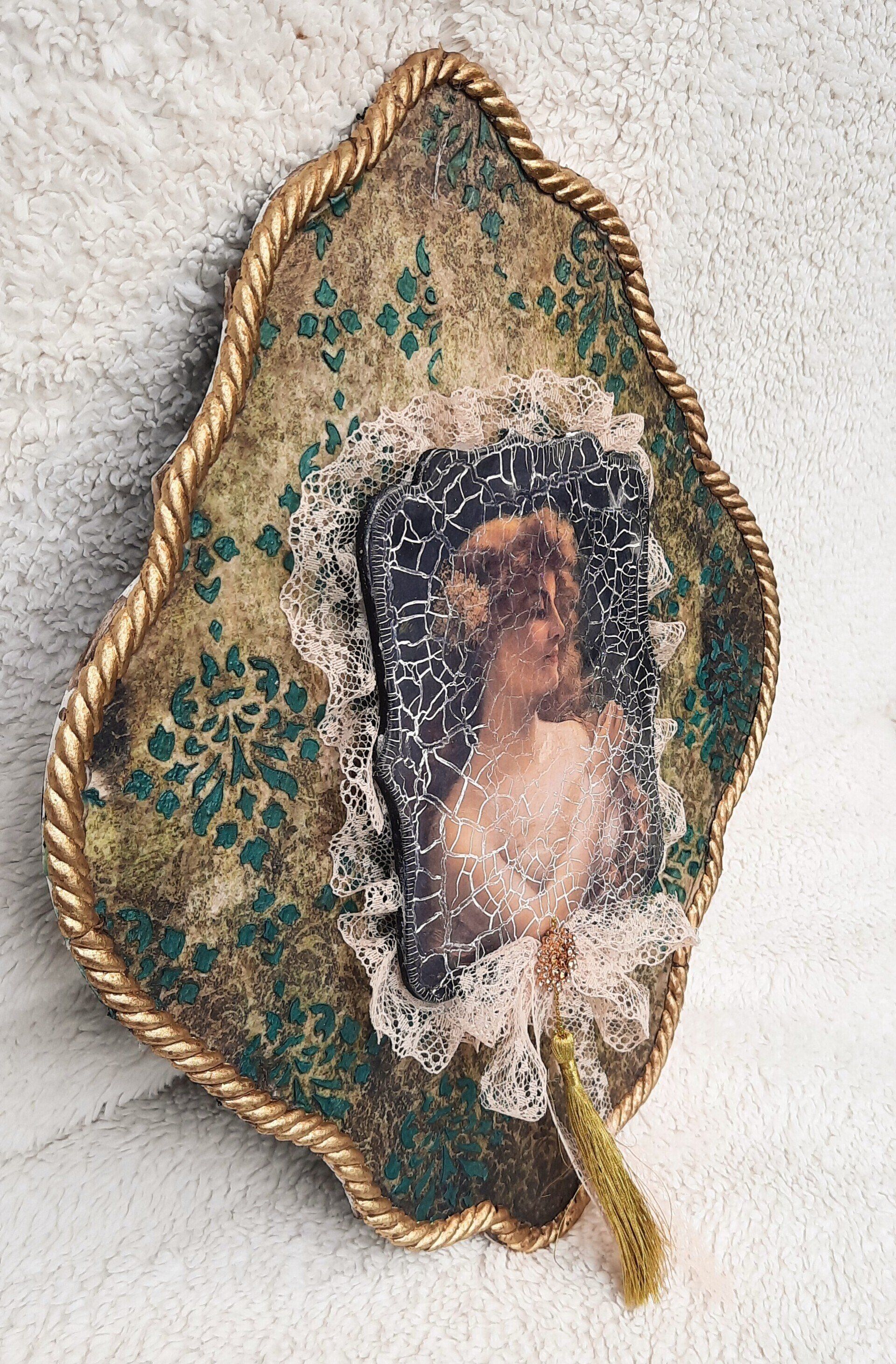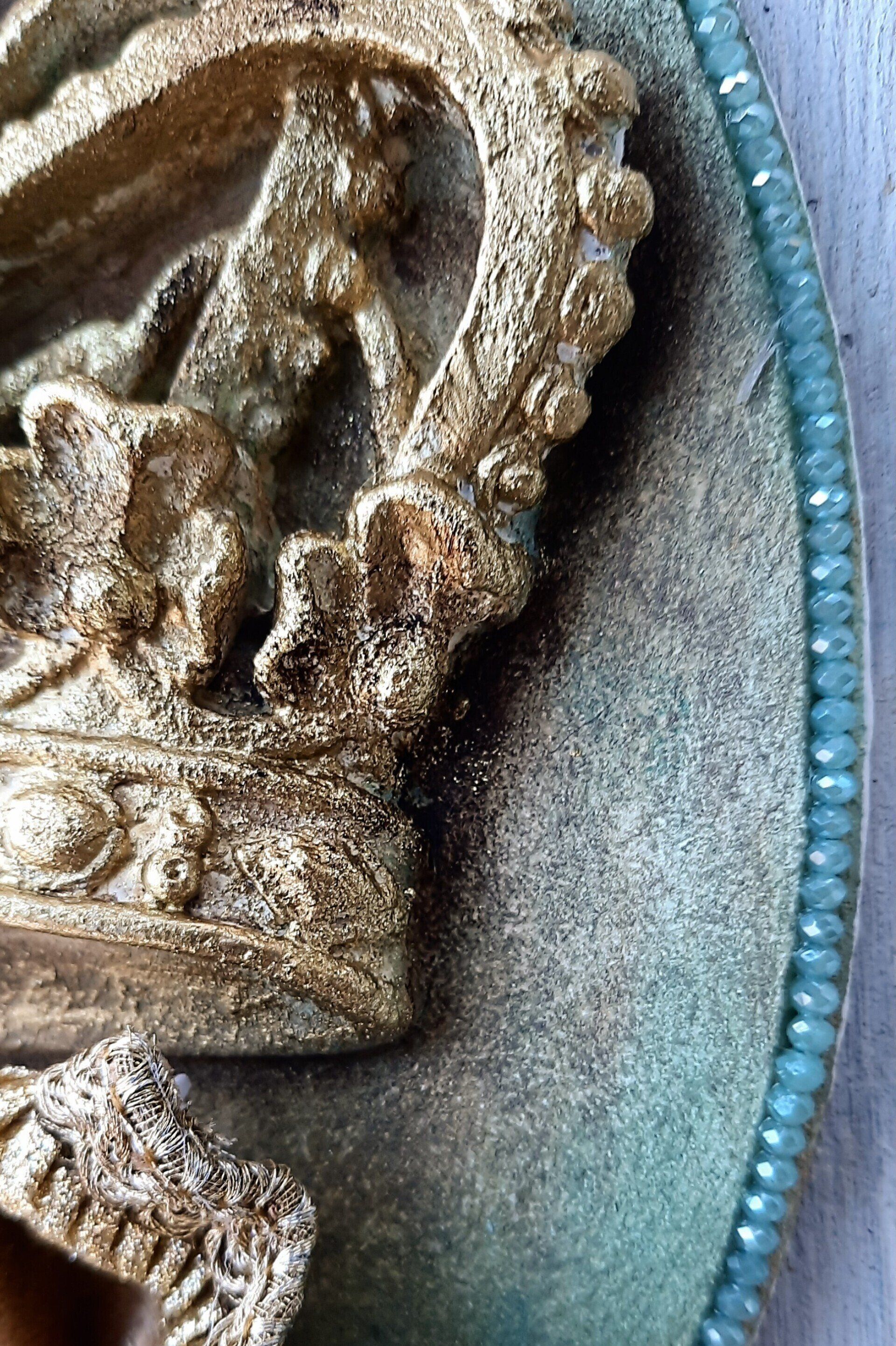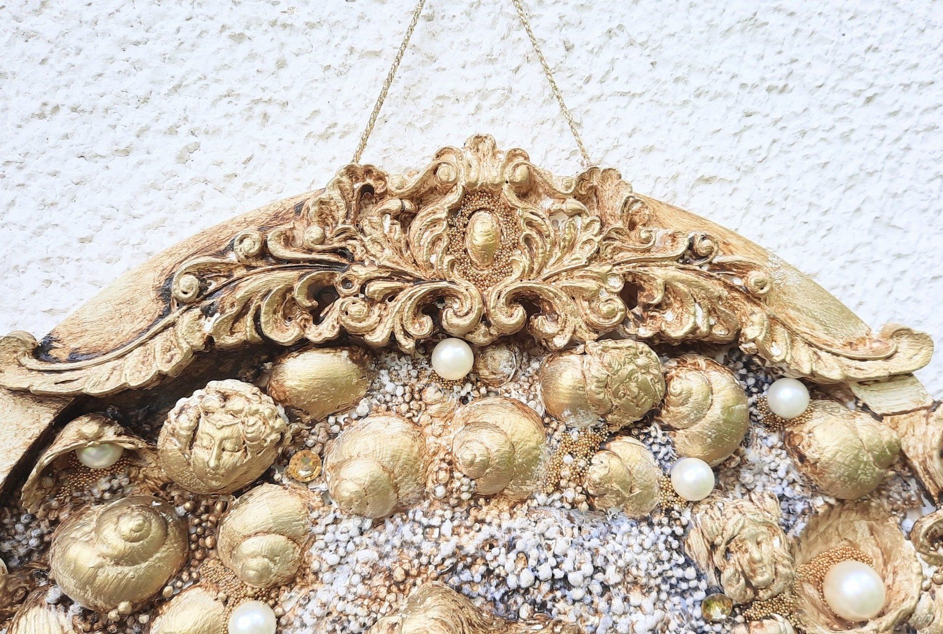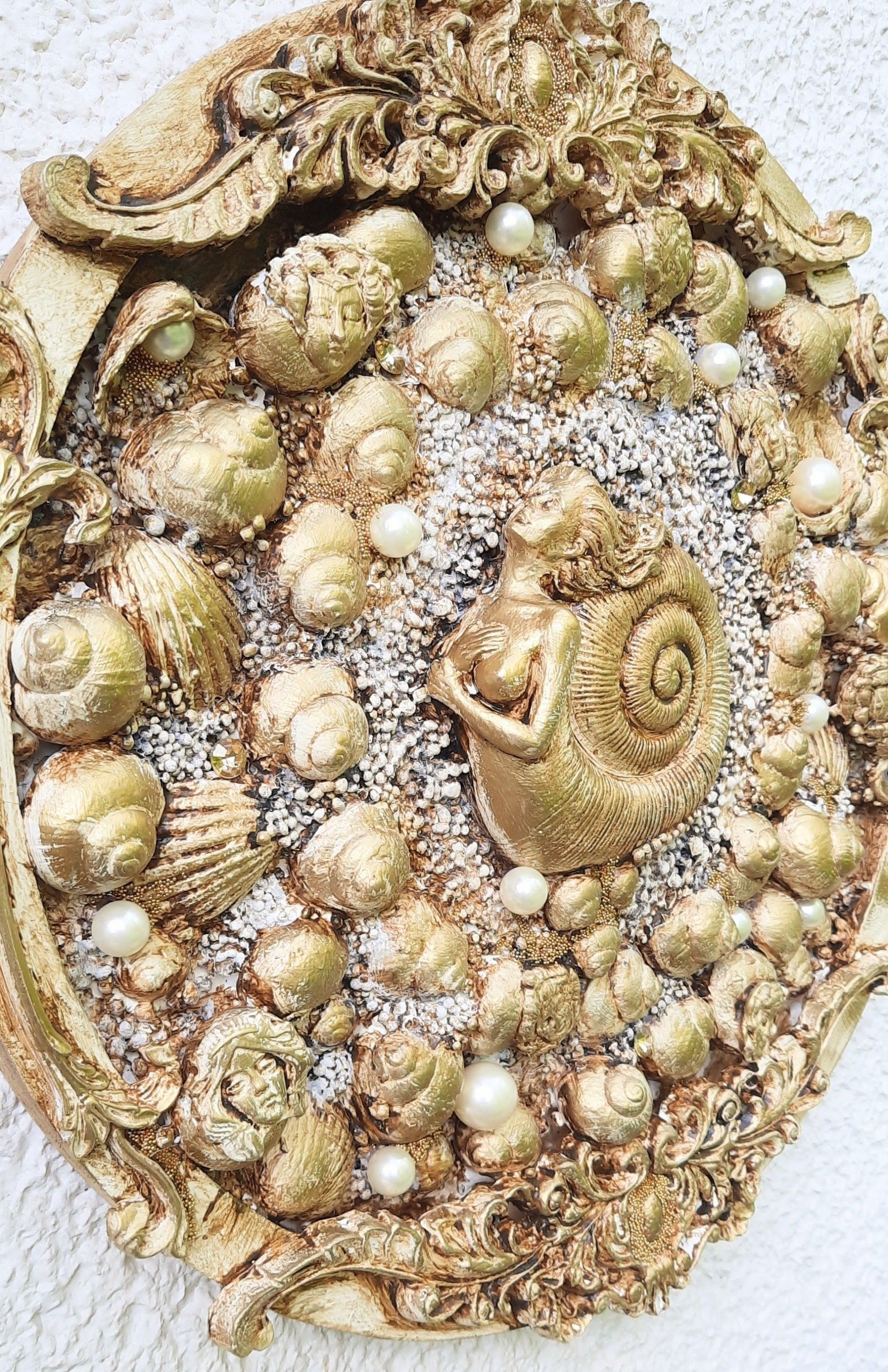 Phantastisches, rundes MixedMedia Bild. Aufwändig mit Schneckenhäusern und BArockornamenten gestaltet, Unikat! ca. 40cm DM, 59,- auf Anfrage
