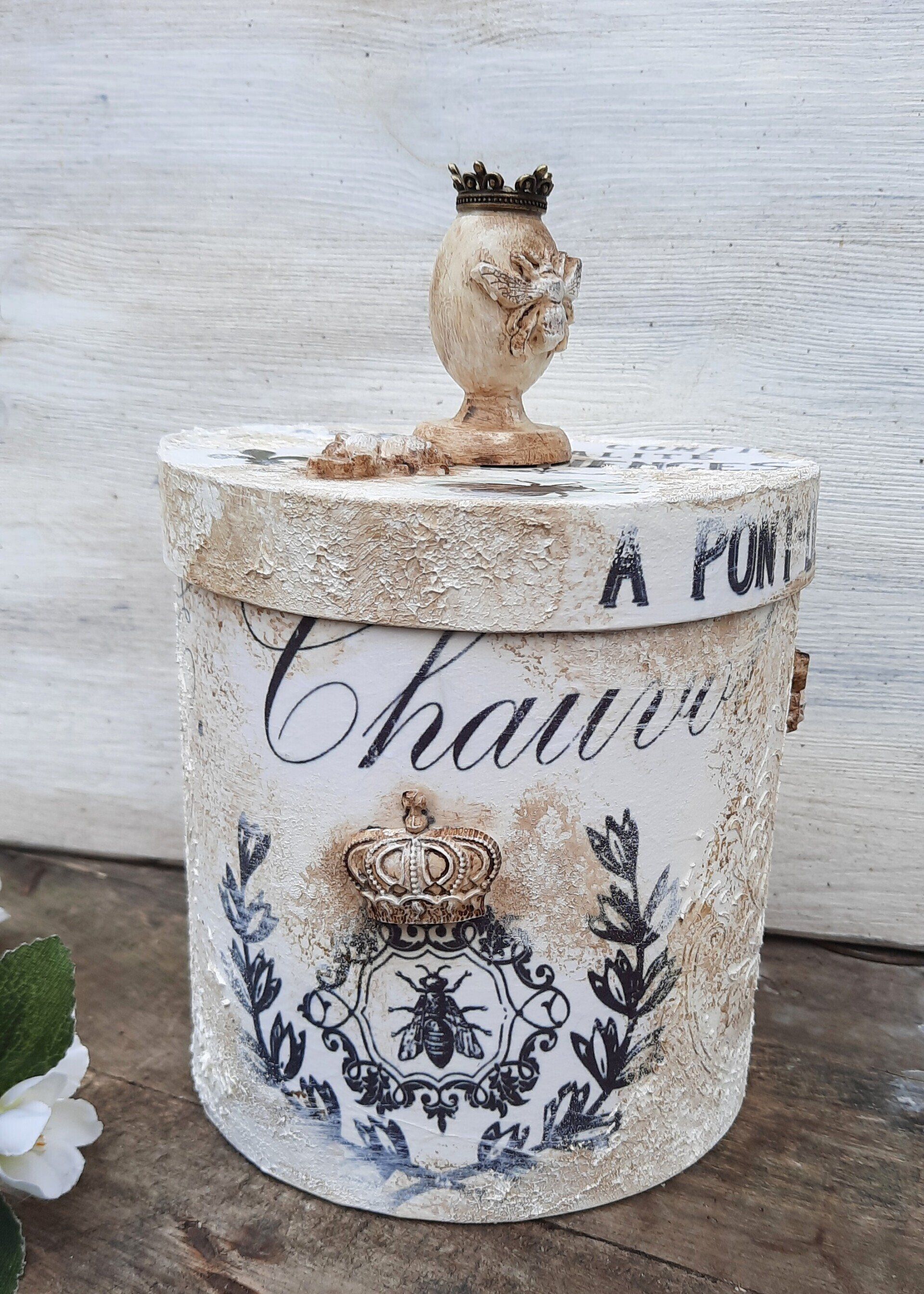 2 shabby Runddosen zum "Thema Bienen", aufwändig gestaltete, je ca. 15cm Dm, 18cm hoch, je 19,50€ auf Anfrage