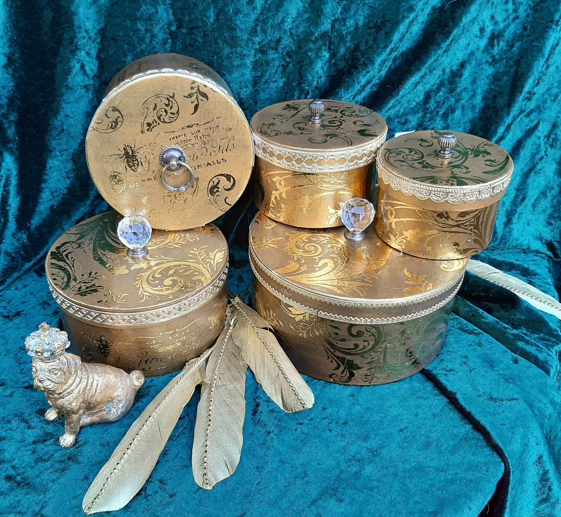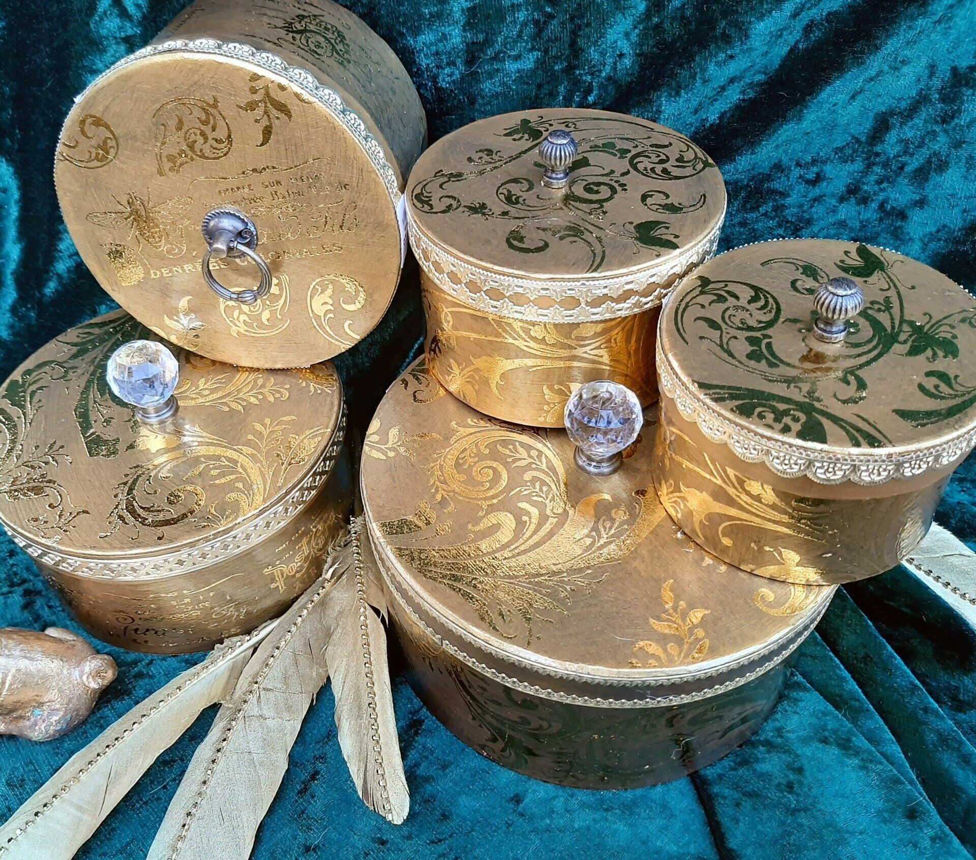 5 kleine goldene Runddosen, mit Ornamenten und Schnörkel, zwischen 10 und 18cm Durchmesser .... jenach Größe zwischen 5,- und 15,-€ auf Anfrage