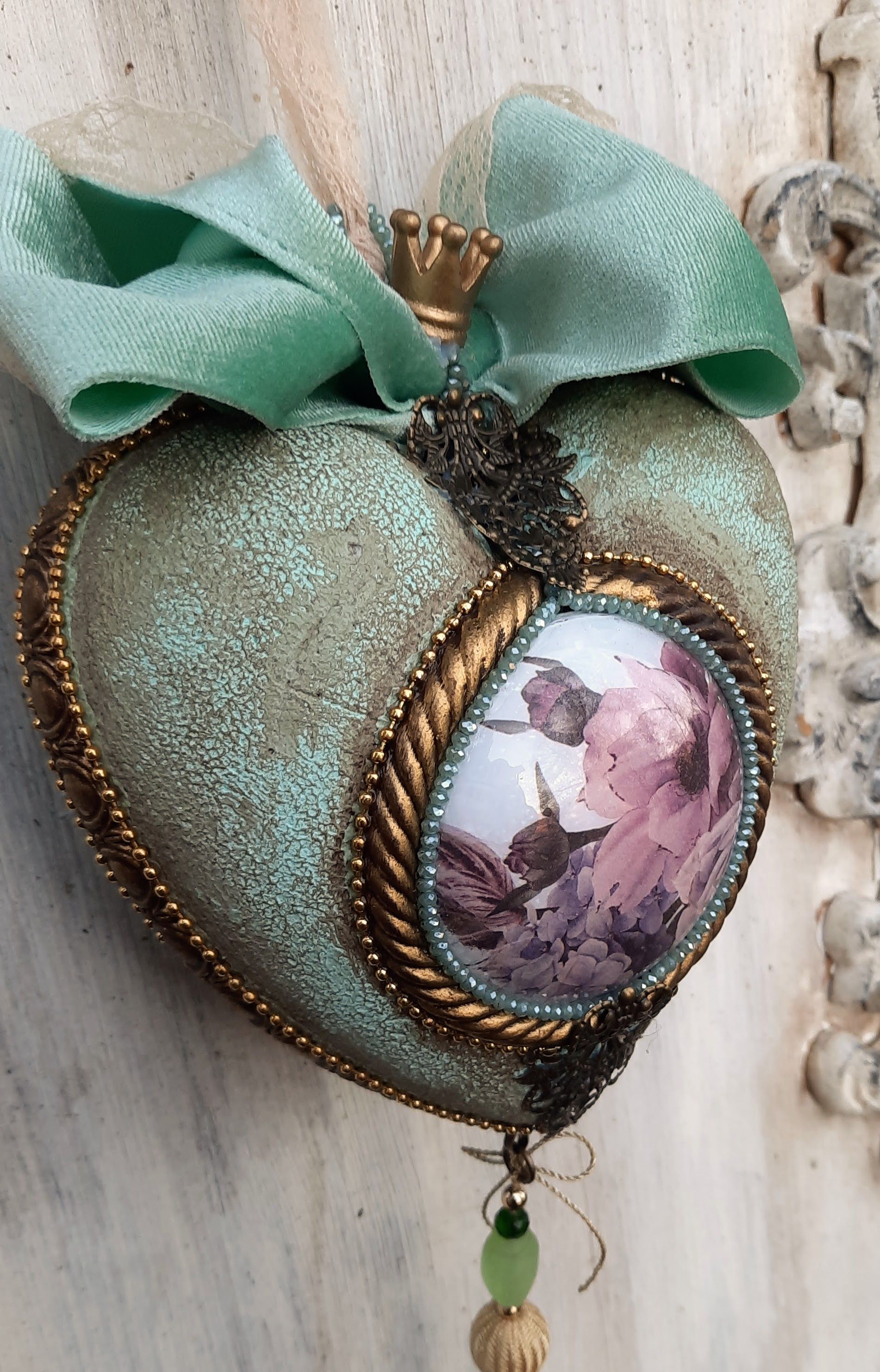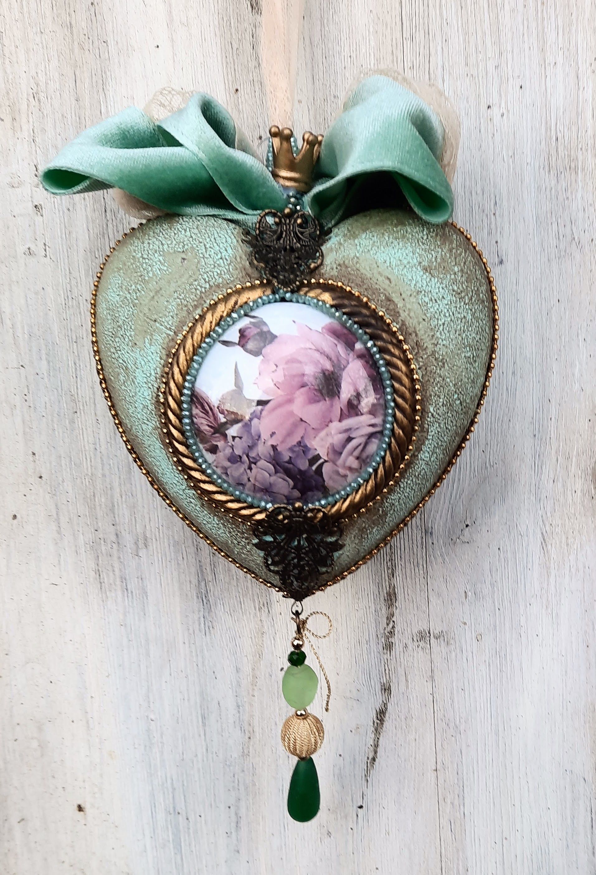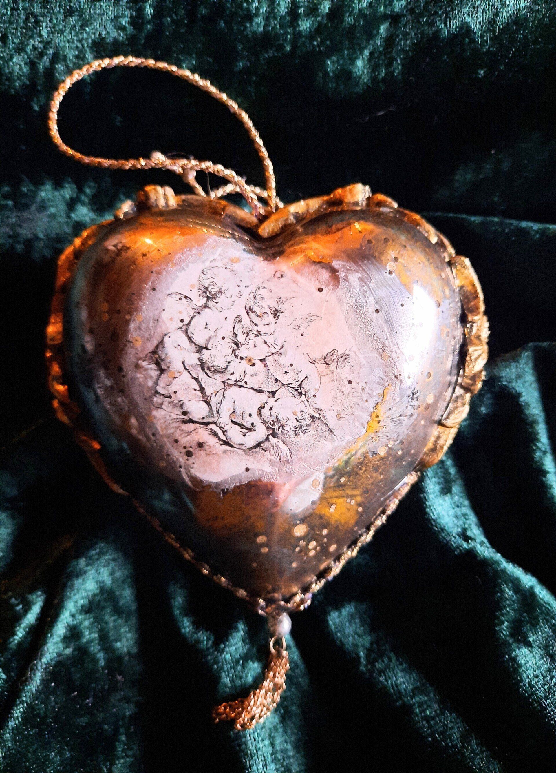 Kugeln und Herzen in Vintage Metalloptik , Grundmaterial Plastik und erlesene Farben und Lasuren je ca. 10cm ---je 15,-€
