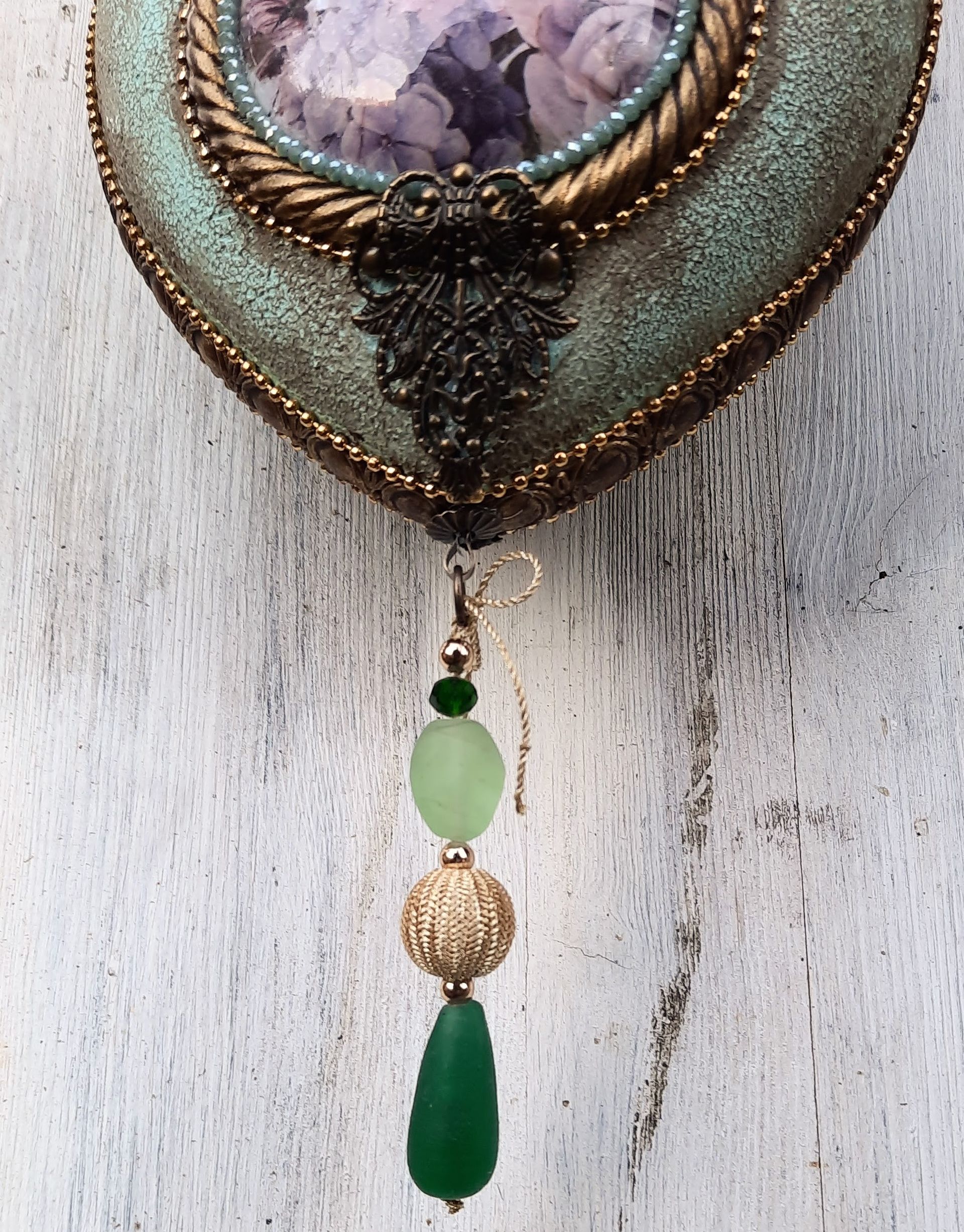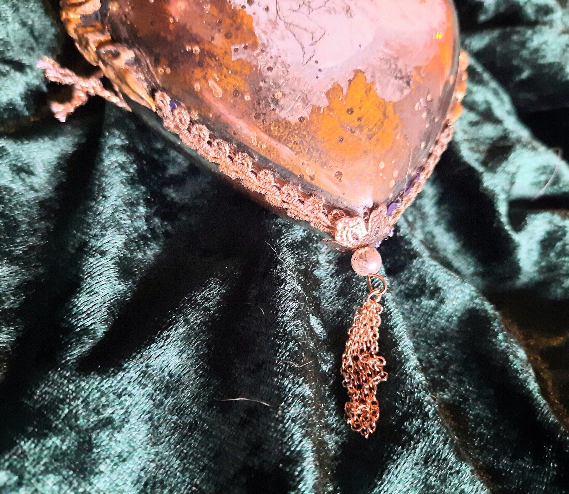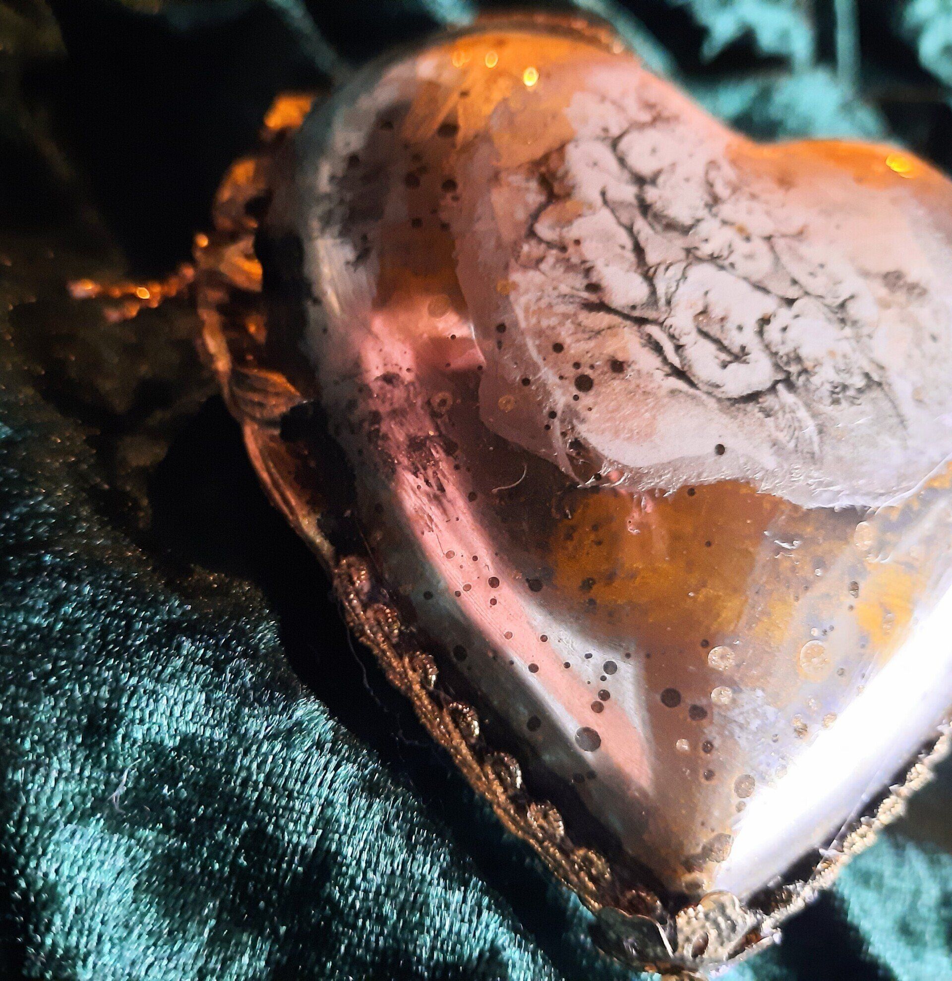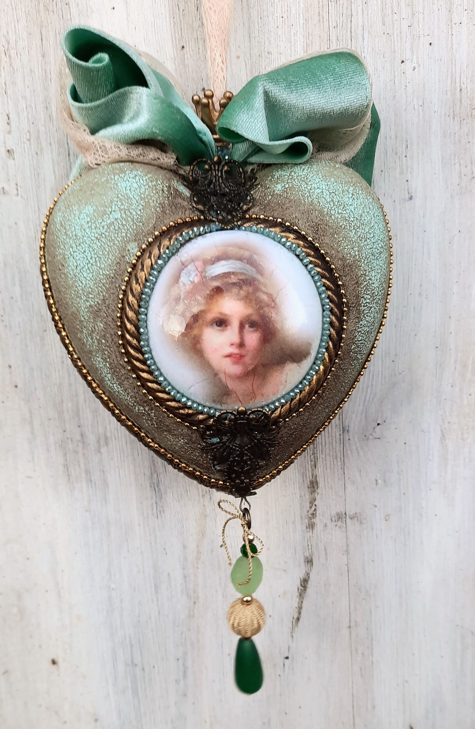 Kugeln und Herzen in Vintage Metalloptik , Grundmaterial Plastik und erlesene Farben und Lasuren je ca. 10cm ---je 15,-€