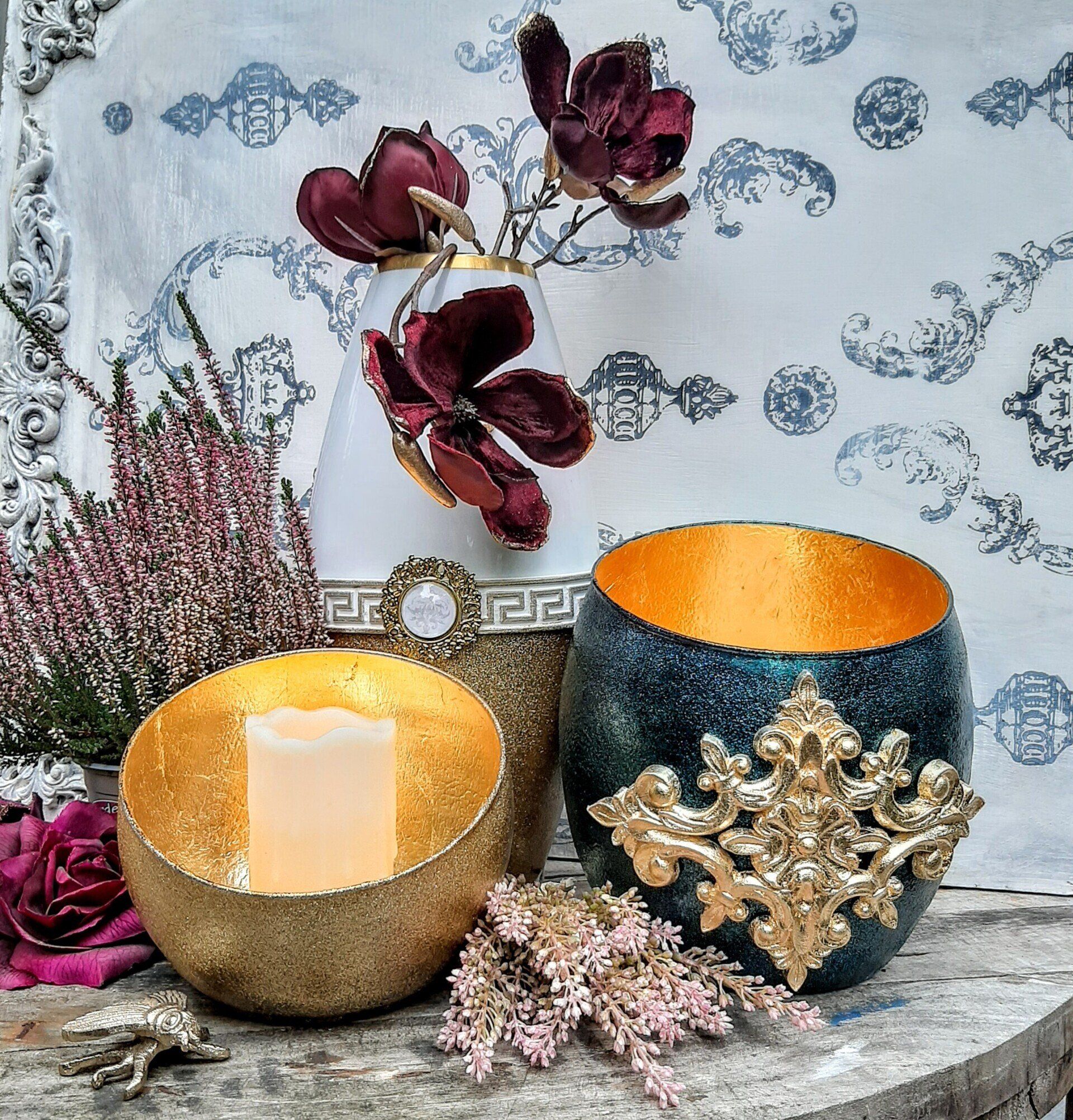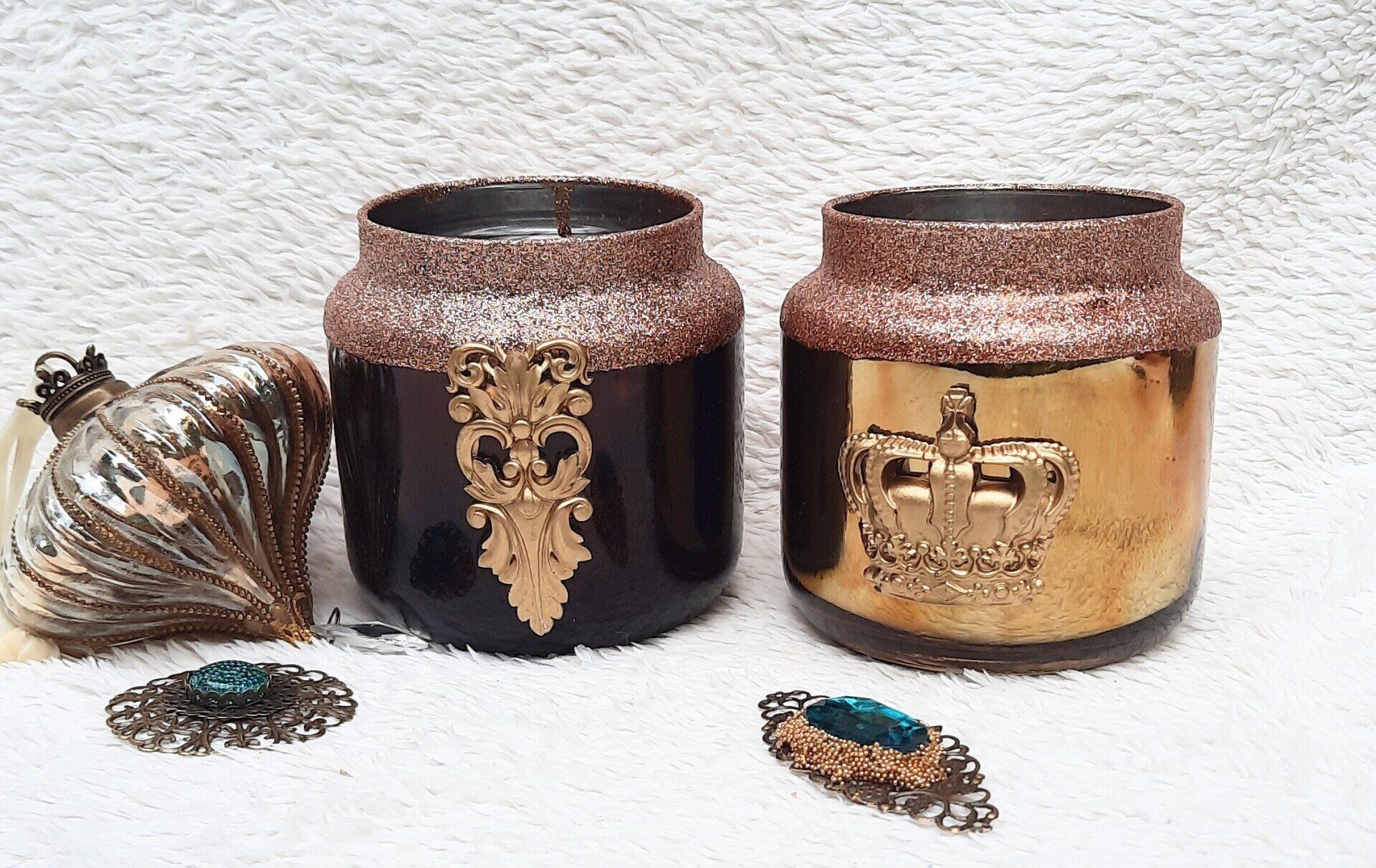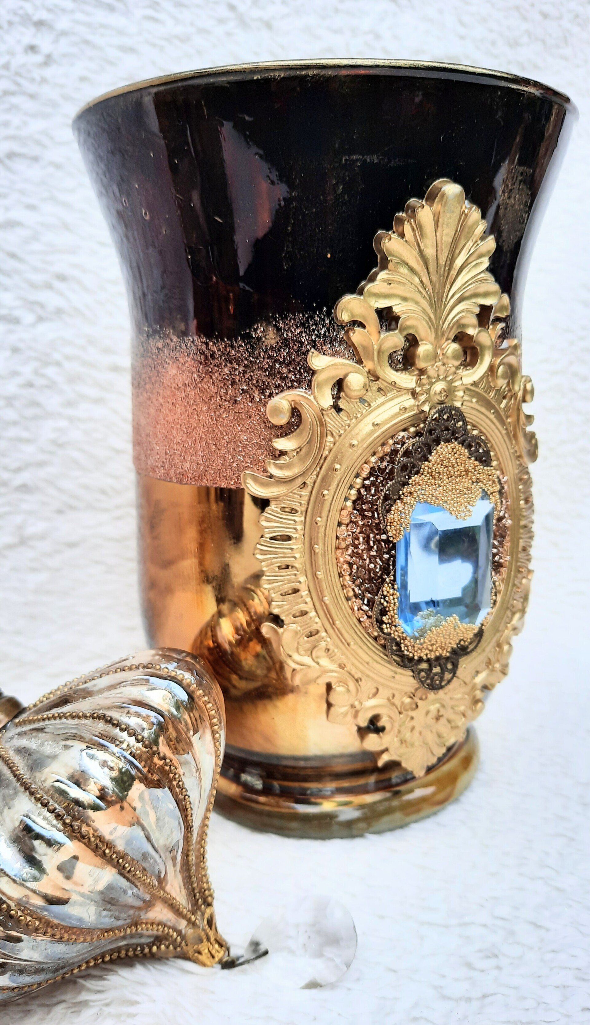 Luxuriöse Deko aus Glas, opulent gestaltet mit Glitterfarben und Blattgold
