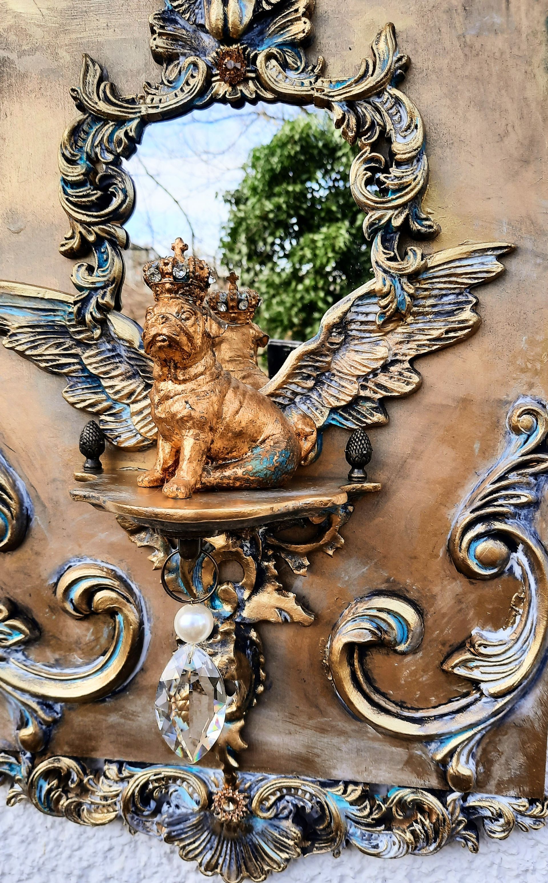 Opulent gestalteter Barock Spiegel, auf dem kleinen Podest kann man kleine Schätze vor dem Spiegel in Szene setzen.
