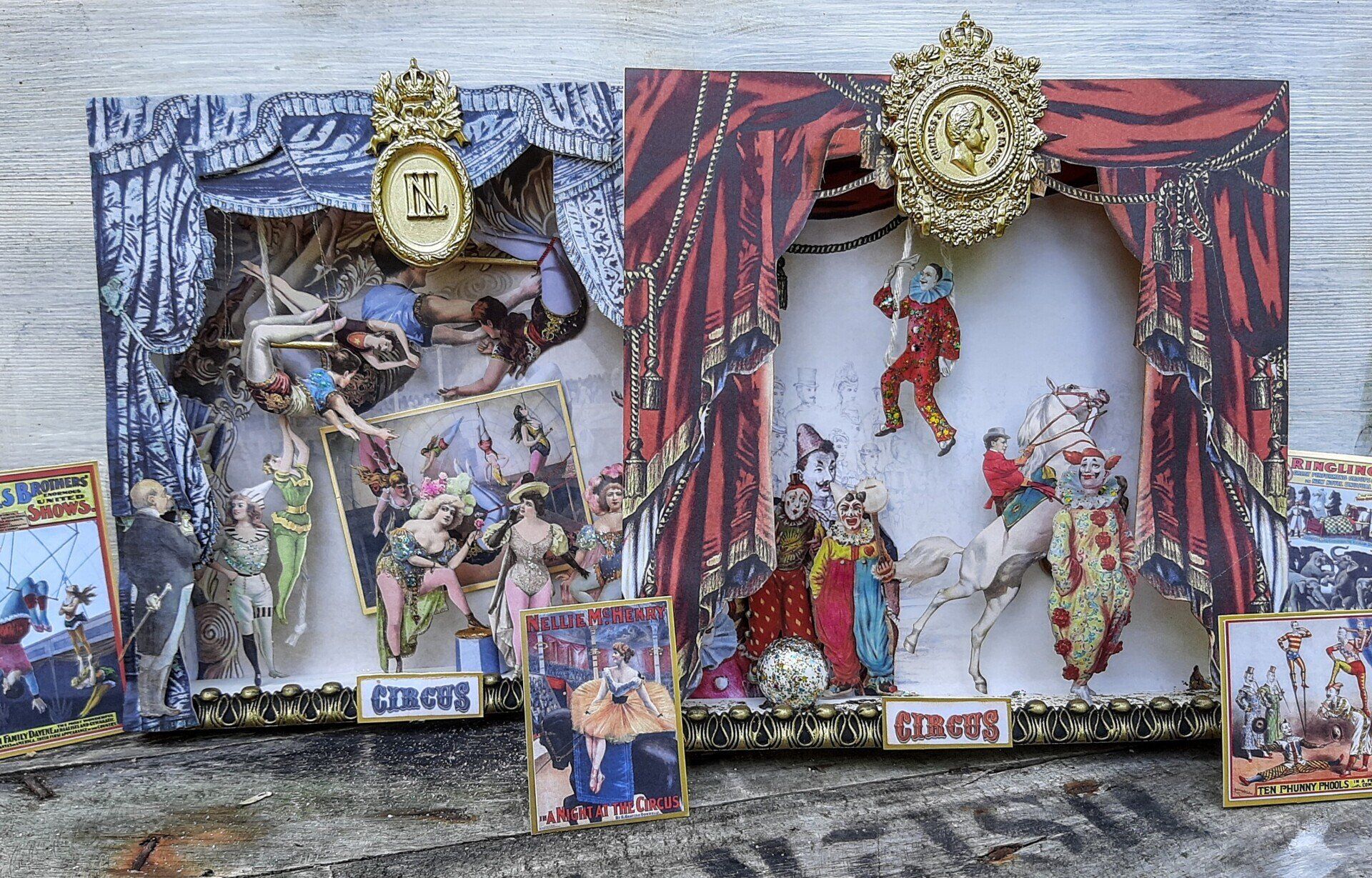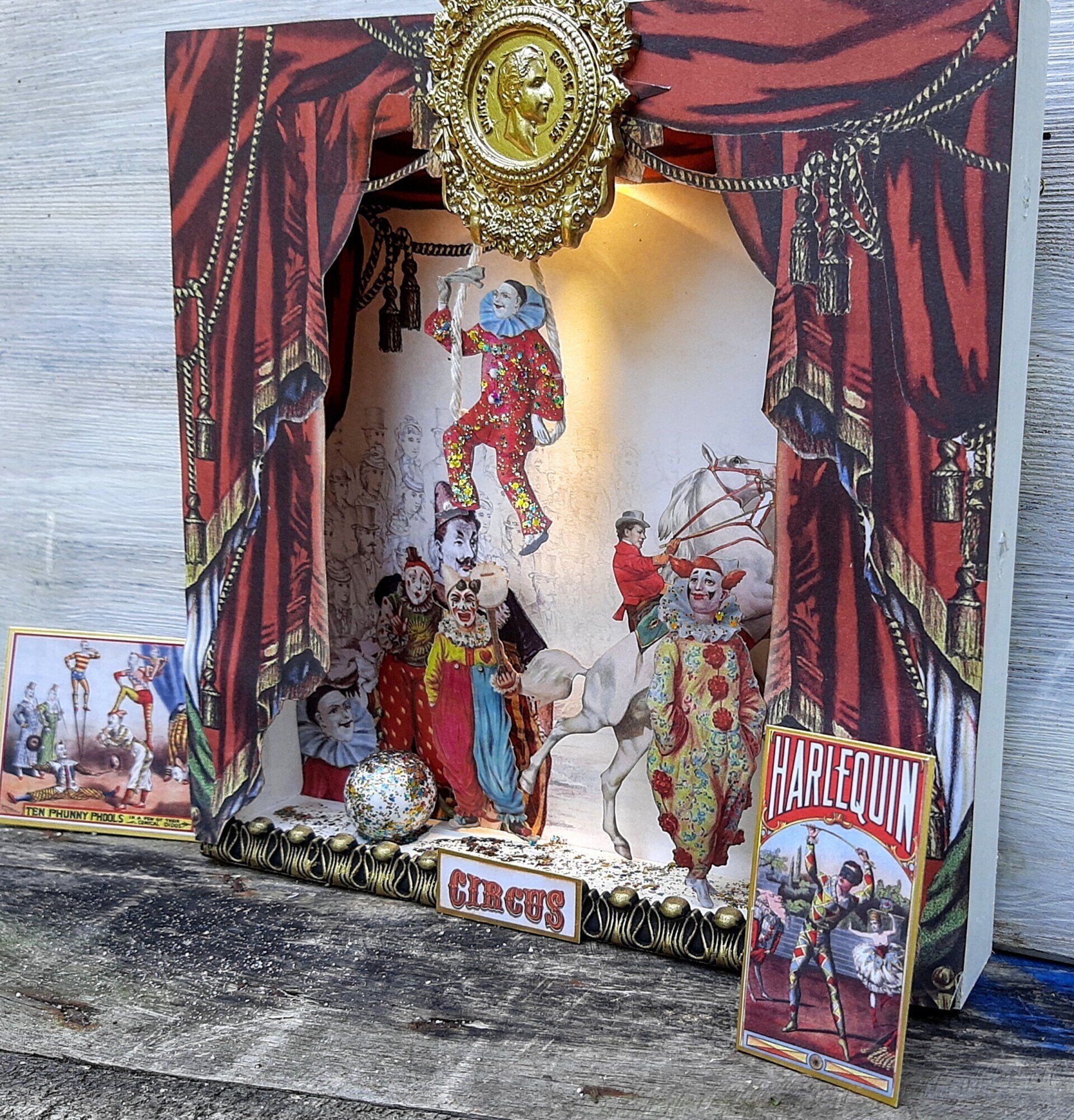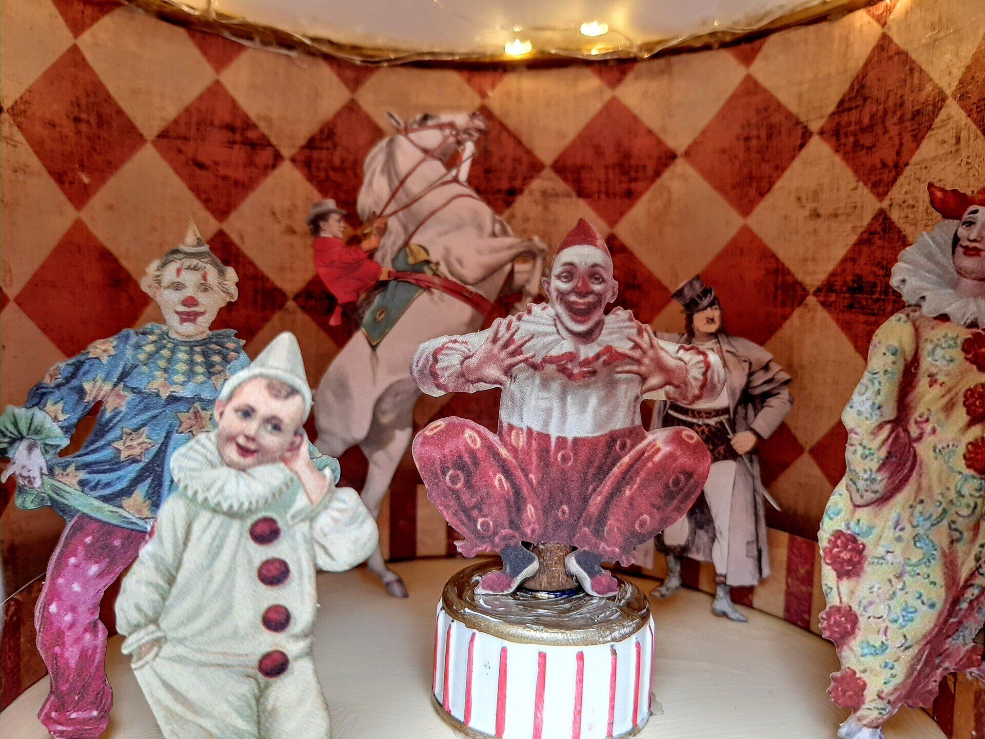 Einmalige Dekoration aus Papier gestaltet. Eine beleuchtete Zirkus manege zum Aufklappen. Ca. 22cm breit und 20cm hoch... 35,-€ auf Anfrage.