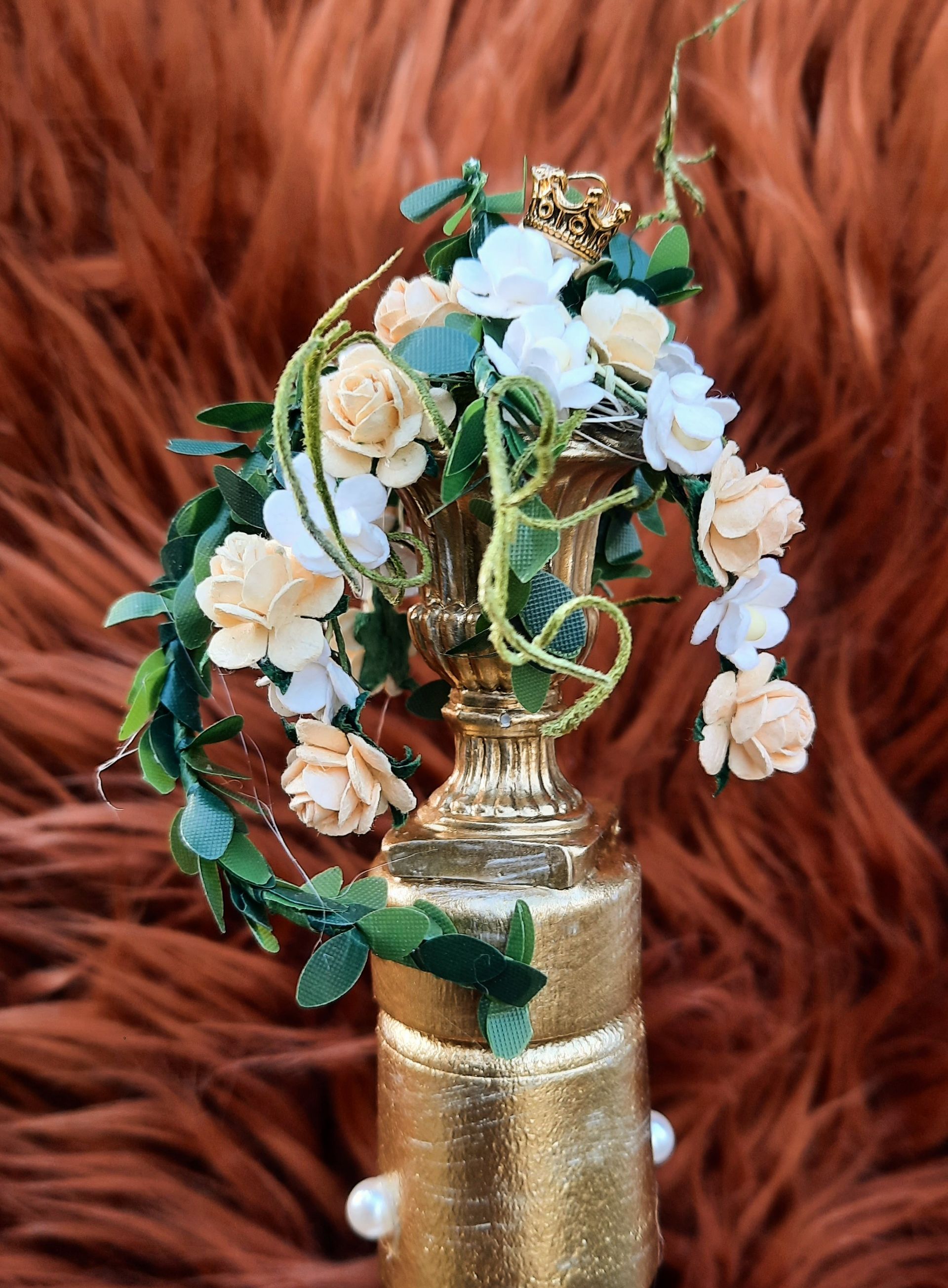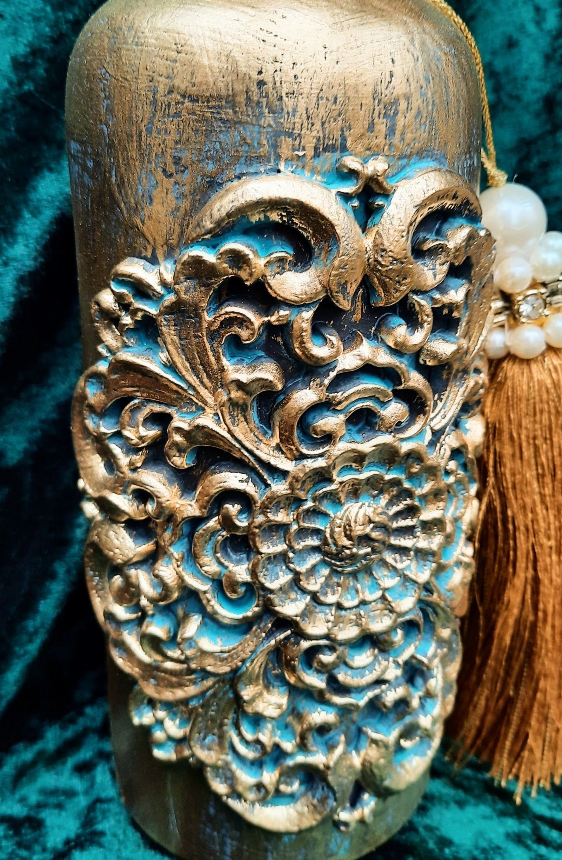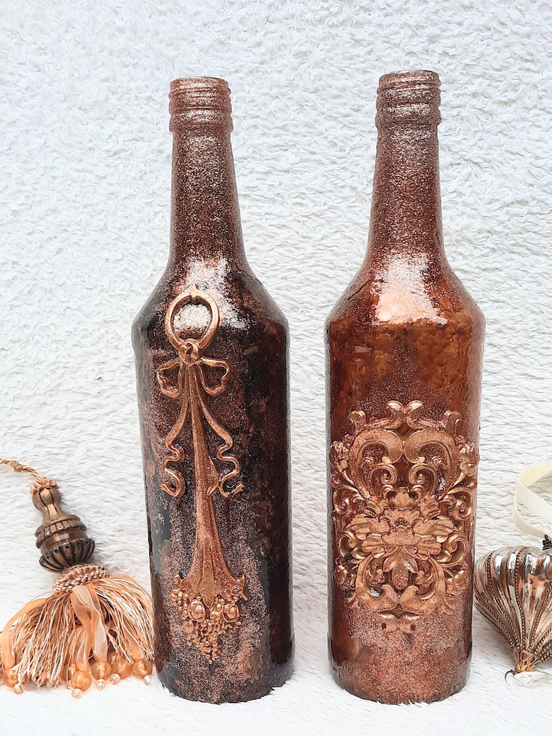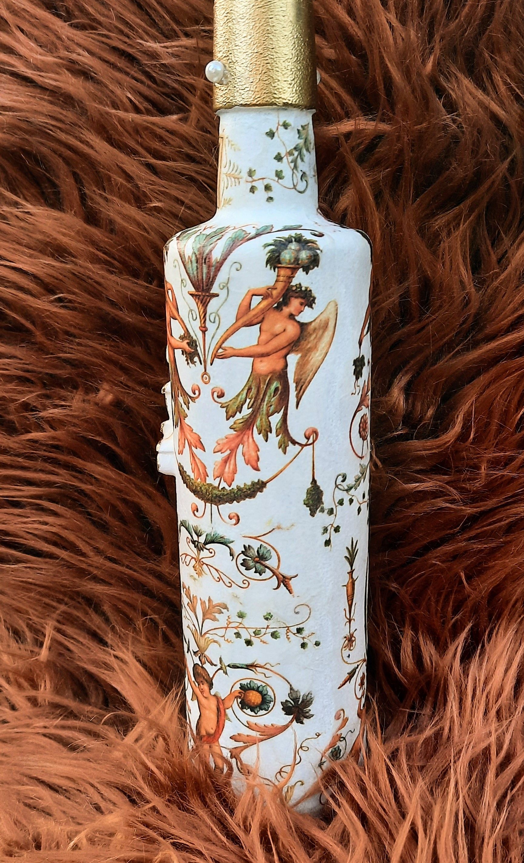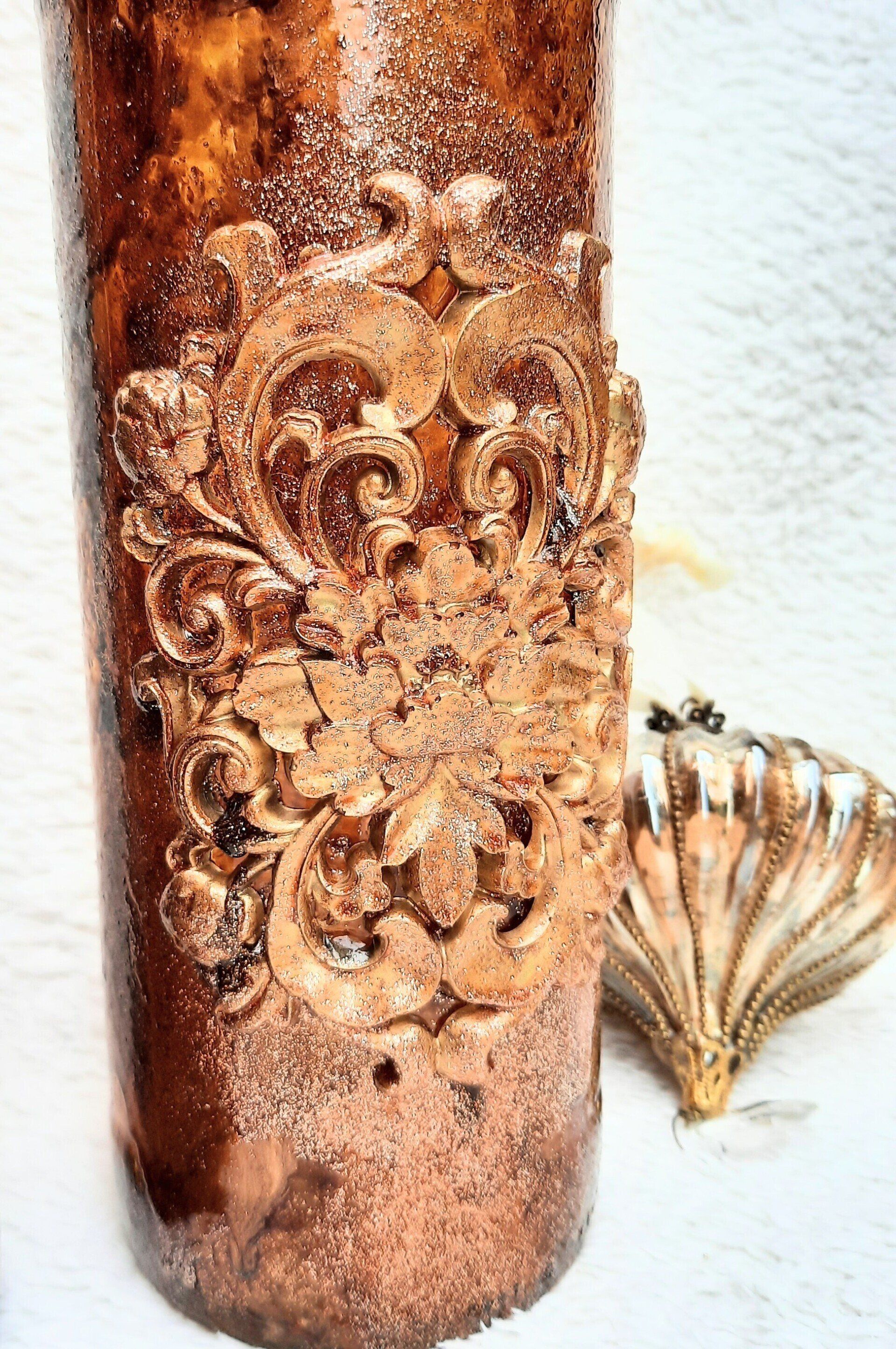 Upcycling einer alten Glasflasche, sehr opulent gestaltet mit einer Amphore auf dem Korken - ca. 37cm hoch - 19,-€ auf Anfrage - Ein Anleitungsvideo gibt es in der Rubrik "Bastelanleitungen / Videos"