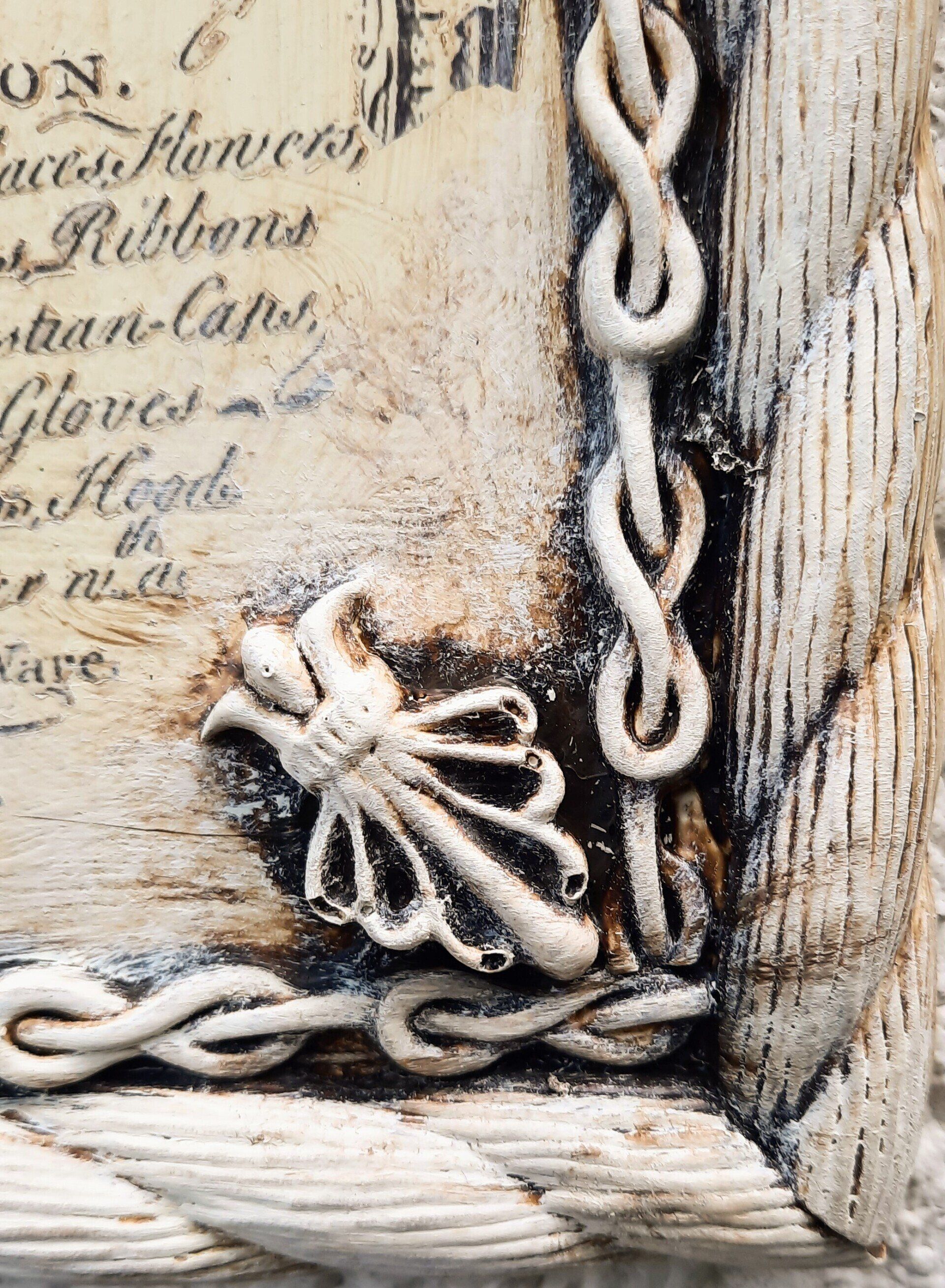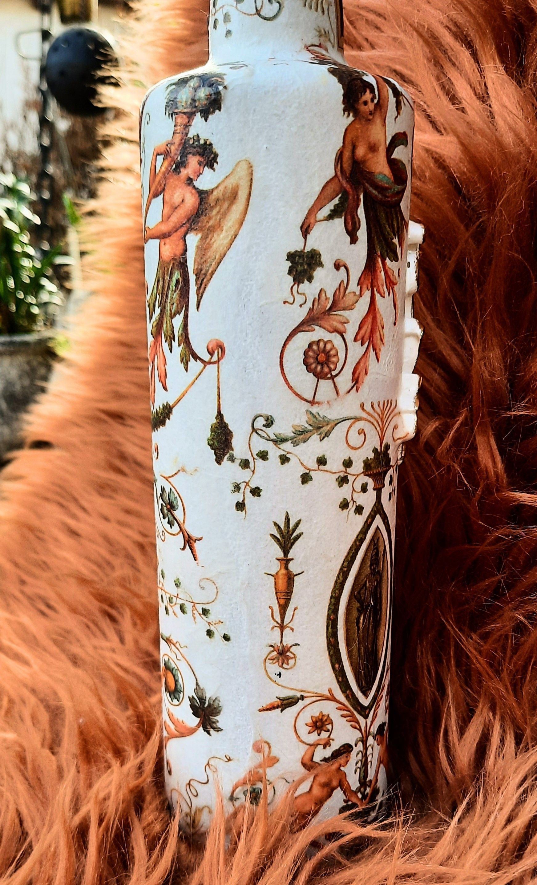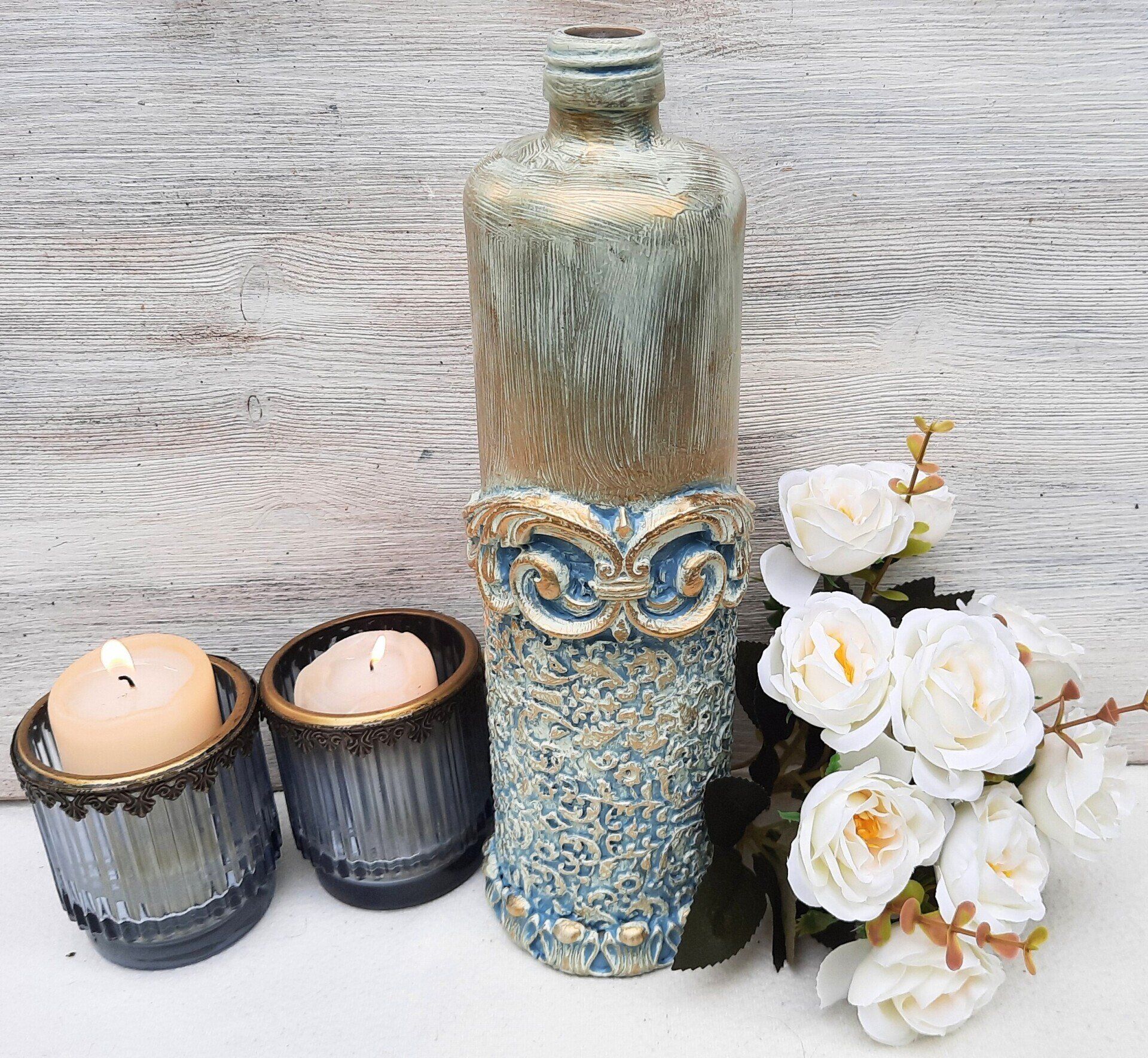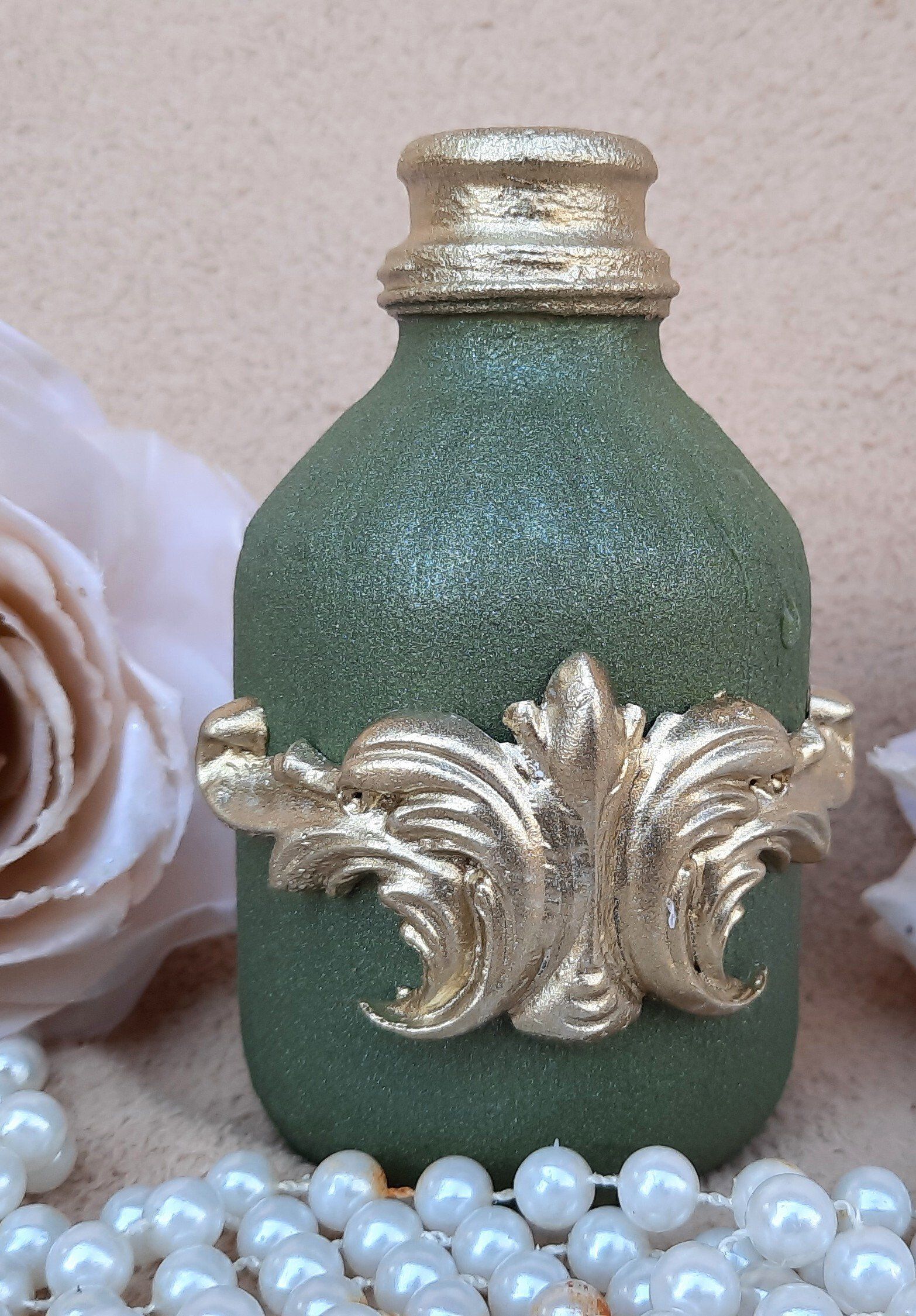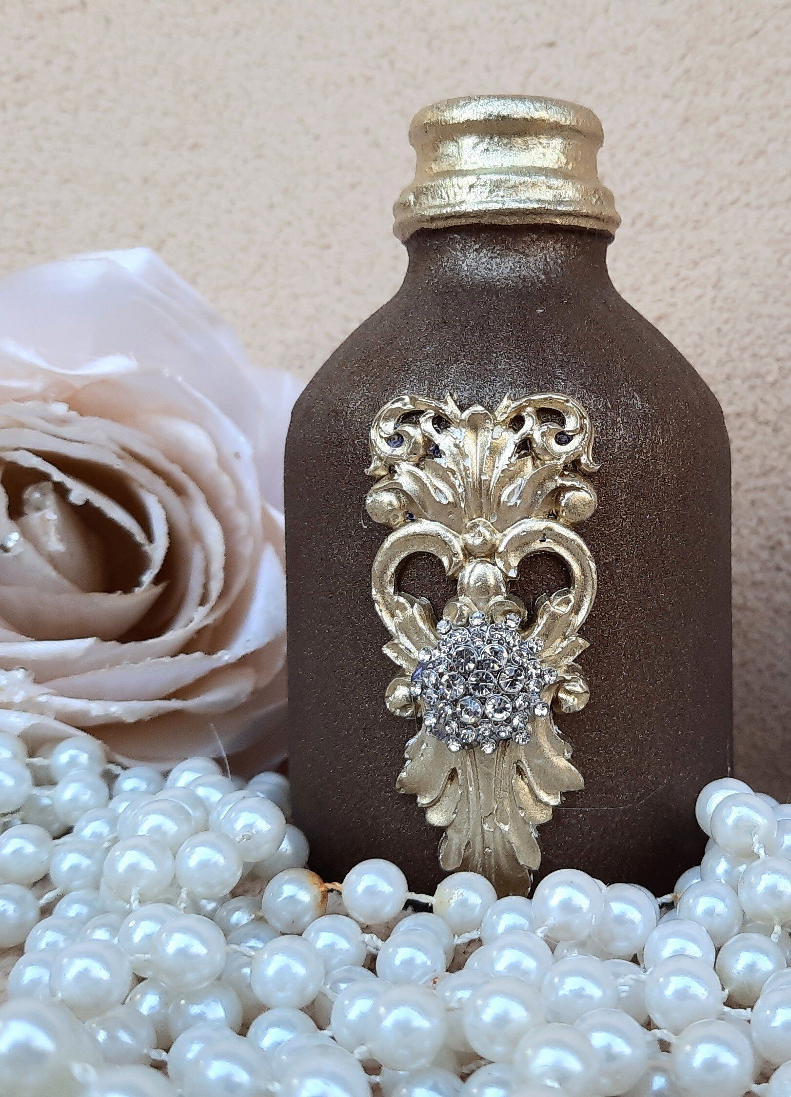 Upcycling einer alten Glasflasche, sehr opulent gestaltet mit einer Amphore auf dem Korken - ca. 37cm hoch - 19,-€ auf Anfrage - Ein Anleitungsvideo gibt es in der Rubrik "Bastelanleitungen / Videos"