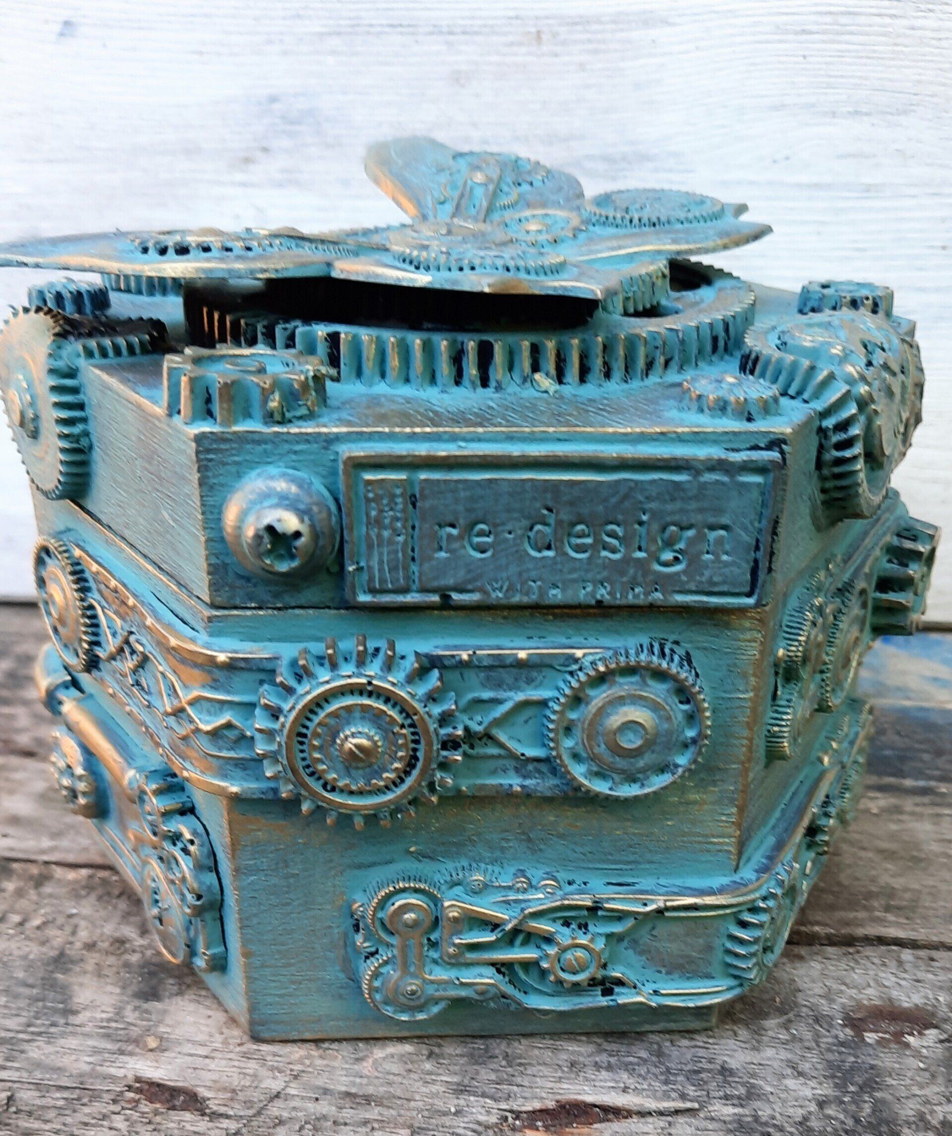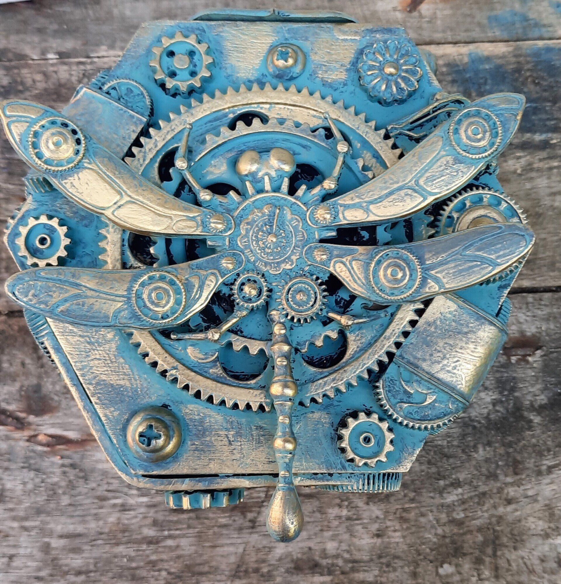 2 Außergewöhnliche, 8eckige Holzdosen im Staeampunk Look - Mechanical Insects - je ca. 14x14cm, 12cm hoch - je 19.50€ auf Anfrage