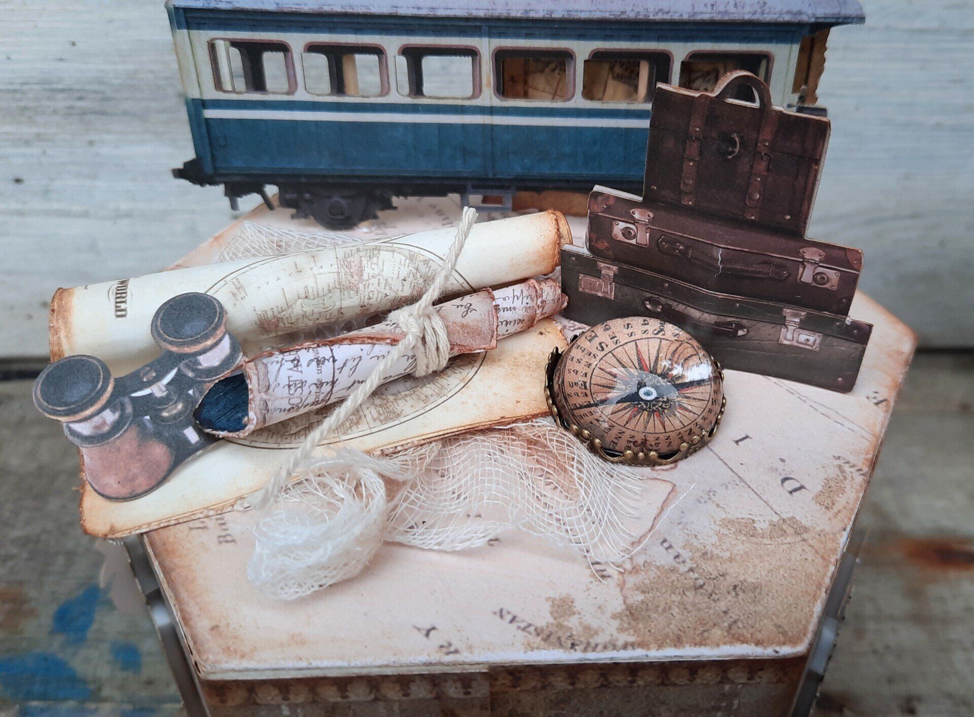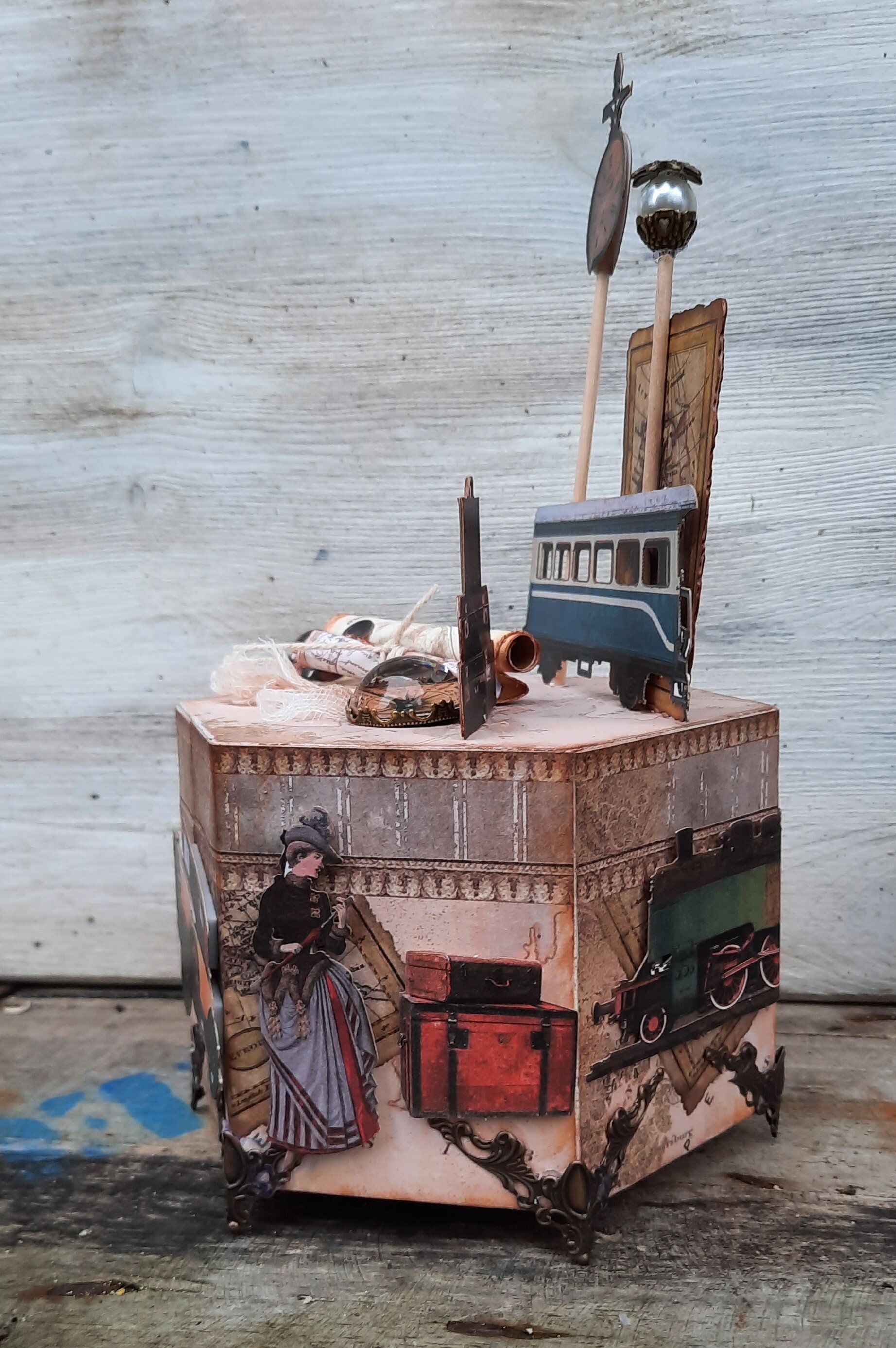 Holzboxen gestaltet mit Papieren "Travel" von LaBlanche, im viktorianischen Stil, ca. 15x15cm, 10cm hoch ( ohne Aufbau) je 19,50€ auf Anfrage - Ein Anleitungsvideo gibt es in der Rubrik "Bastelanleitungen / Videos"