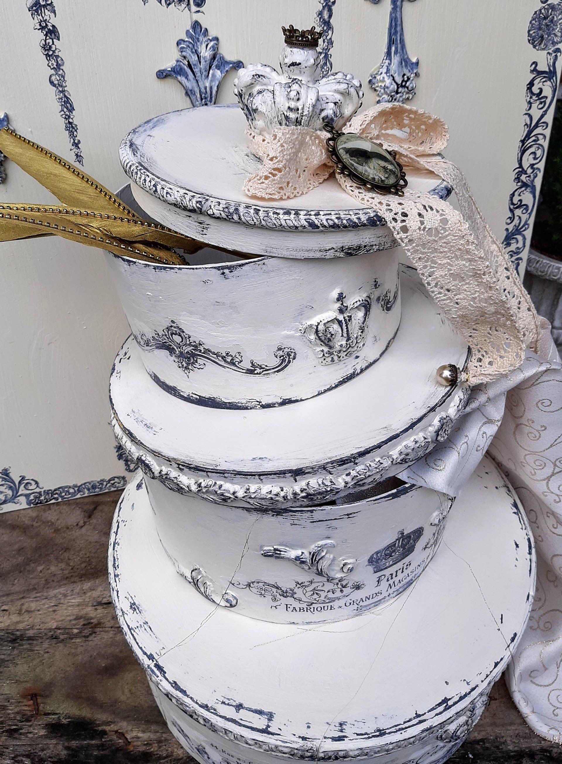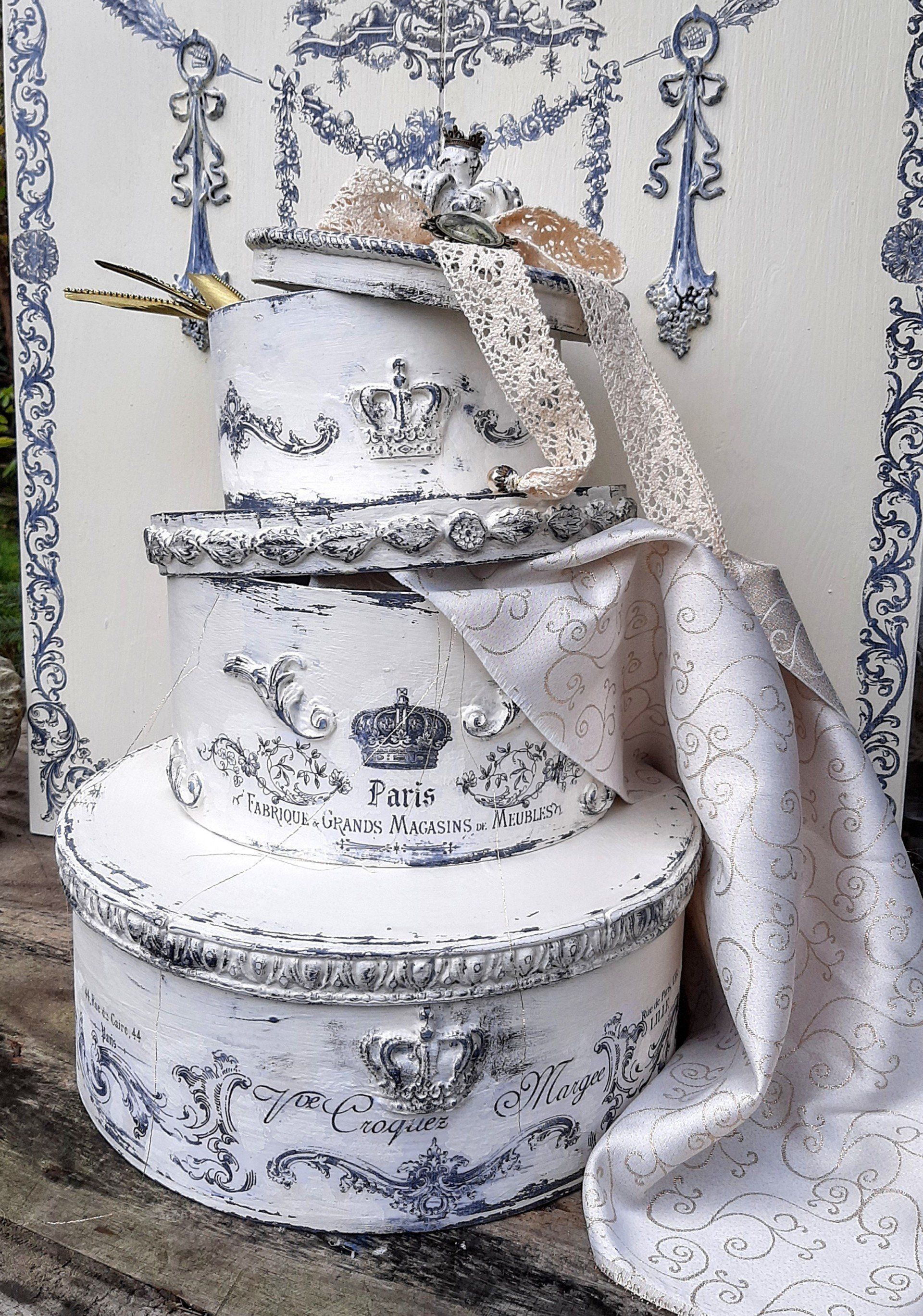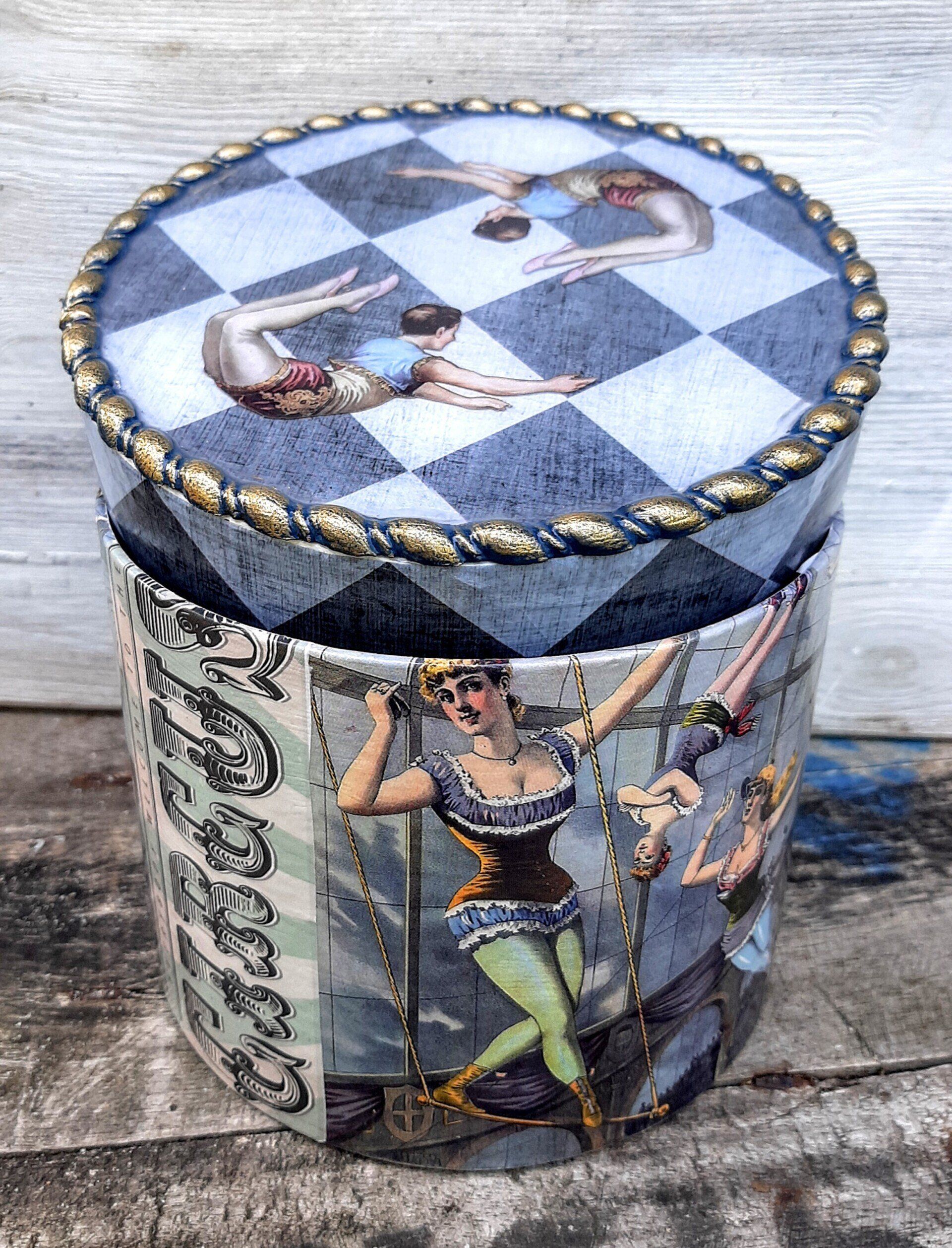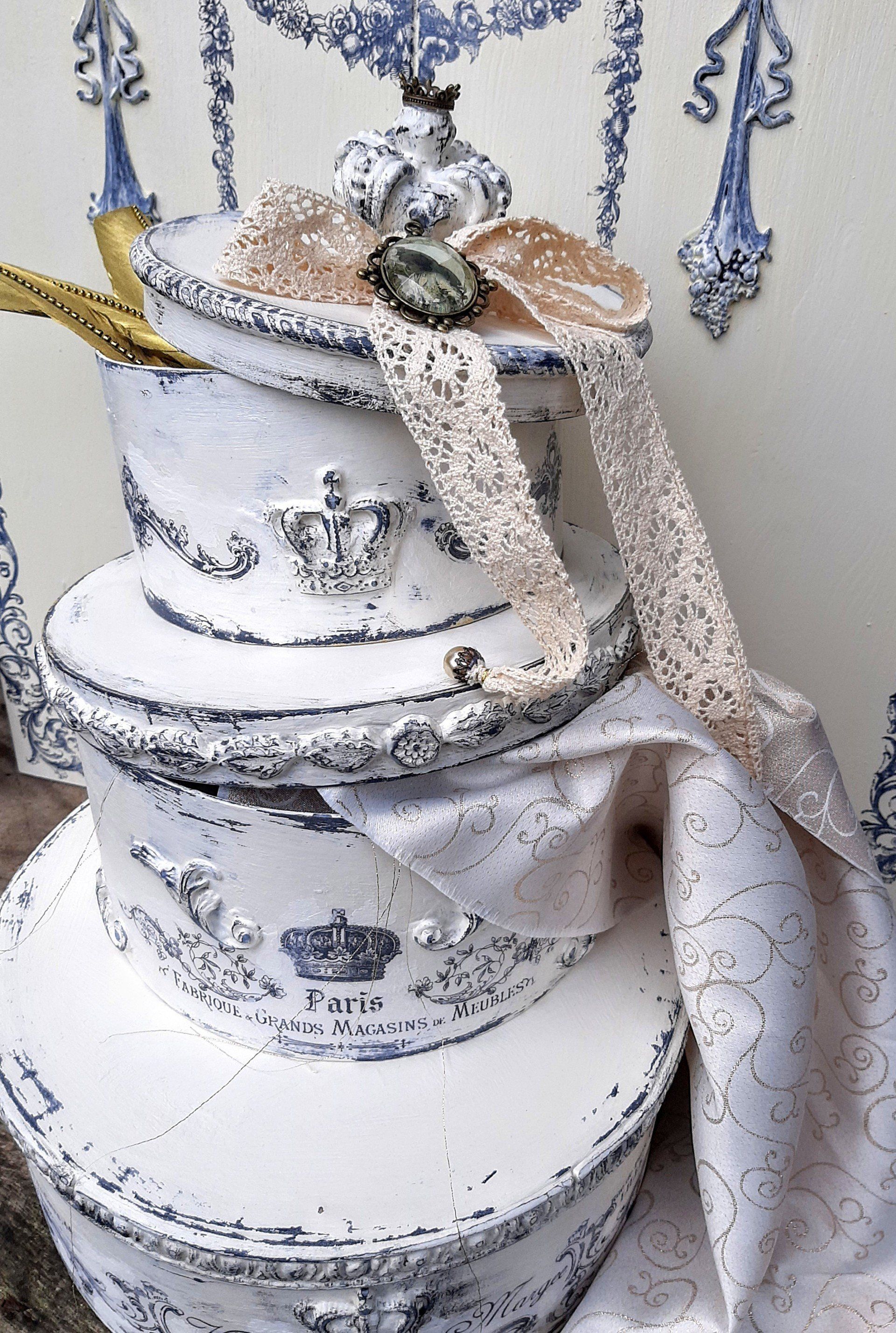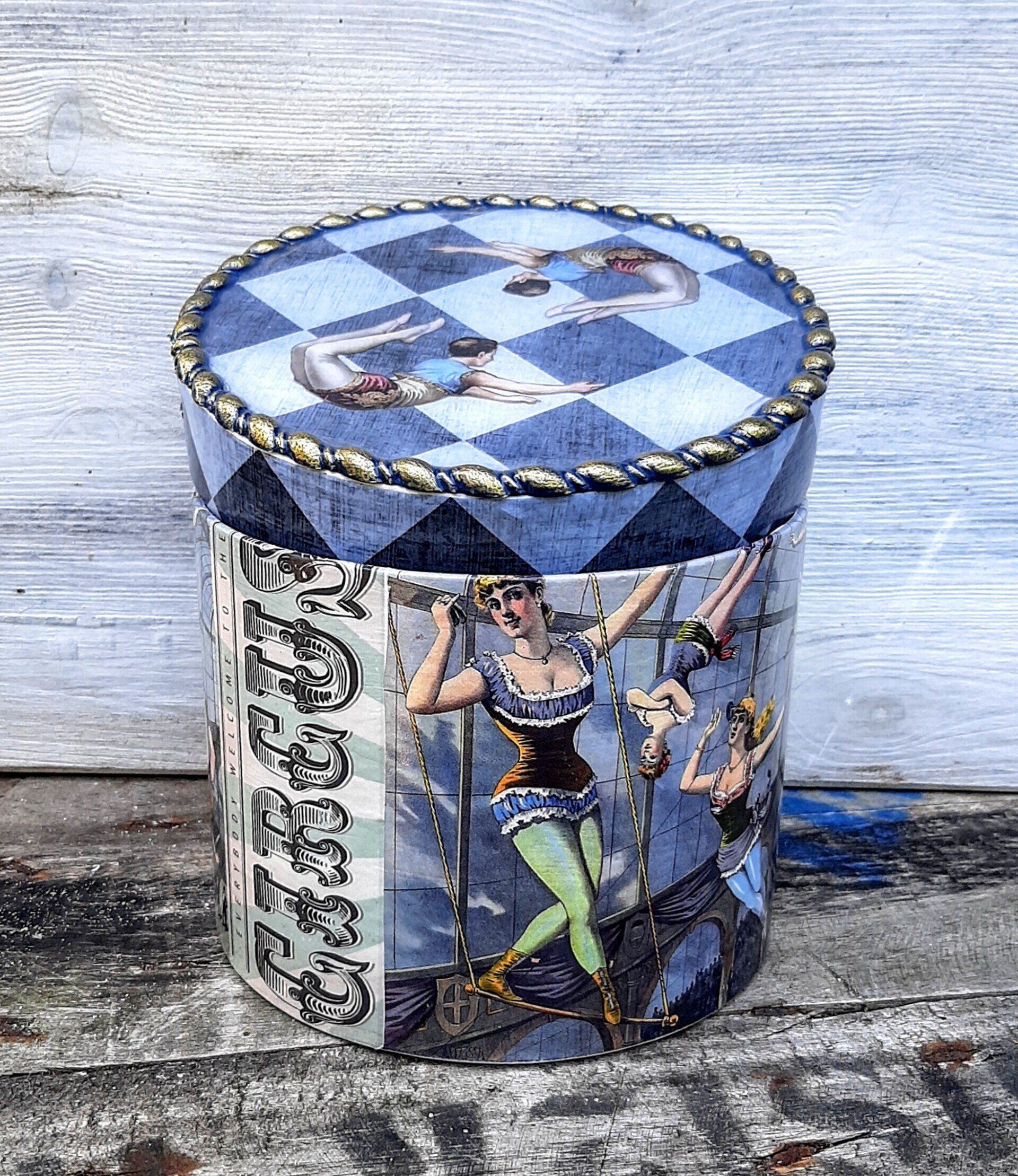 Außergewöhnliches Set Runddosen, mit Decoupagepapier gestaltet, Deckel mit klarem Resin ausgegossen. 16, 18 und 20cm Durchmesser ....zusammen 29,-€ auf Anfrage