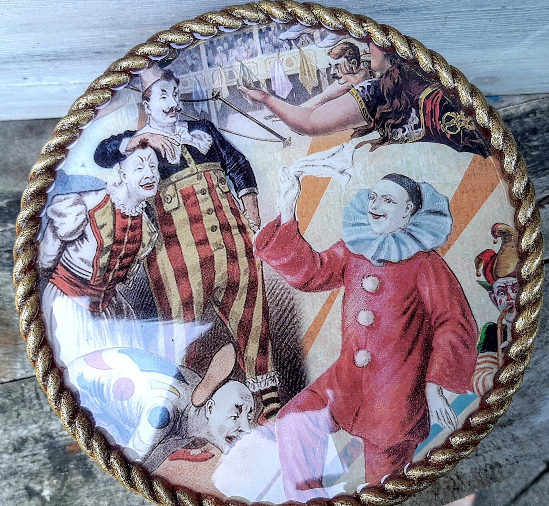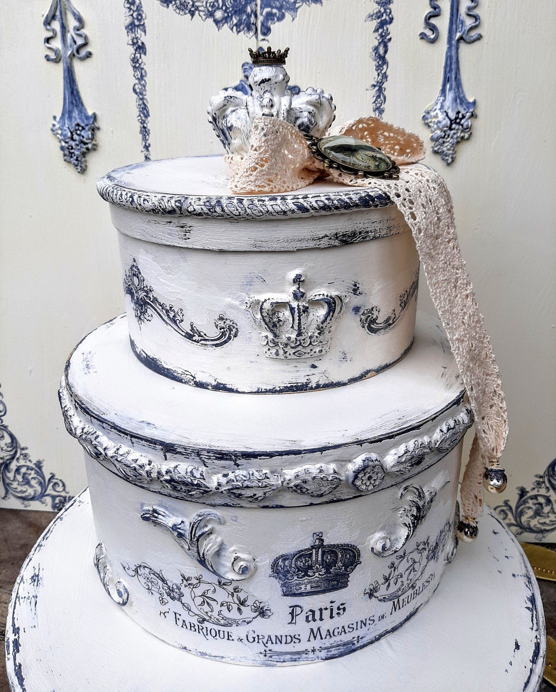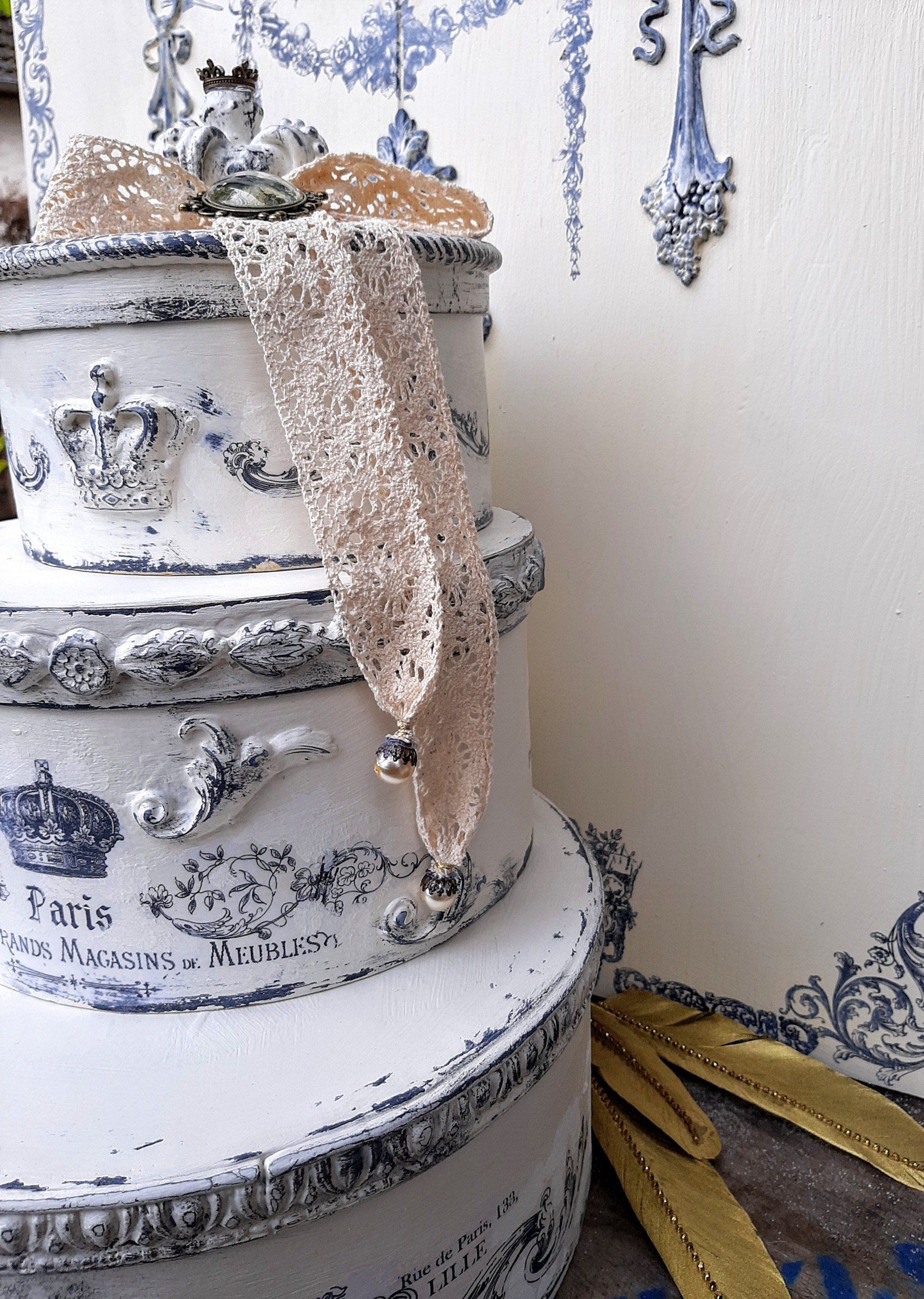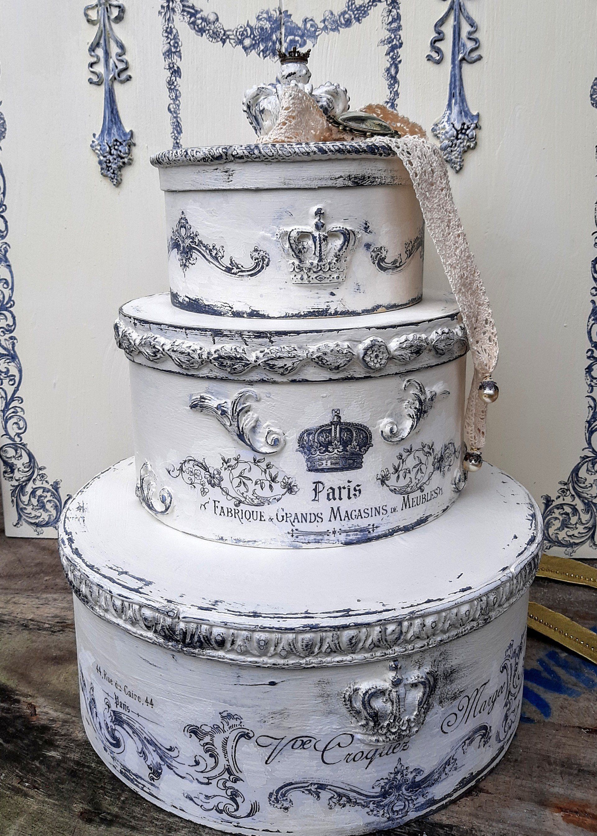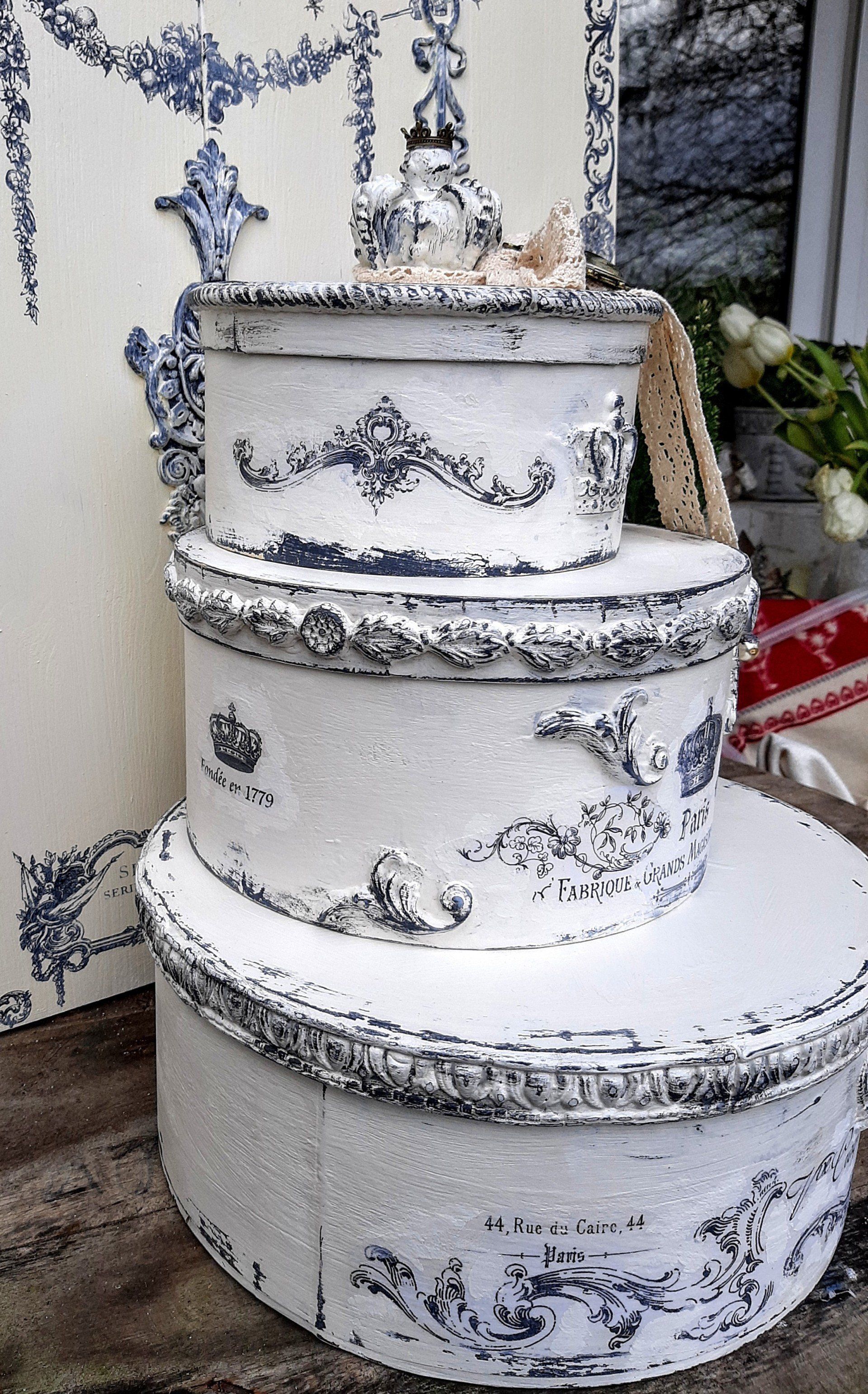 Außergewöhnliches Set Runddosen, mit Decoupagepapier gestaltet, Deckel mit klarem Resin ausgegossen. 16, 18 und 20cm Durchmesser ....zusammen 29,-€ auf Anfrage