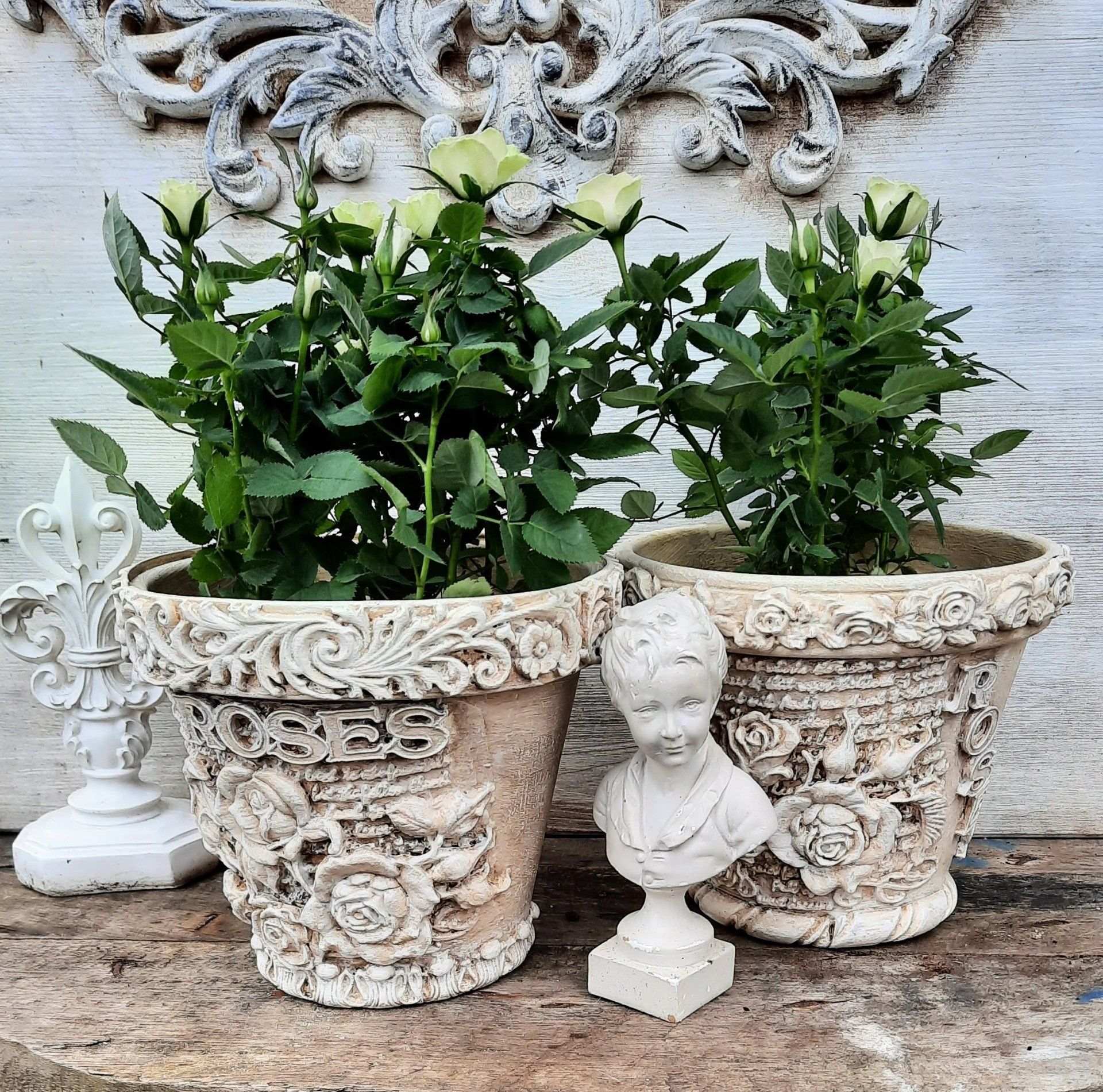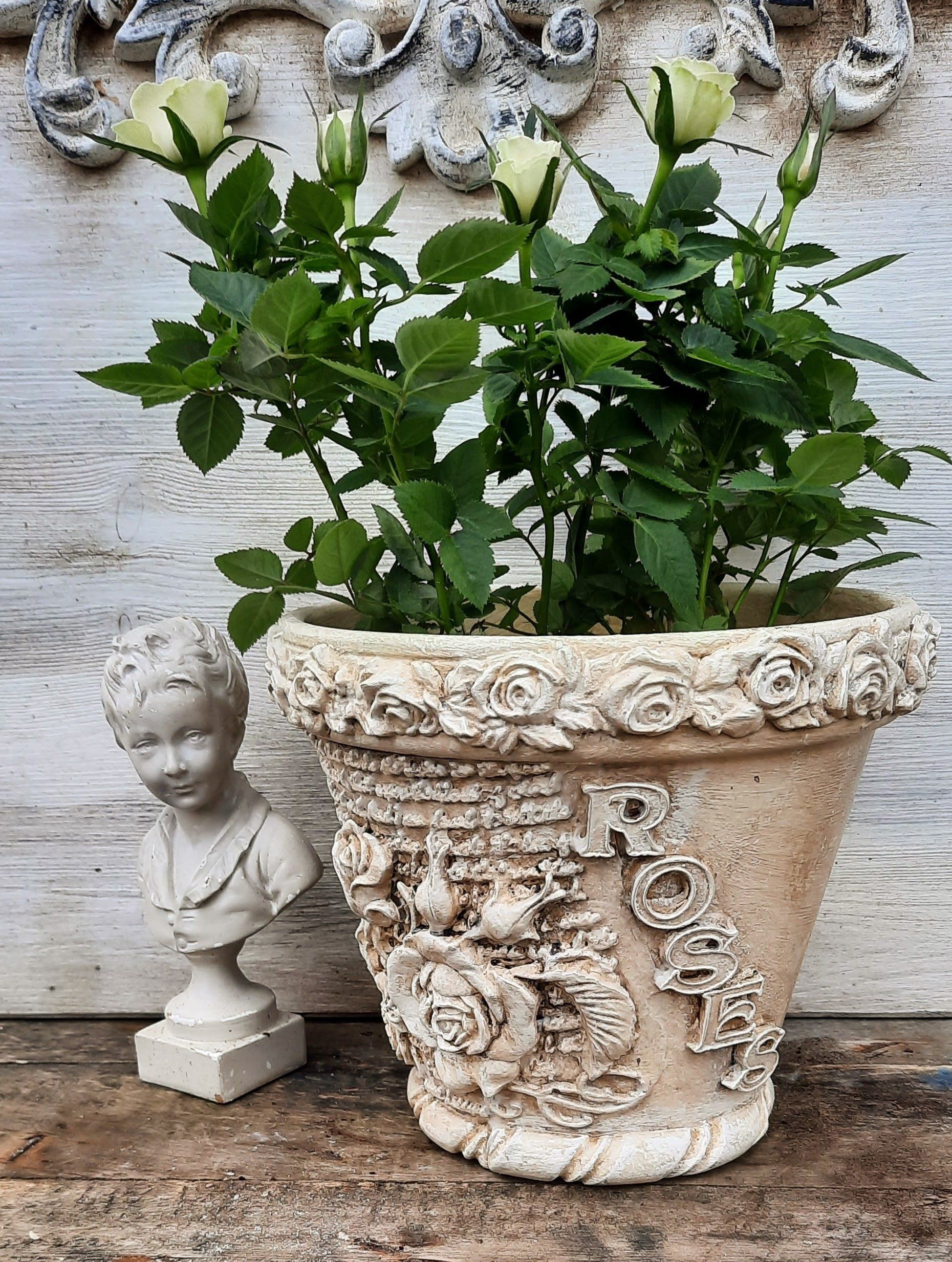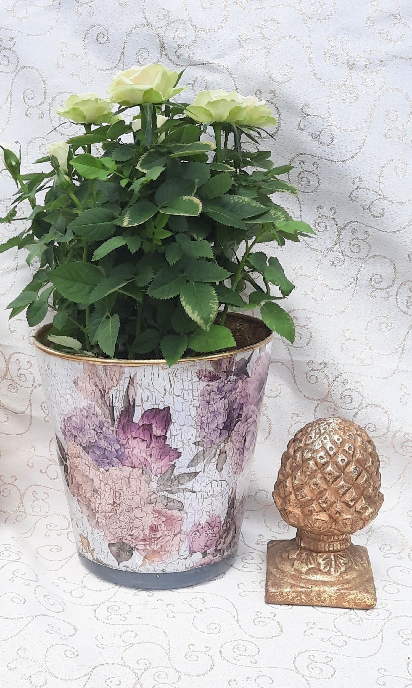 2 romantische Rosentöpfe im shabby Look, sehr aufwändig gearbeitet aus Terrakotta-Töpfen - je ca. 16cm DM, 17cm hoch ....je 17,50€ auf Anfrag --- Ein Anleitungsvideo gibt es in der Rubrik "Bastelanleitungen/Videos"