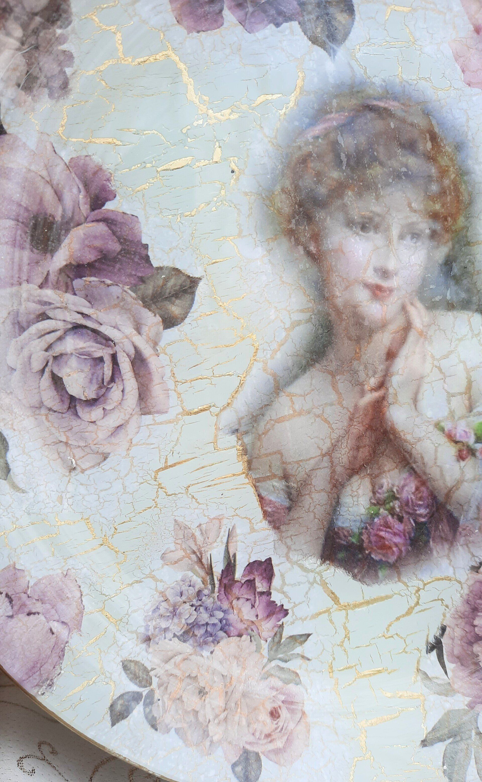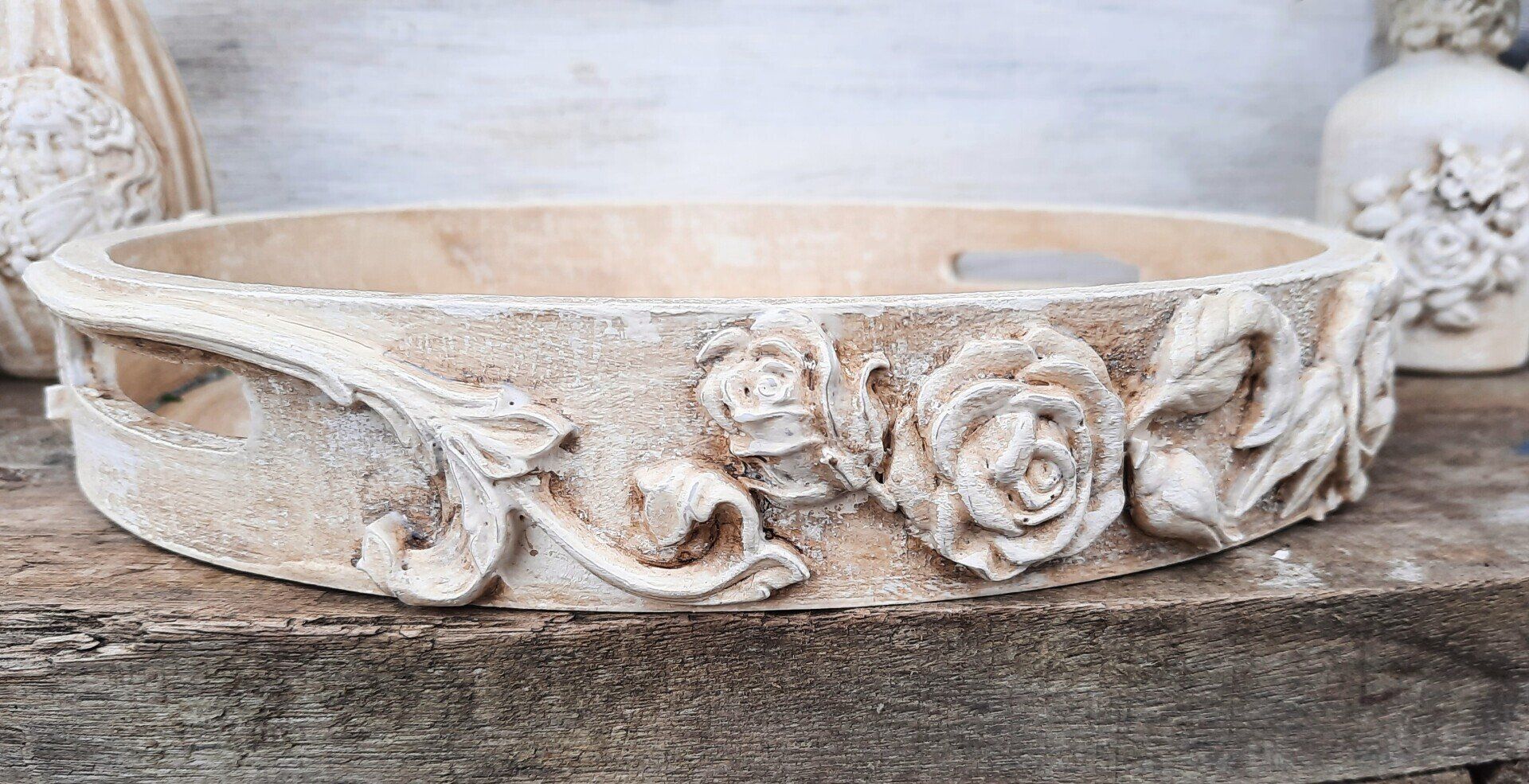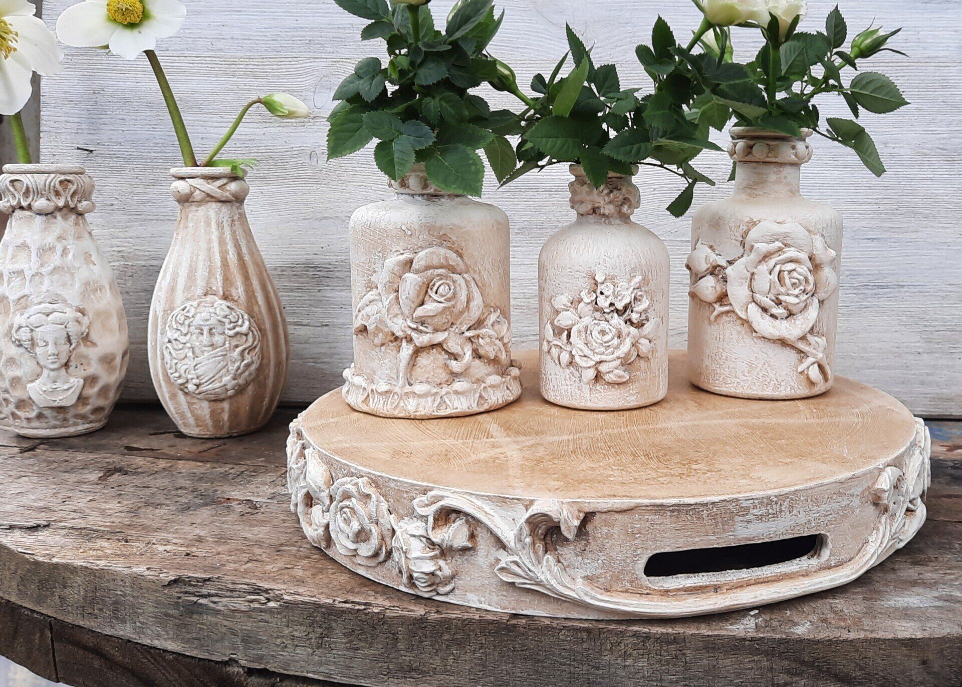 Romantisches Holztablett mit 3 passenden, kleinen Vasen, in der gleichen Technik wie die Rosentöpfe weiter unten. Ca. 32cm DM ---19,50€ auf Anfrage --- Ein Anleitungsvideo gibt es in der Rubrik "Bastelanleitungen/Videos"