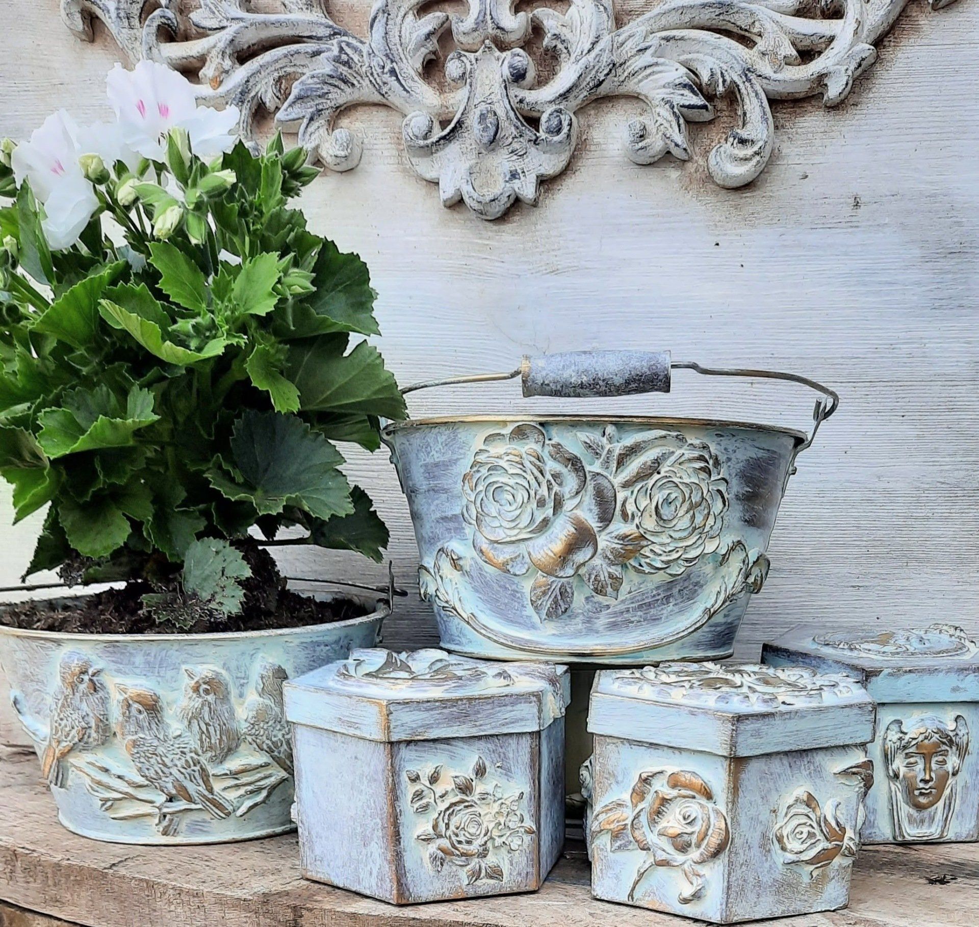 Zinktöpfe und 6-eckige Dosen aufwändig im Shabby Look gestaltet. Die Zinktöpfe sind ca. 20cm im DM, je 12,-€ ....die kleinen Dosen sind ca.12cm im DM je 9,50€ auf Anfrage - Ein Anleitungsvideo gibt es in der Rubrik "Bastelanleitungen/Videos"